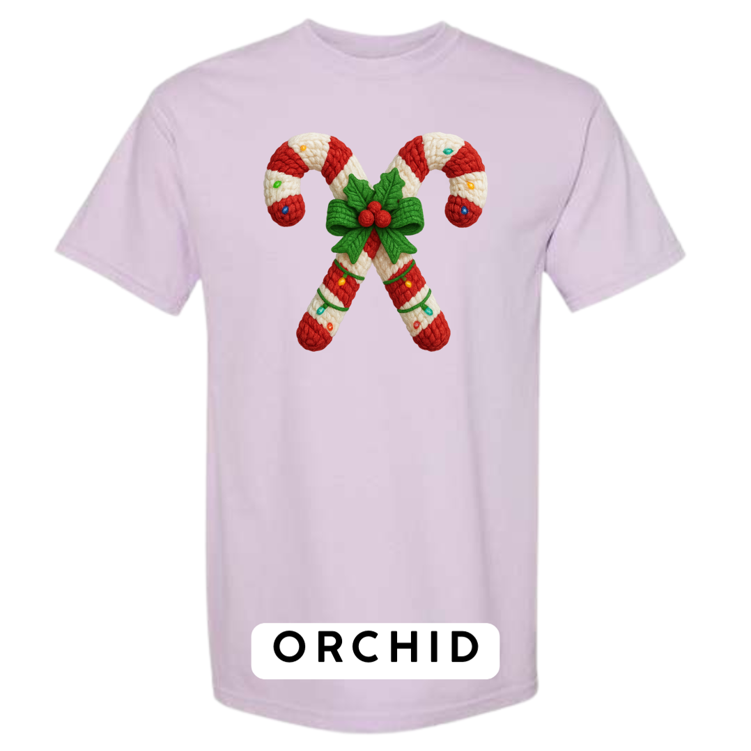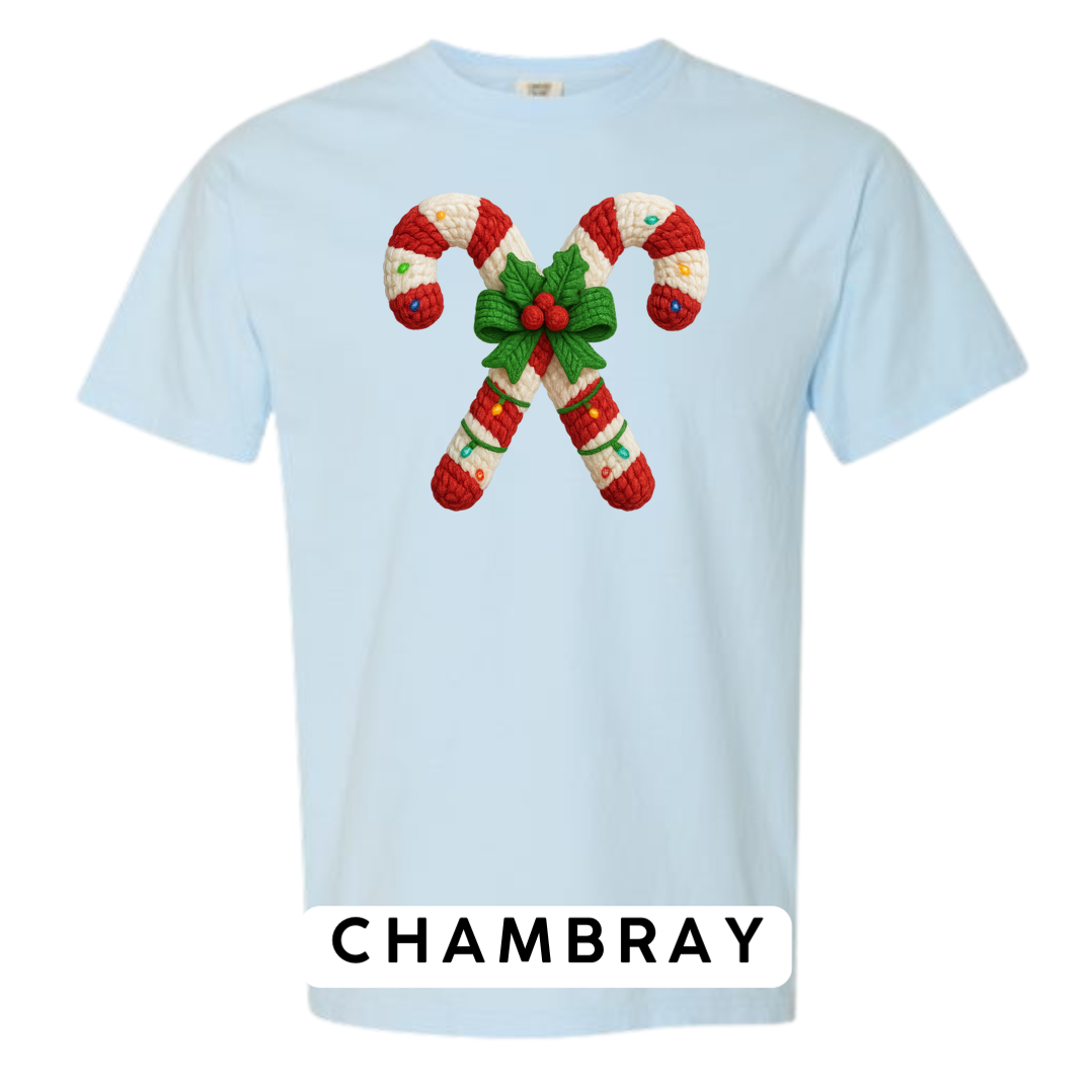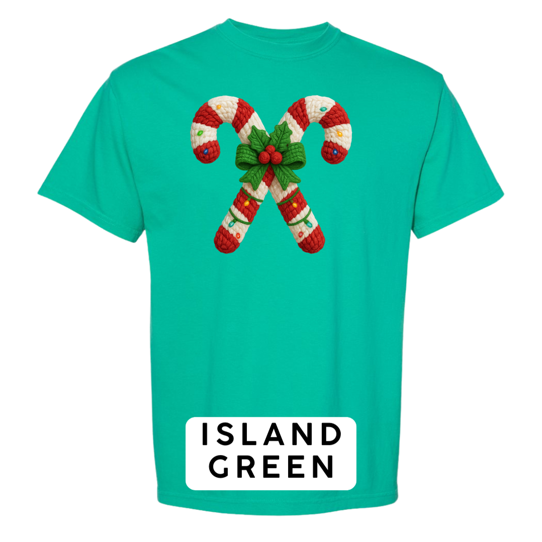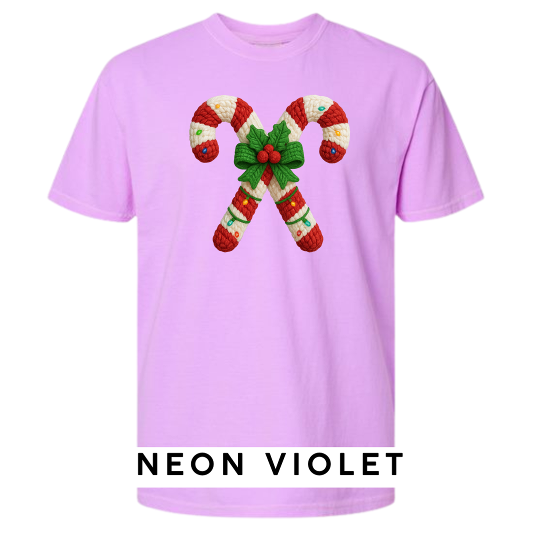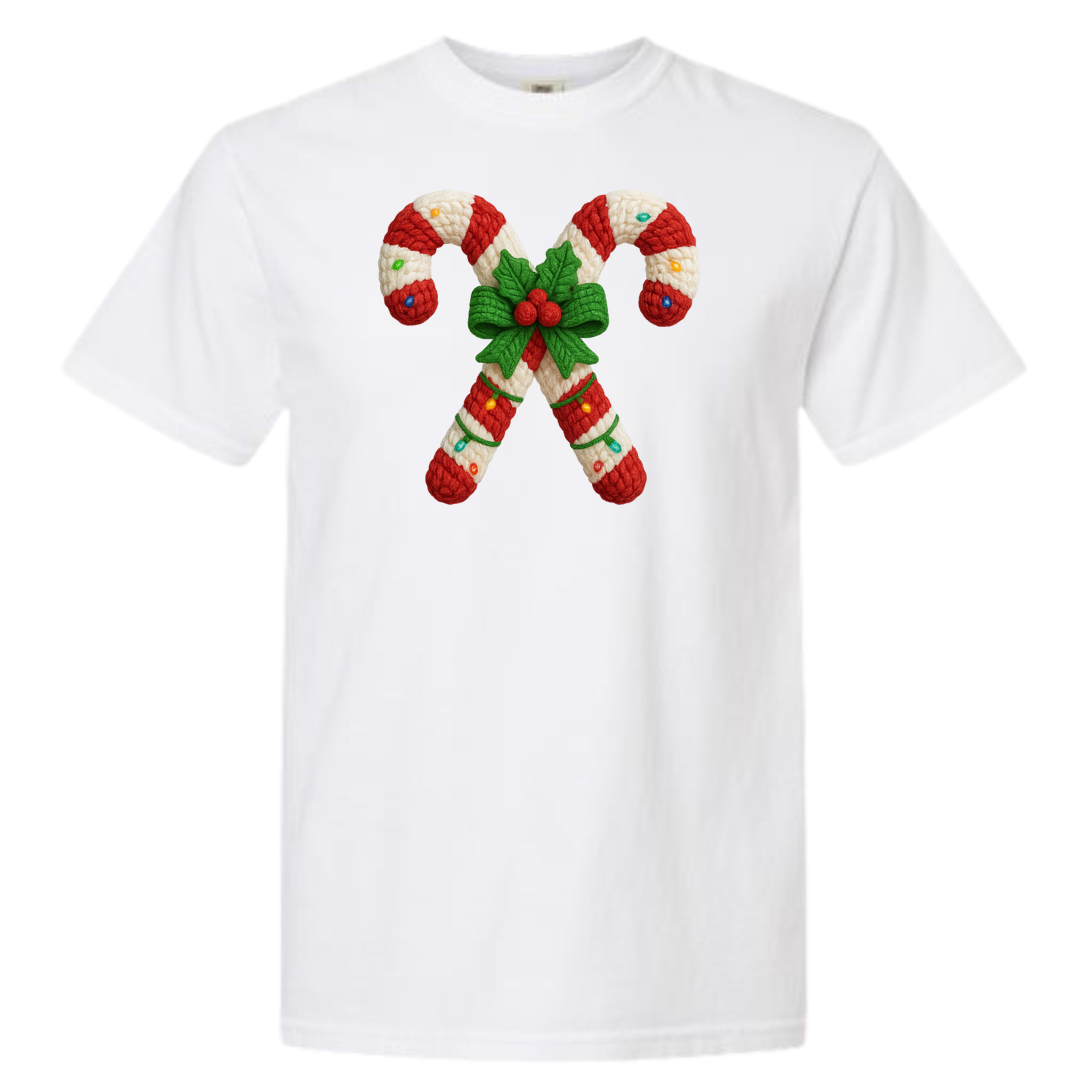 Sweeten your holiday lineup with this charming double candy cane design! Styled to look hand-knit with cozy yarn textures, wrapped in colorful Christmas lights, and topped with a bold green bow—this artwork is a warm and whimsical addition to any holiday apparel or accessory.