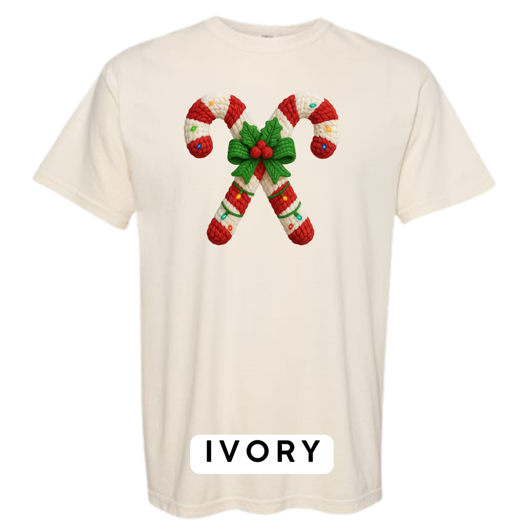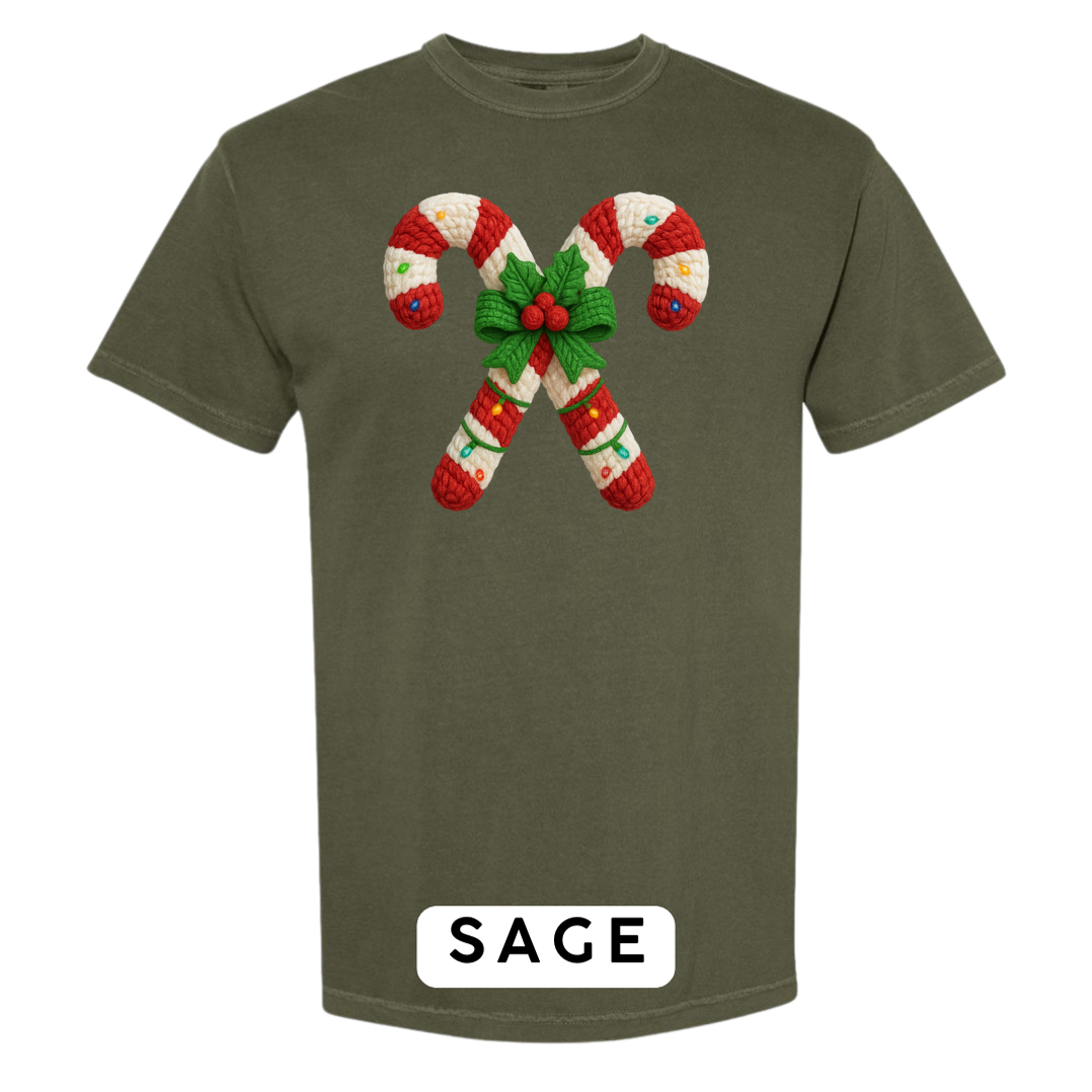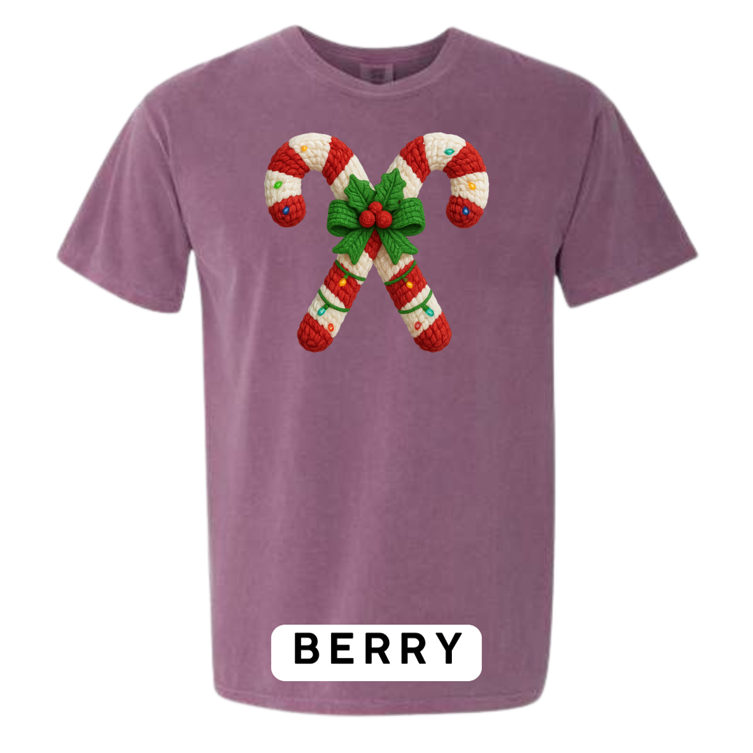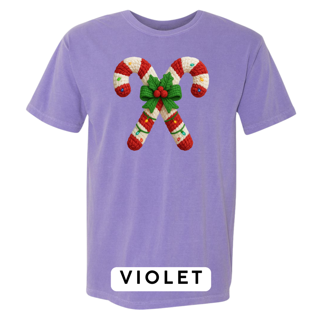 Sweeten your holiday lineup with this charming double candy cane design! Styled to look hand-knit with cozy yarn textures, wrapped in colorful Christmas lights, and topped with a bold green bow—this artwork is a warm and whimsical addition to any holiday apparel or accessory.