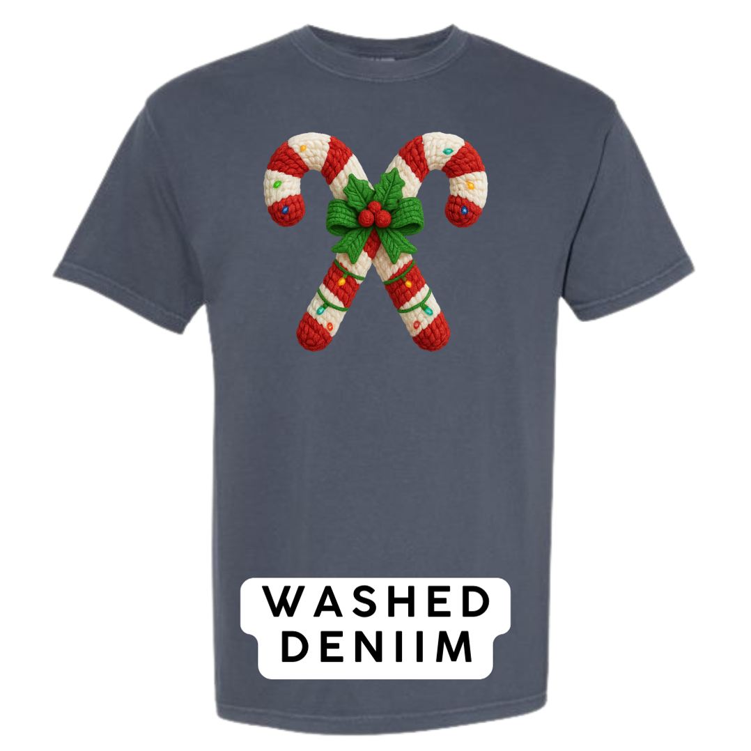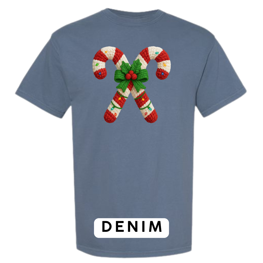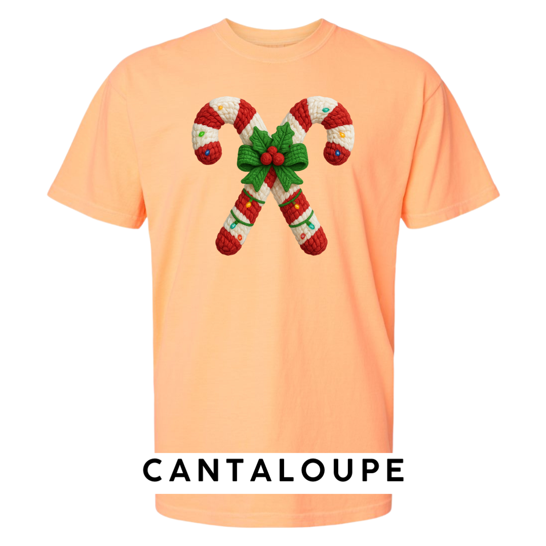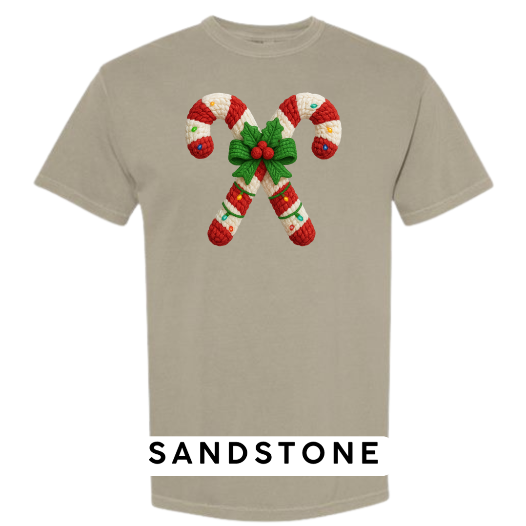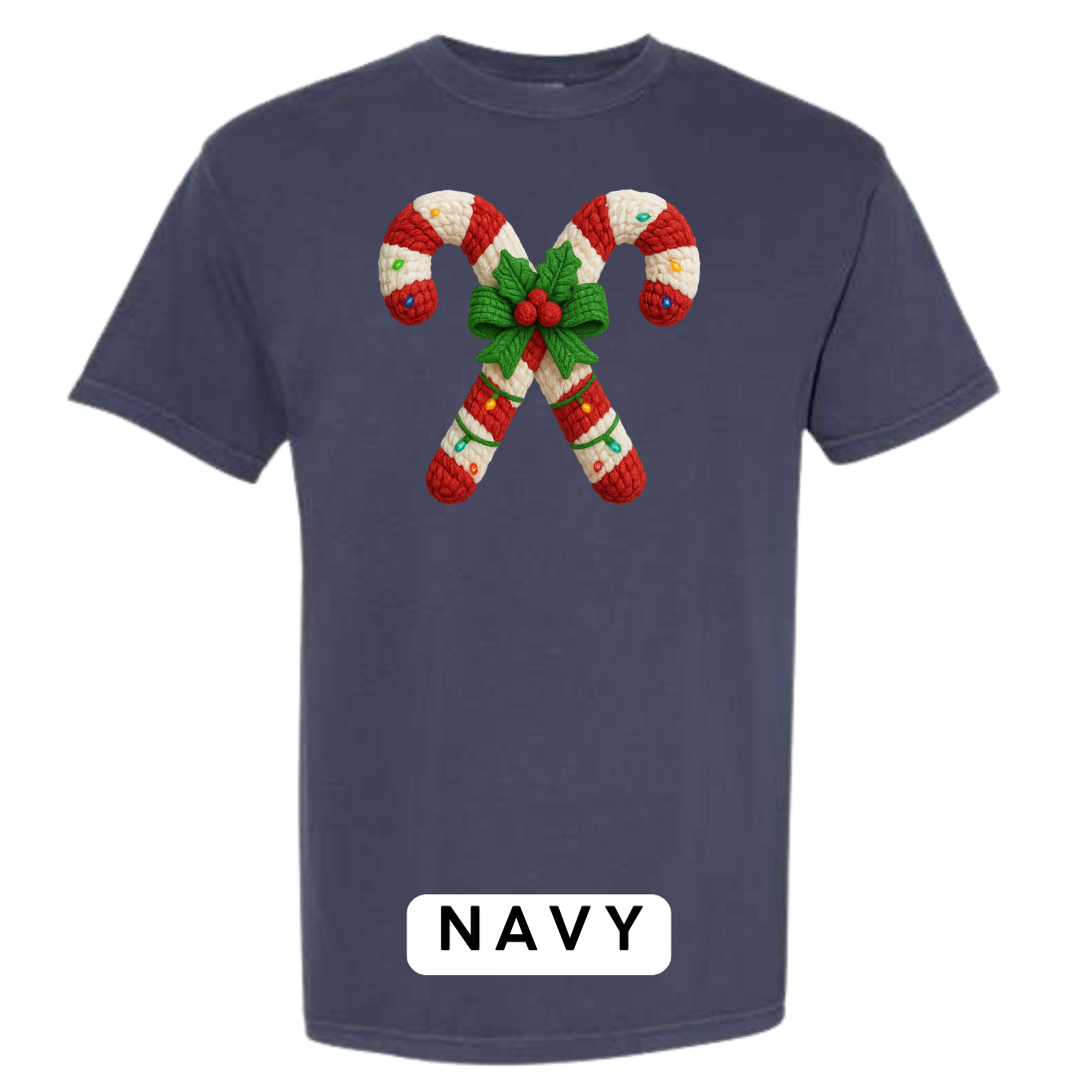 Sweeten your holiday lineup with this charming double candy cane design! Styled to look hand-knit with cozy yarn textures, wrapped in colorful Christmas lights, and topped with a bold green bow—this artwork is a warm and whimsical addition to any holiday apparel or accessory.