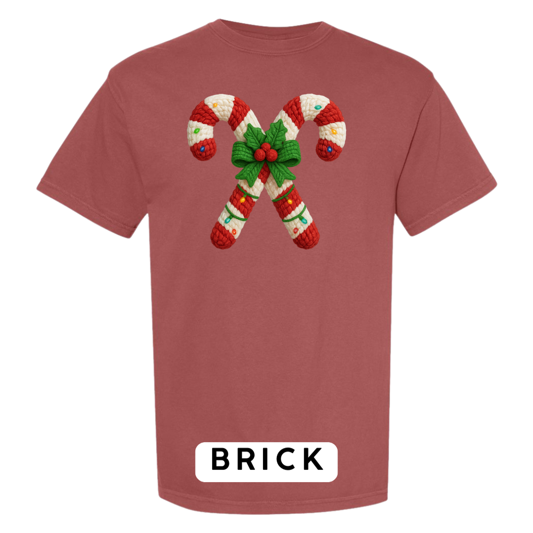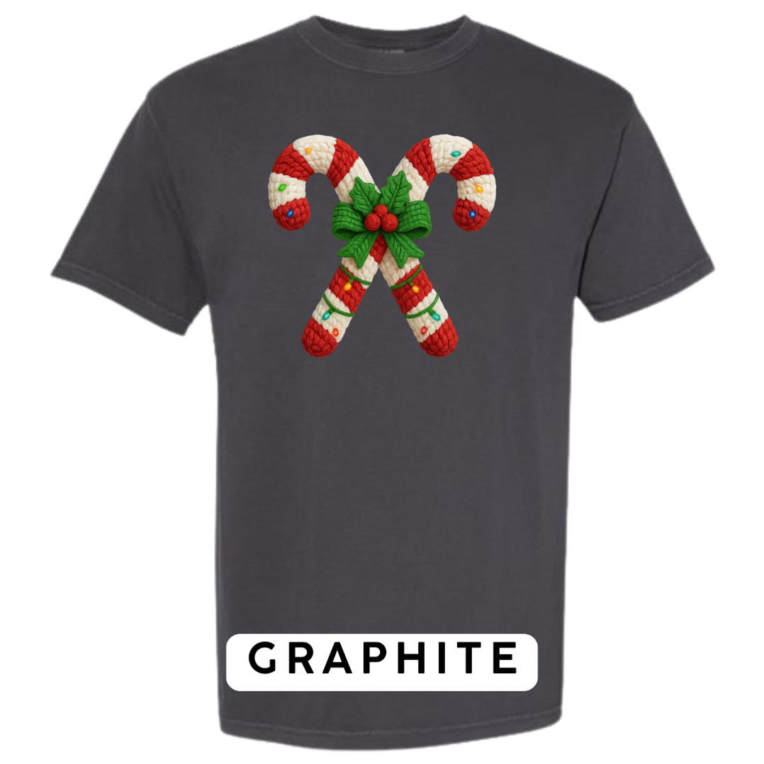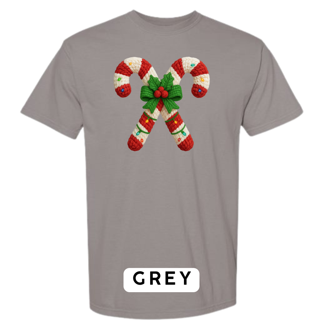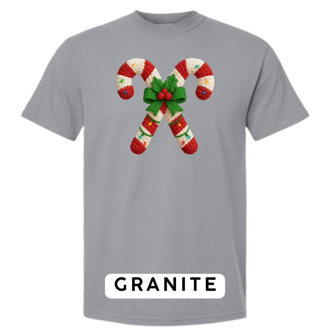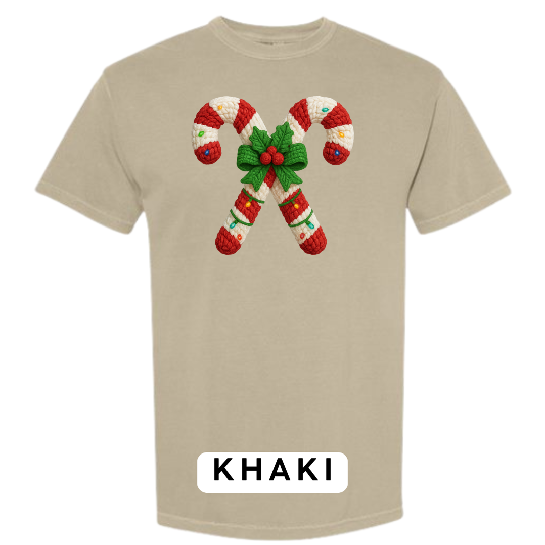 Sweeten your holiday lineup with this charming double candy cane design! Styled to look hand-knit with cozy yarn textures, wrapped in colorful Christmas lights, and topped with a bold green bow—this artwork is a warm and whimsical addition to any holiday apparel or accessory.