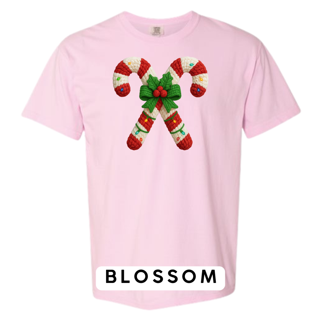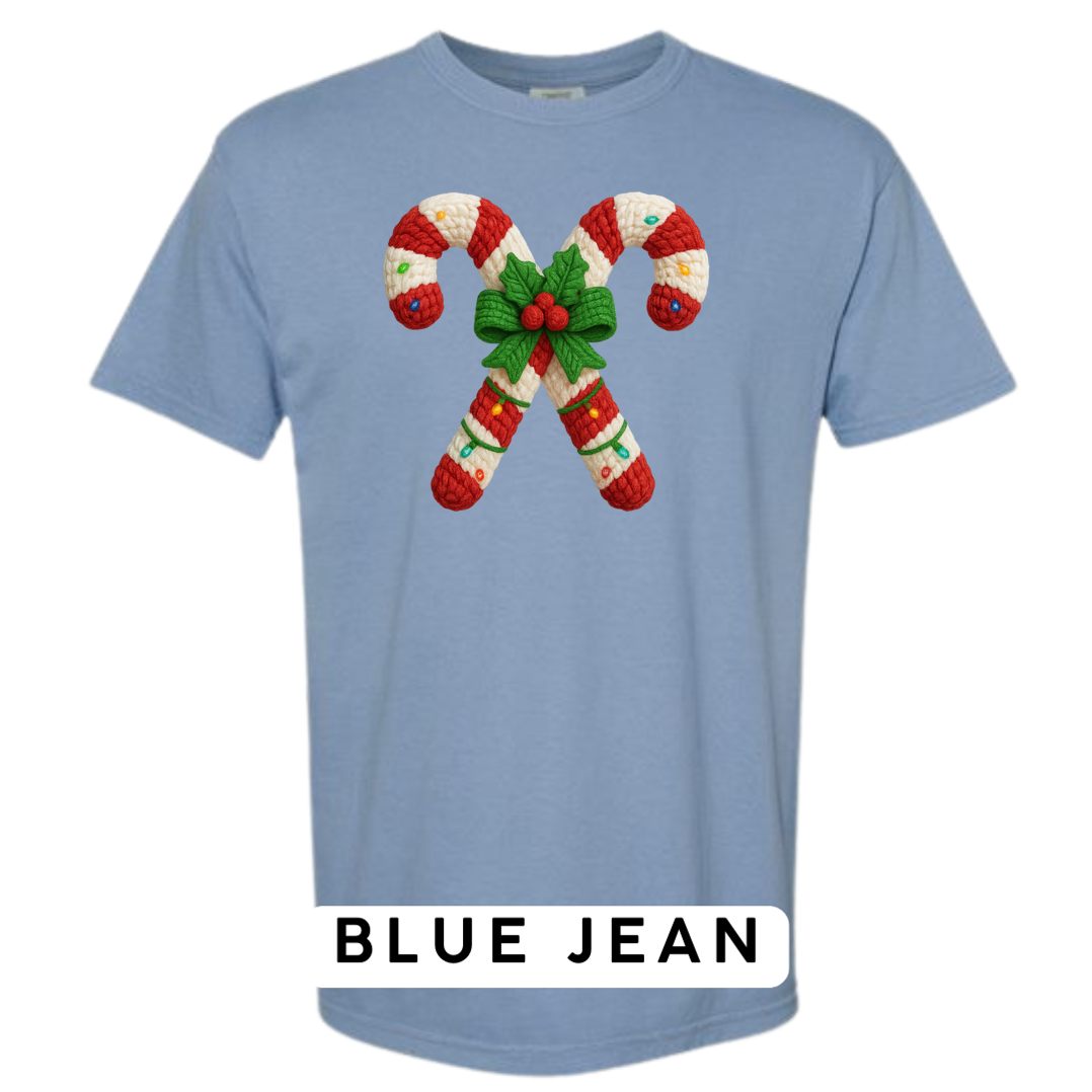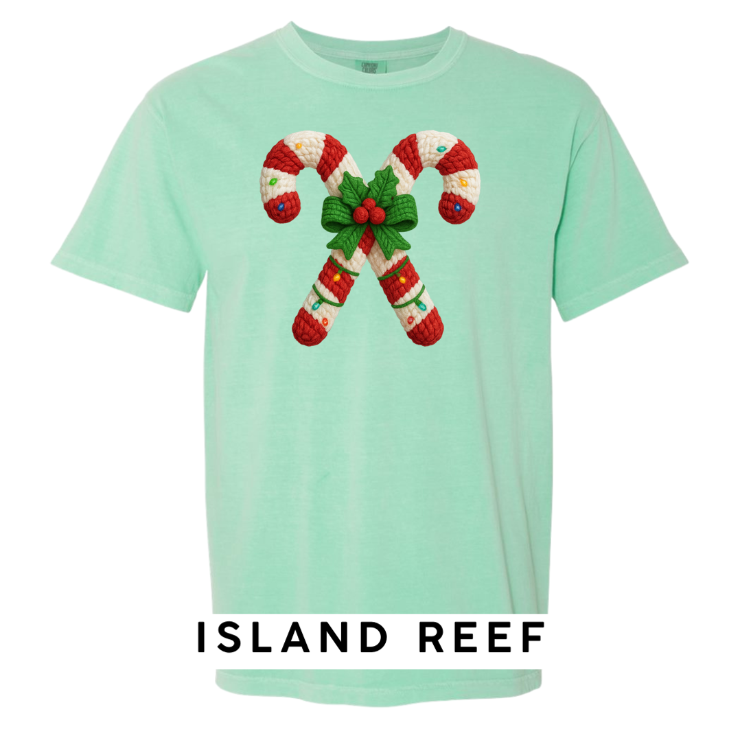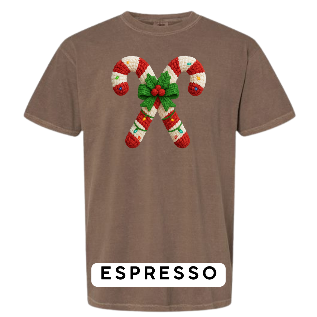 Sweeten your holiday lineup with this charming double candy cane design! Styled to look hand-knit with cozy yarn textures, wrapped in colorful Christmas lights, and topped with a bold green bow—this artwork is a warm and whimsical addition to any holiday apparel or accessory.