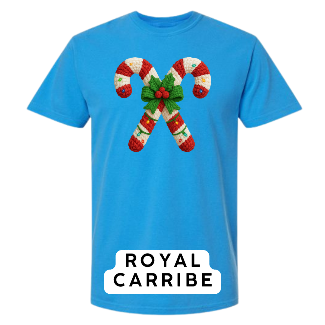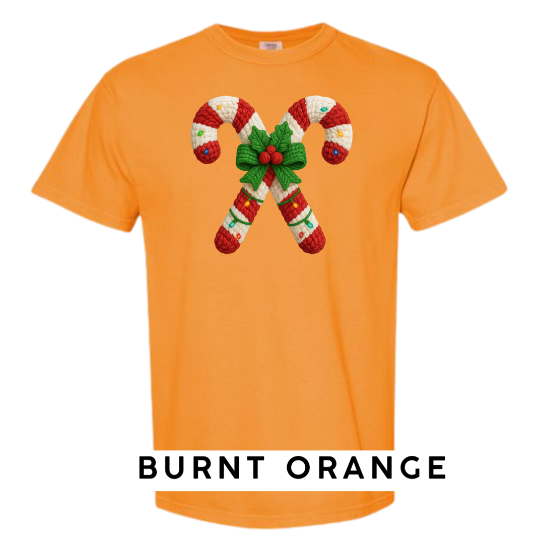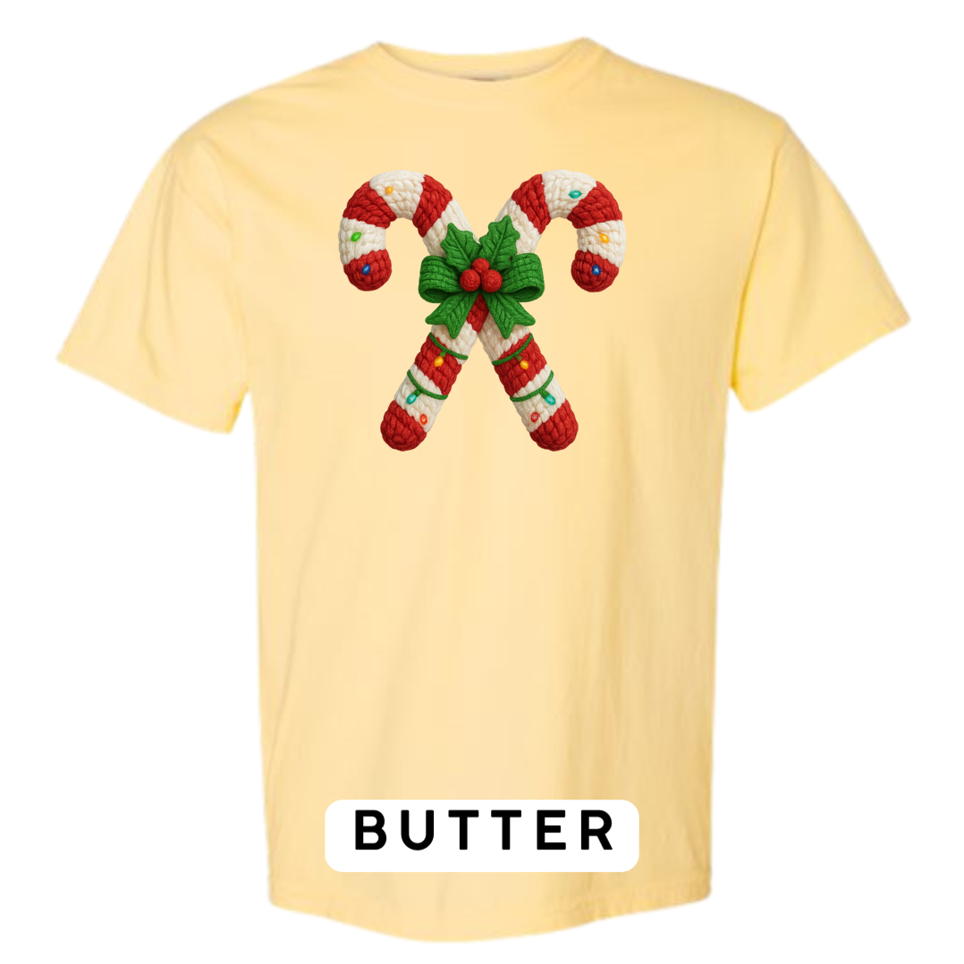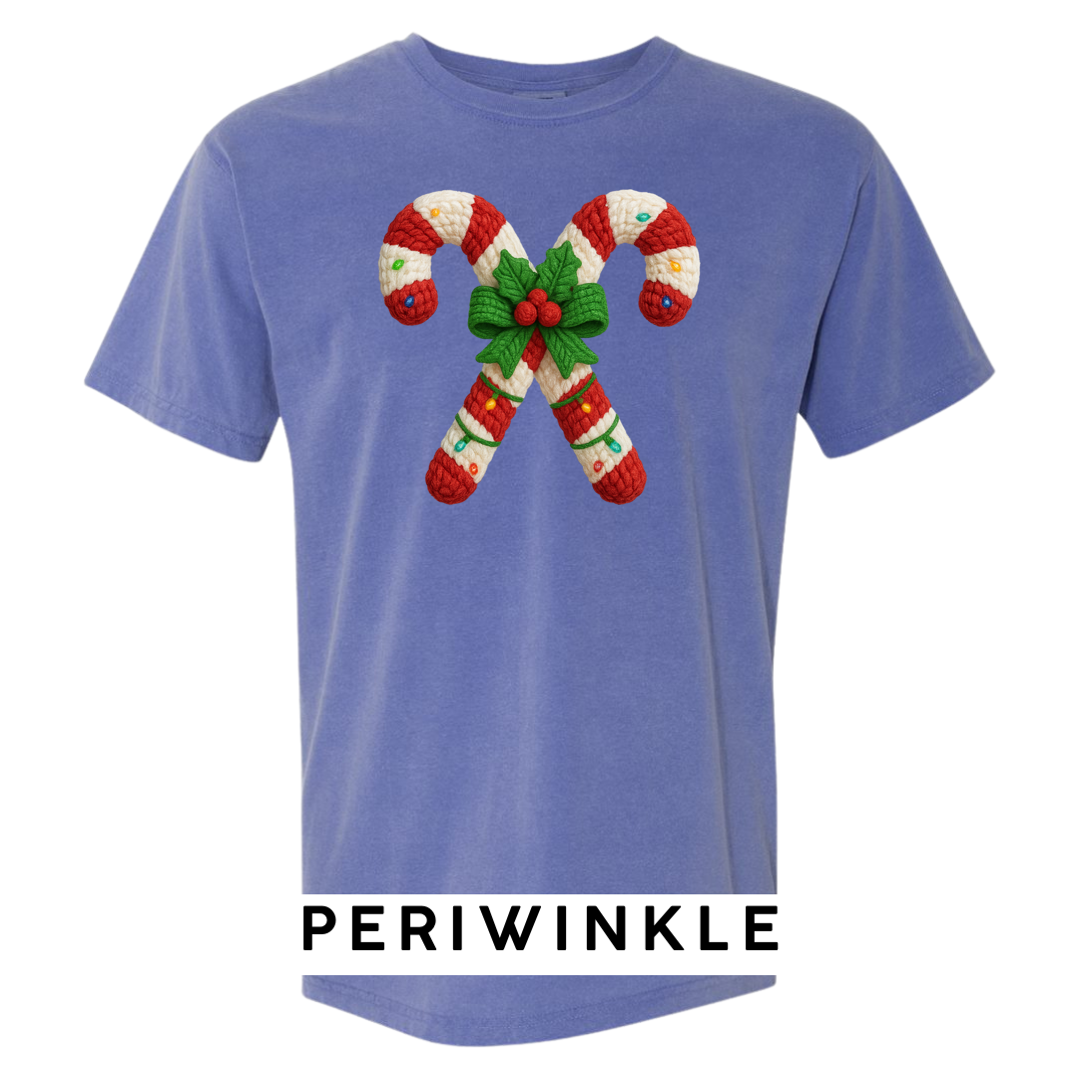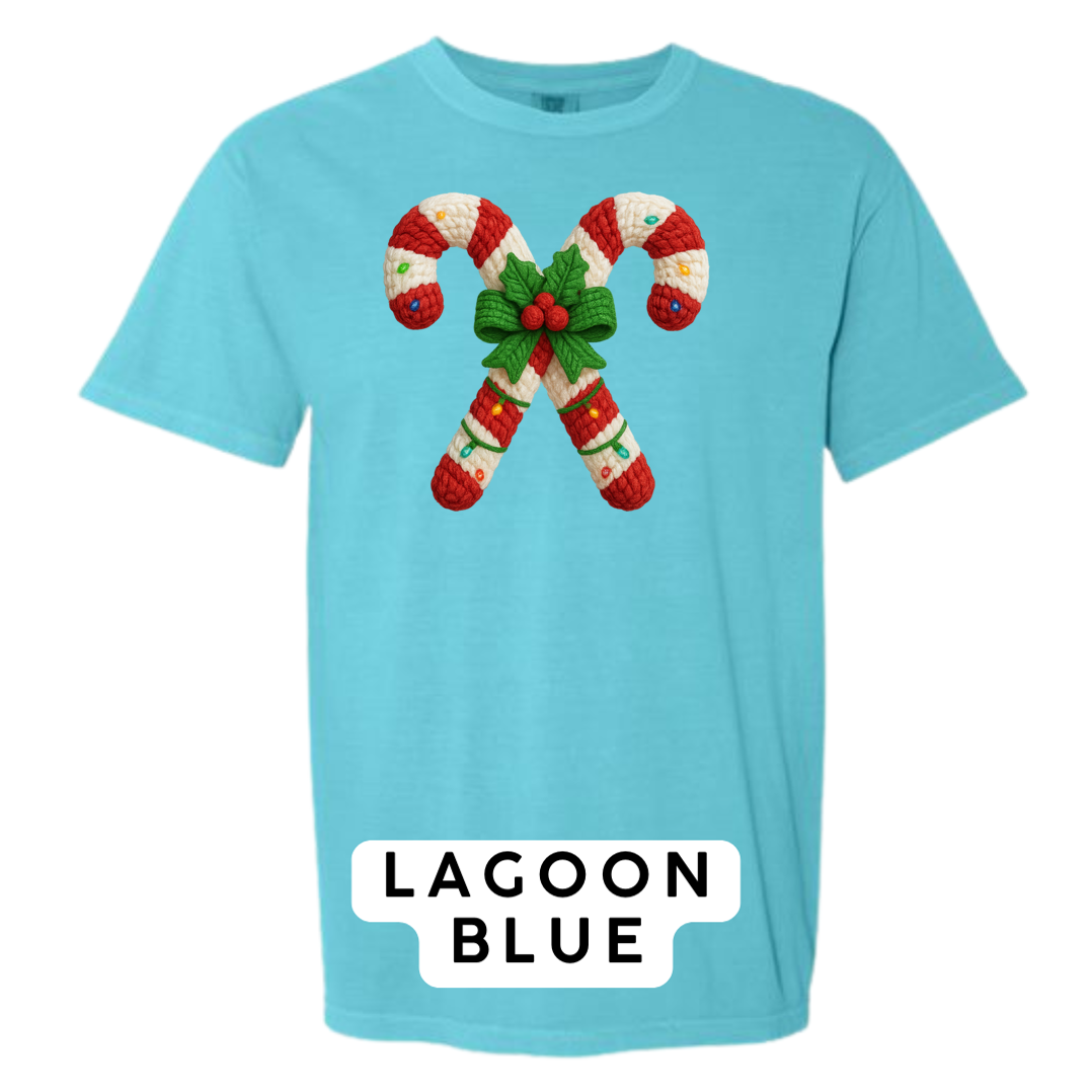 Sweeten your holiday lineup with this charming double candy cane design! Styled to look hand-knit with cozy yarn textures, wrapped in colorful Christmas lights, and topped with a bold green bow—this artwork is a warm and whimsical addition to any holiday apparel or accessory.