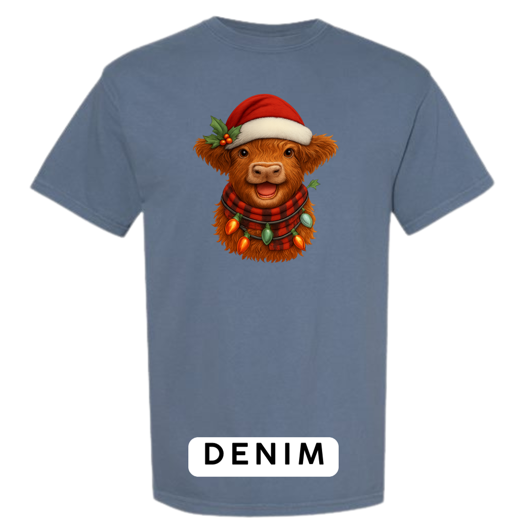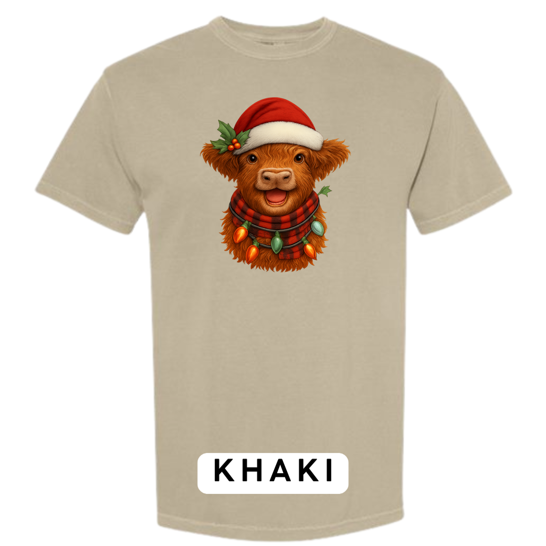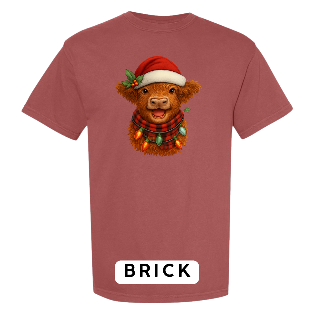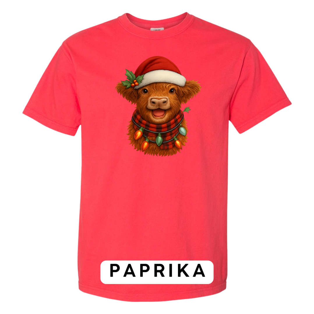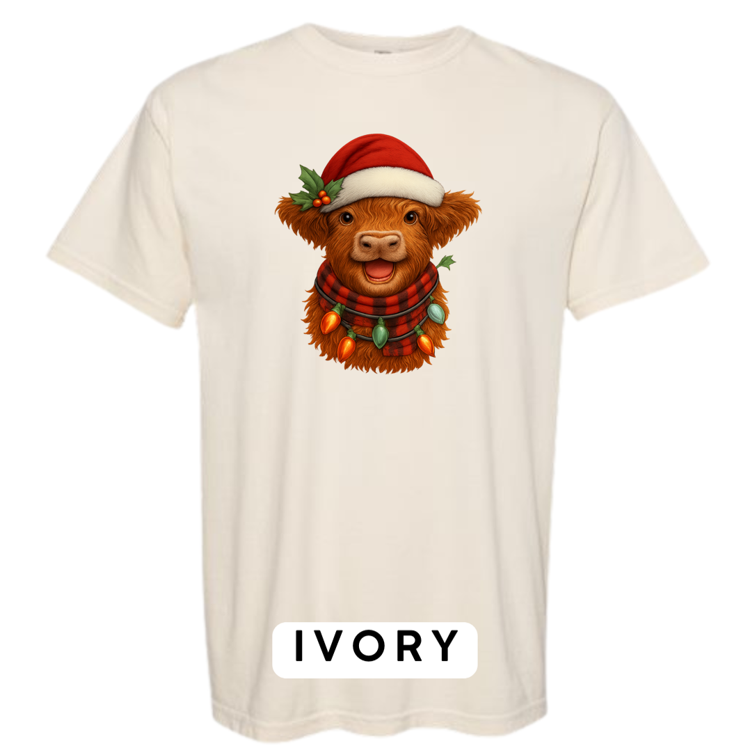 Bring cozy holiday vibes to your wardrobe and gifts with this irresistibly cute Highland Cow Christmas design! Featuring a fluffy Highland cow wearing a Santa hat, buffalo-plaid scarf, and wrapped in glowing vintage Christmas lights — this artwork delivers the perfect mix of farmhouse charm and festive cheer.