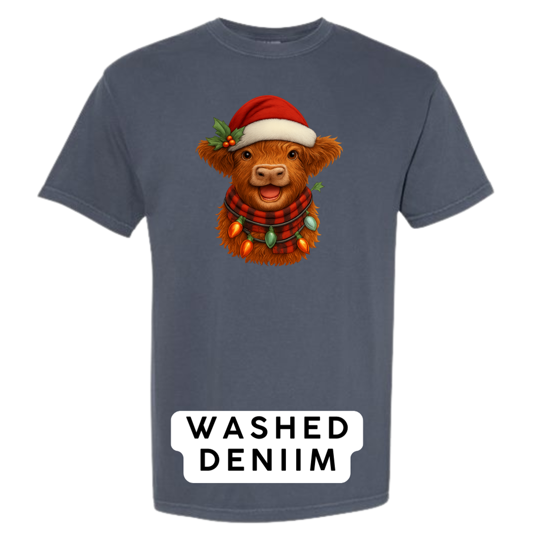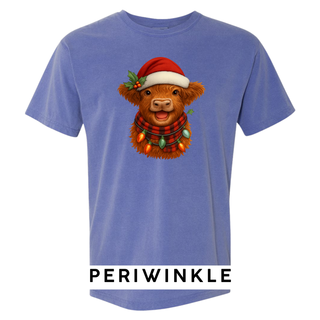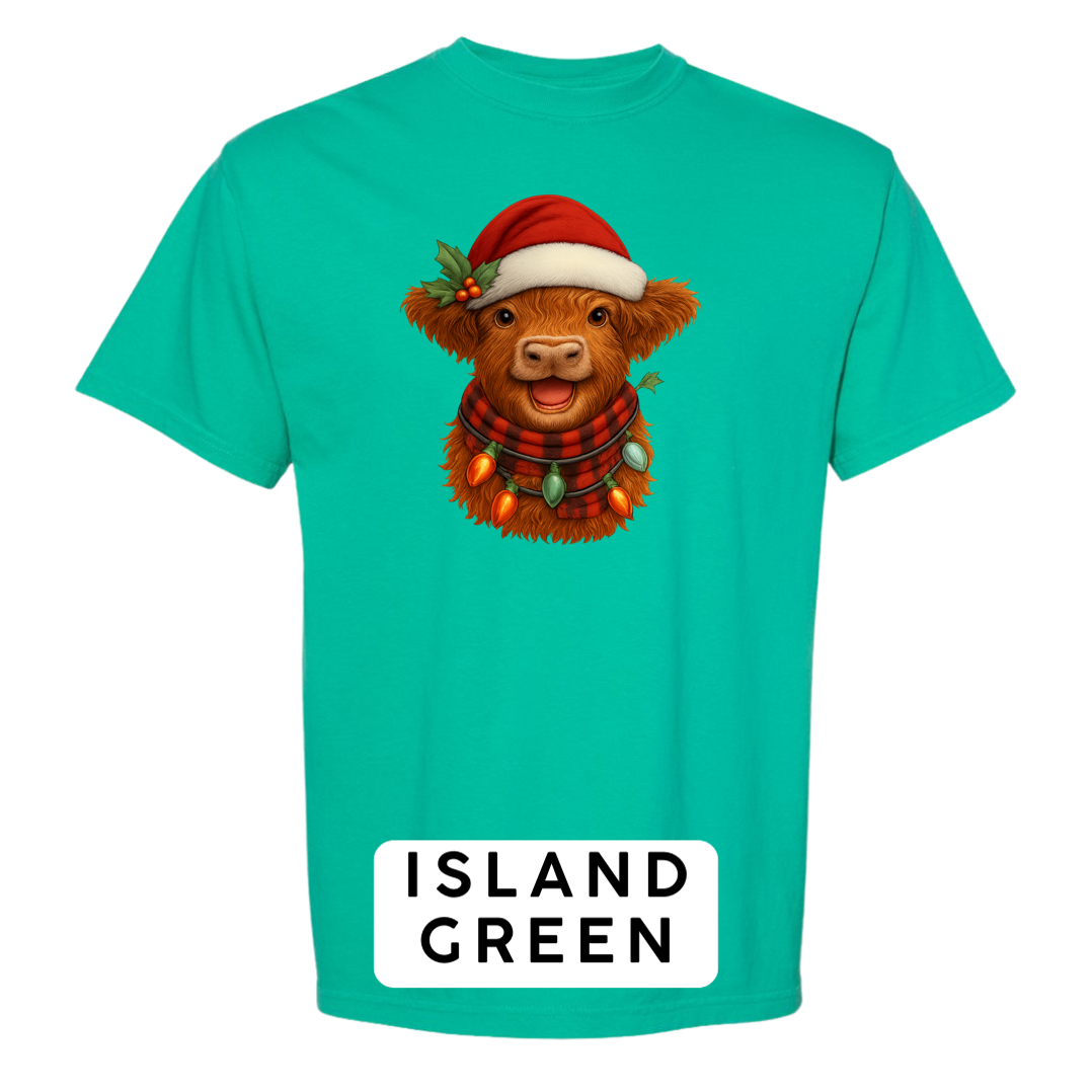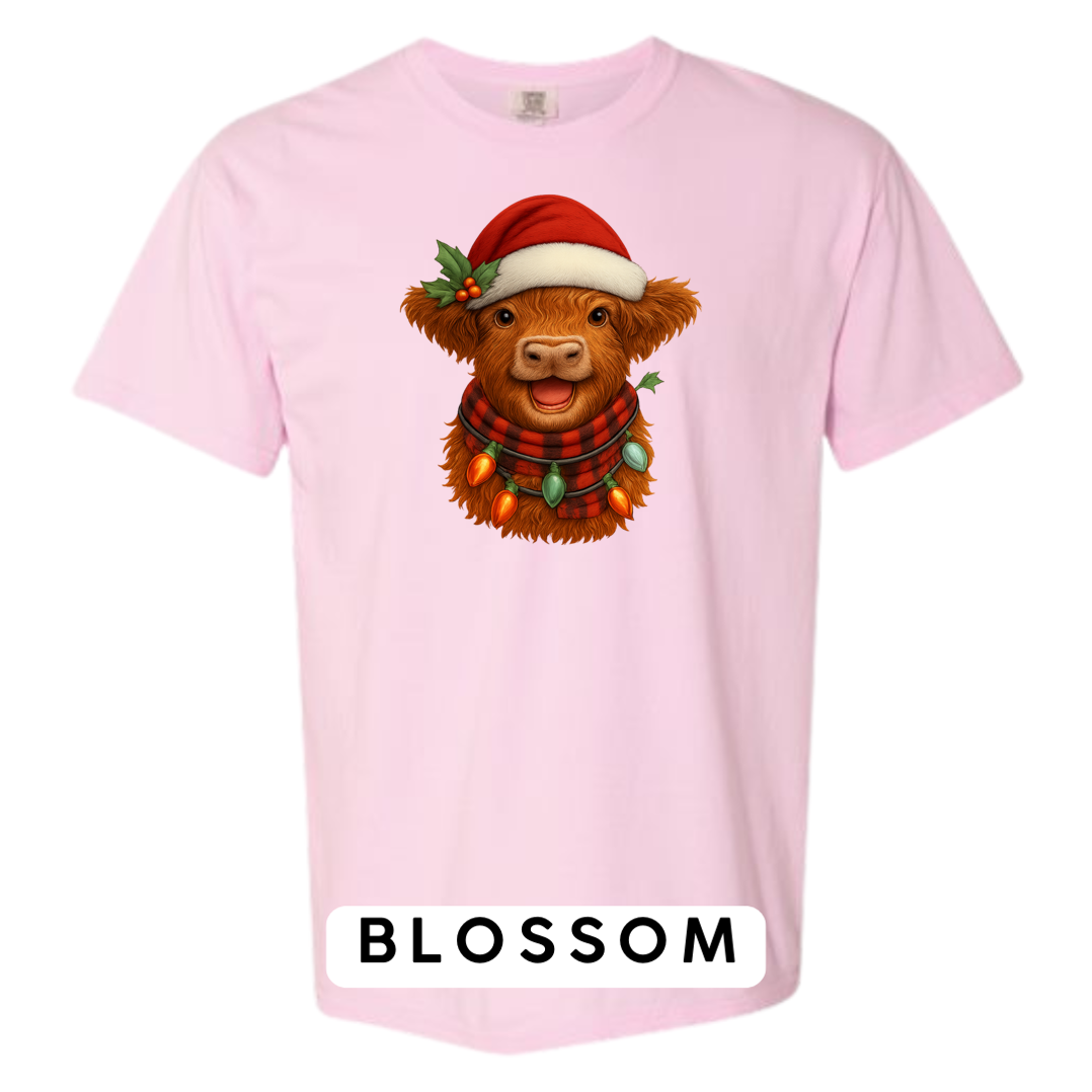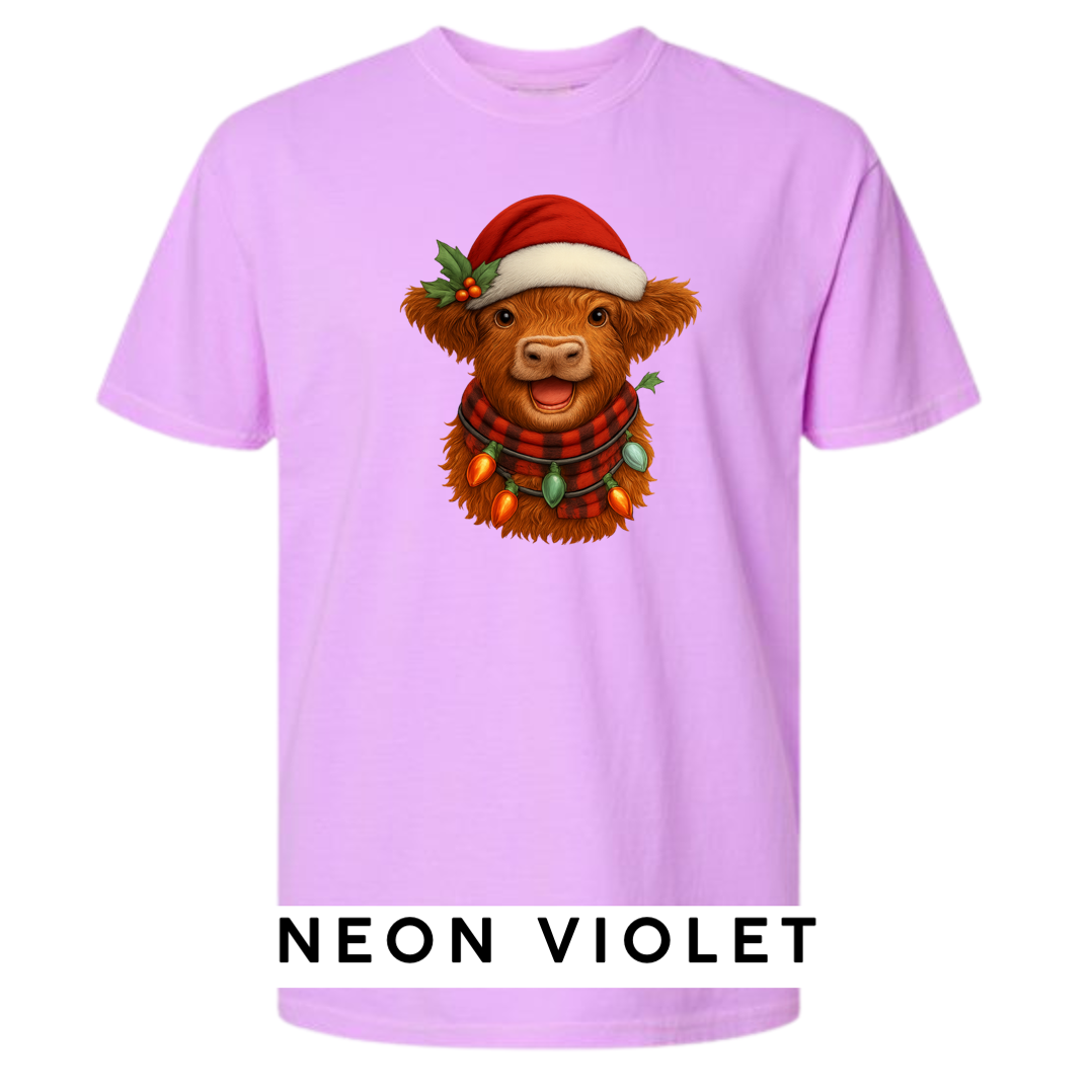 Bring cozy holiday vibes to your wardrobe and gifts with this irresistibly cute Highland Cow Christmas design! Featuring a fluffy Highland cow wearing a Santa hat, buffalo-plaid scarf, and wrapped in glowing vintage Christmas lights — this artwork delivers the perfect mix of farmhouse charm and festive cheer.
