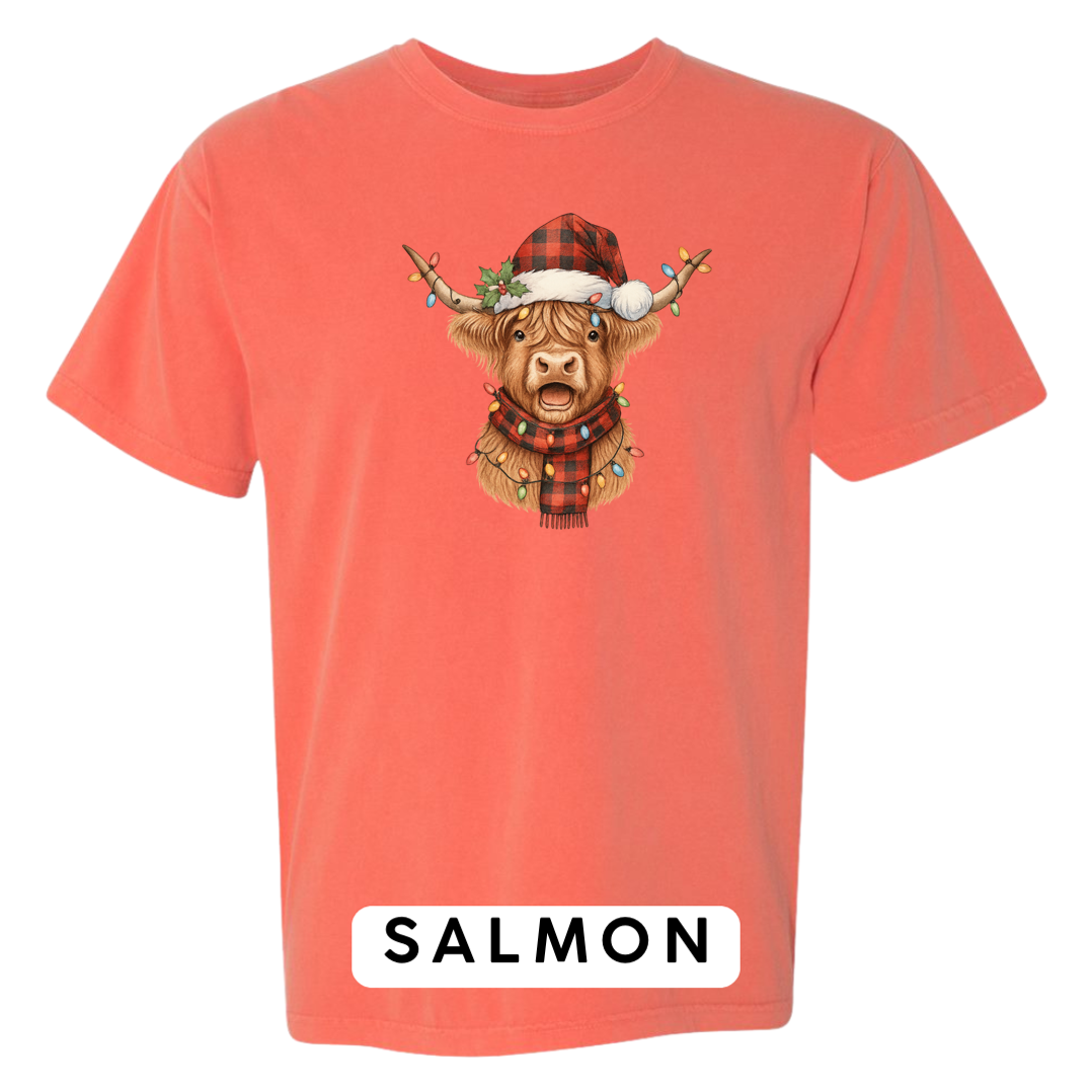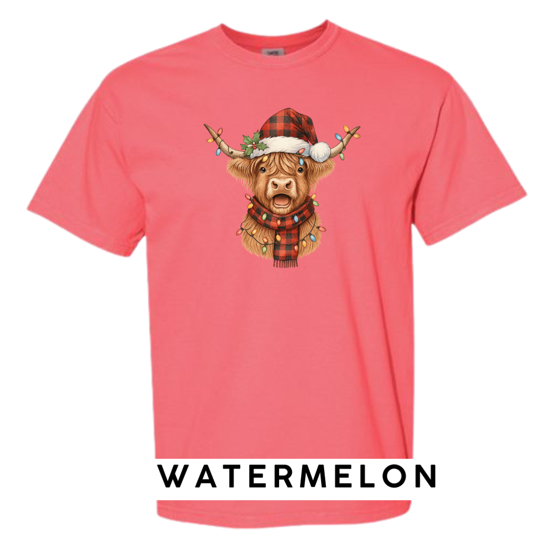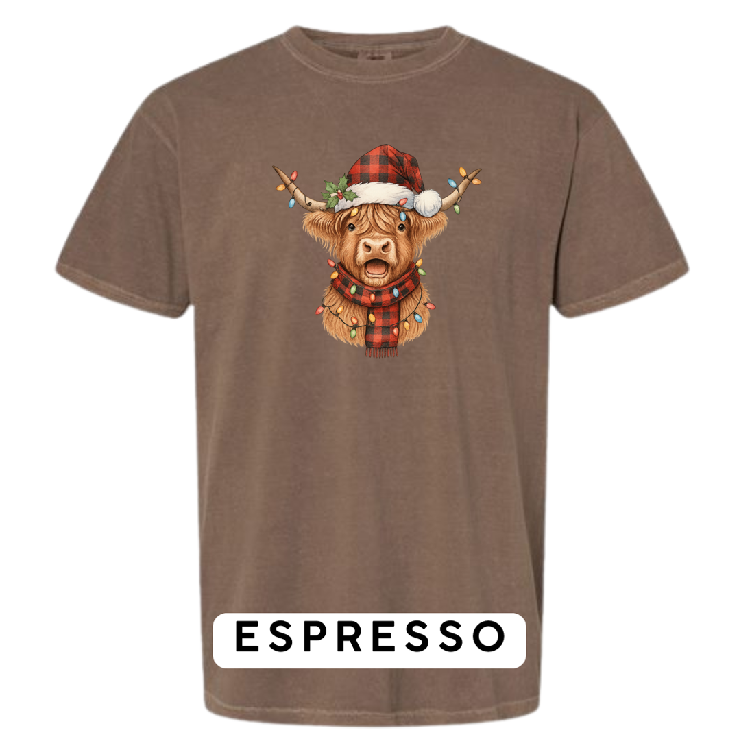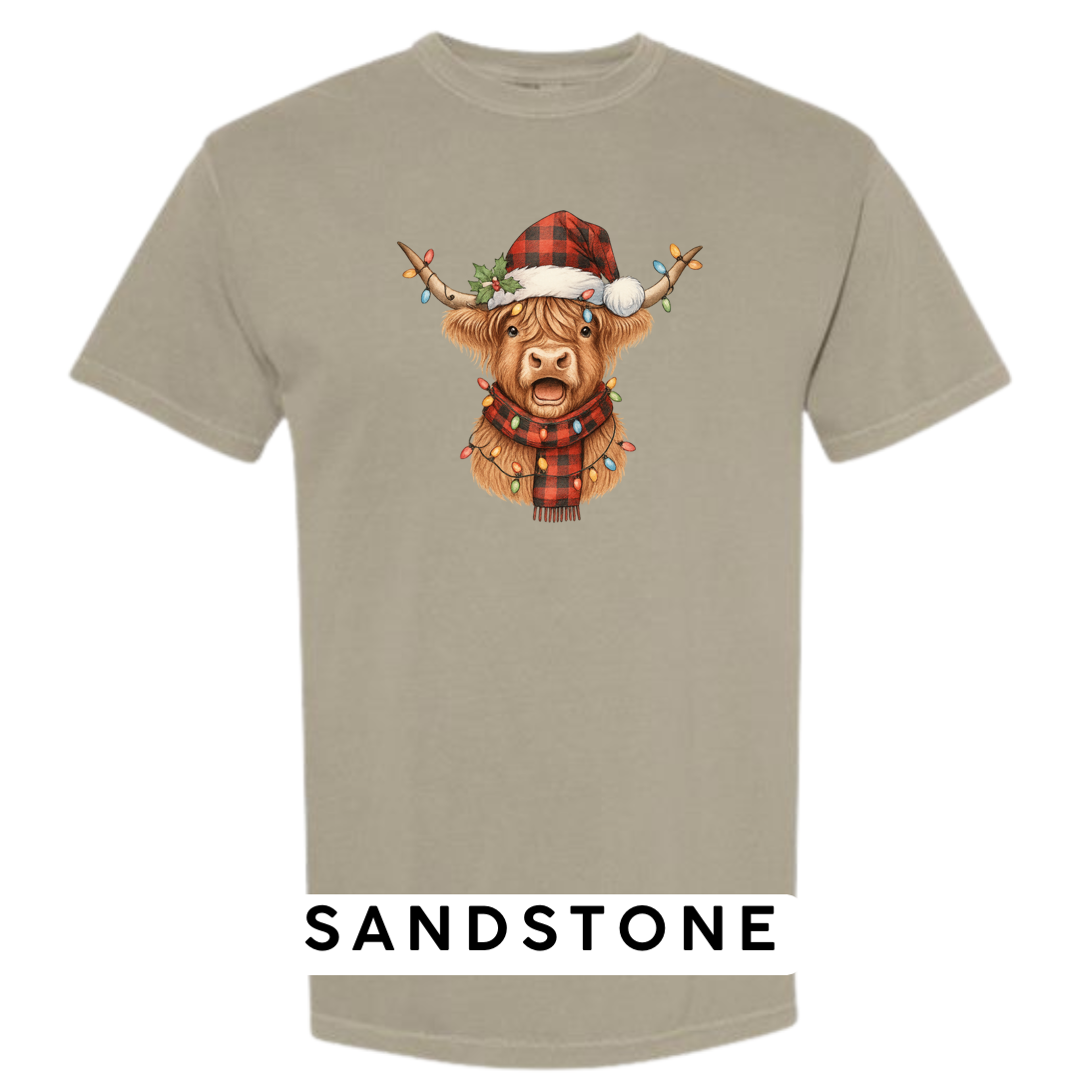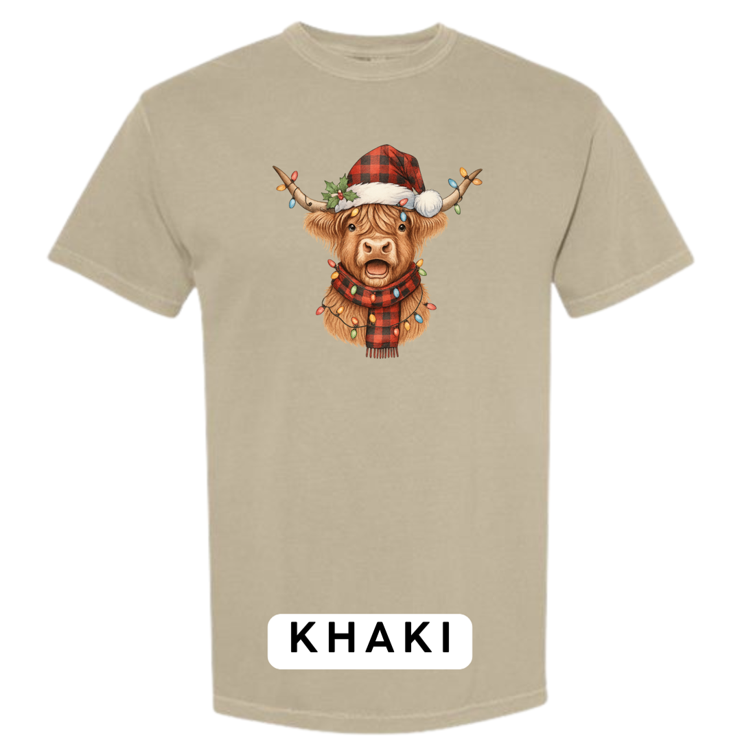 Meet the holiday spirit wrapped in buffalo plaid! Our Festive Highland Cow design features an adorable highland cow dressed in a red-and-black buffalo plaid Santa hat and matching scarf, complete with glowing multi-color Christmas lights draped across its horns and chest. This cheerful, rustic-Christmas artwork is guaranteed to make anyone smile!