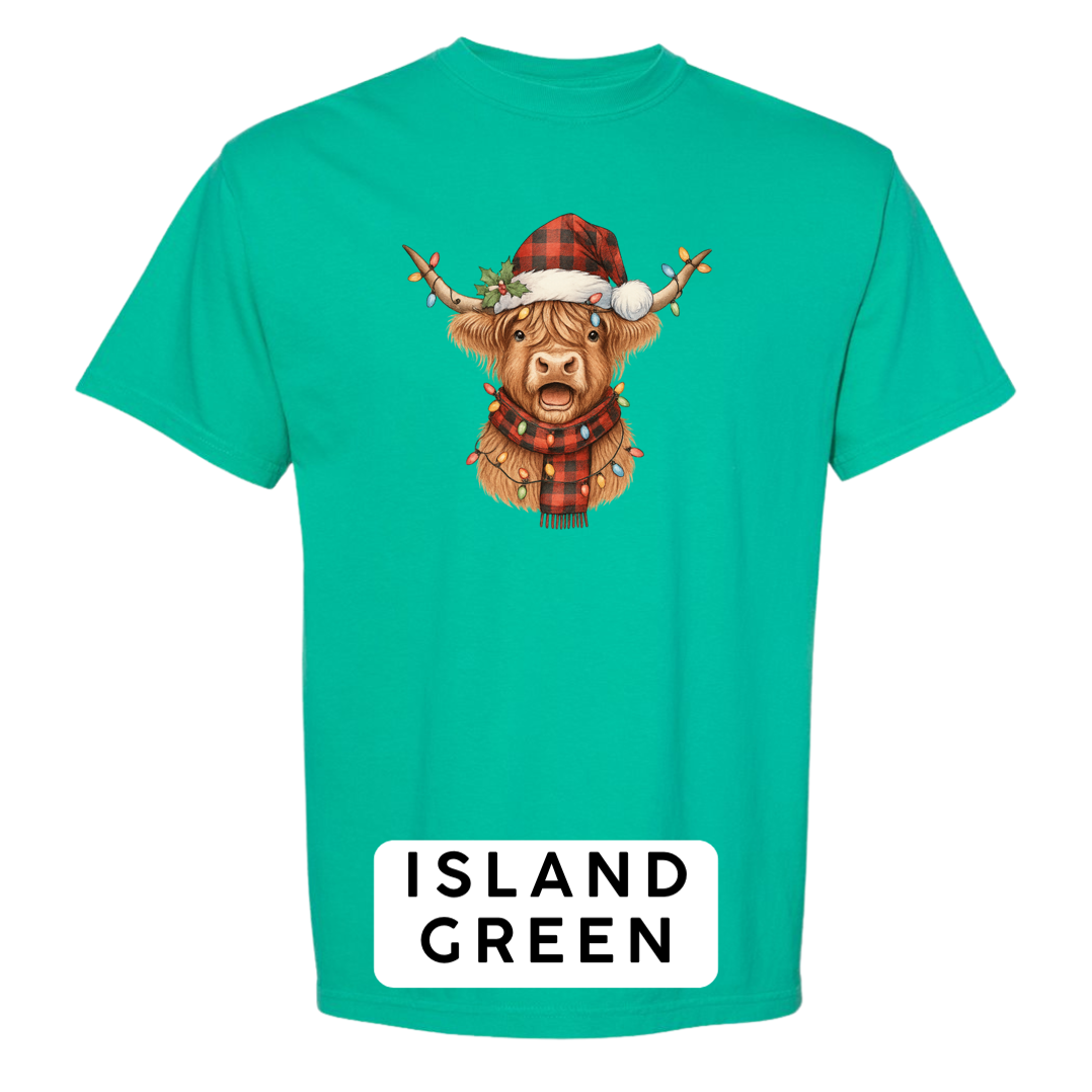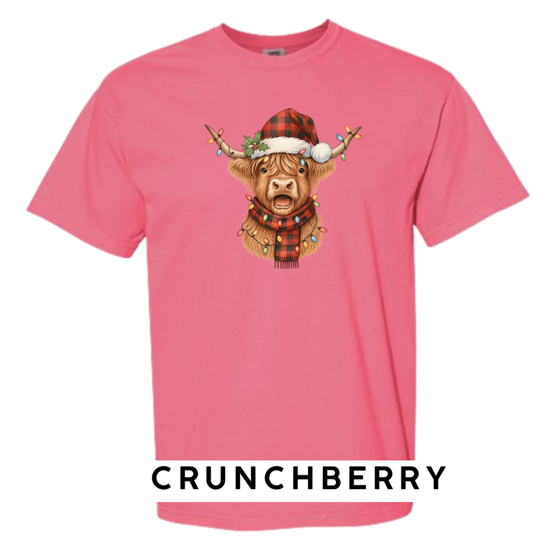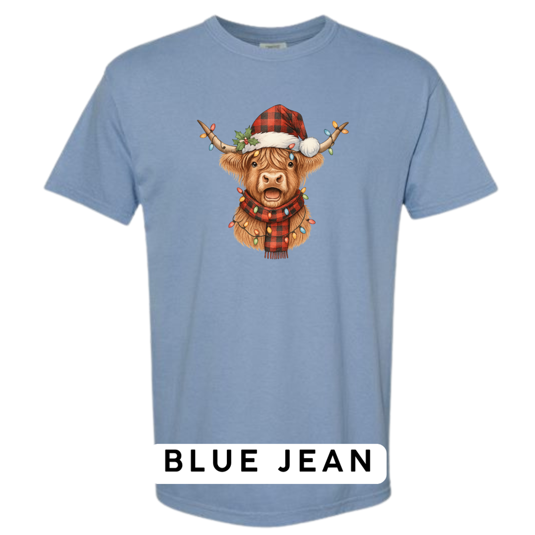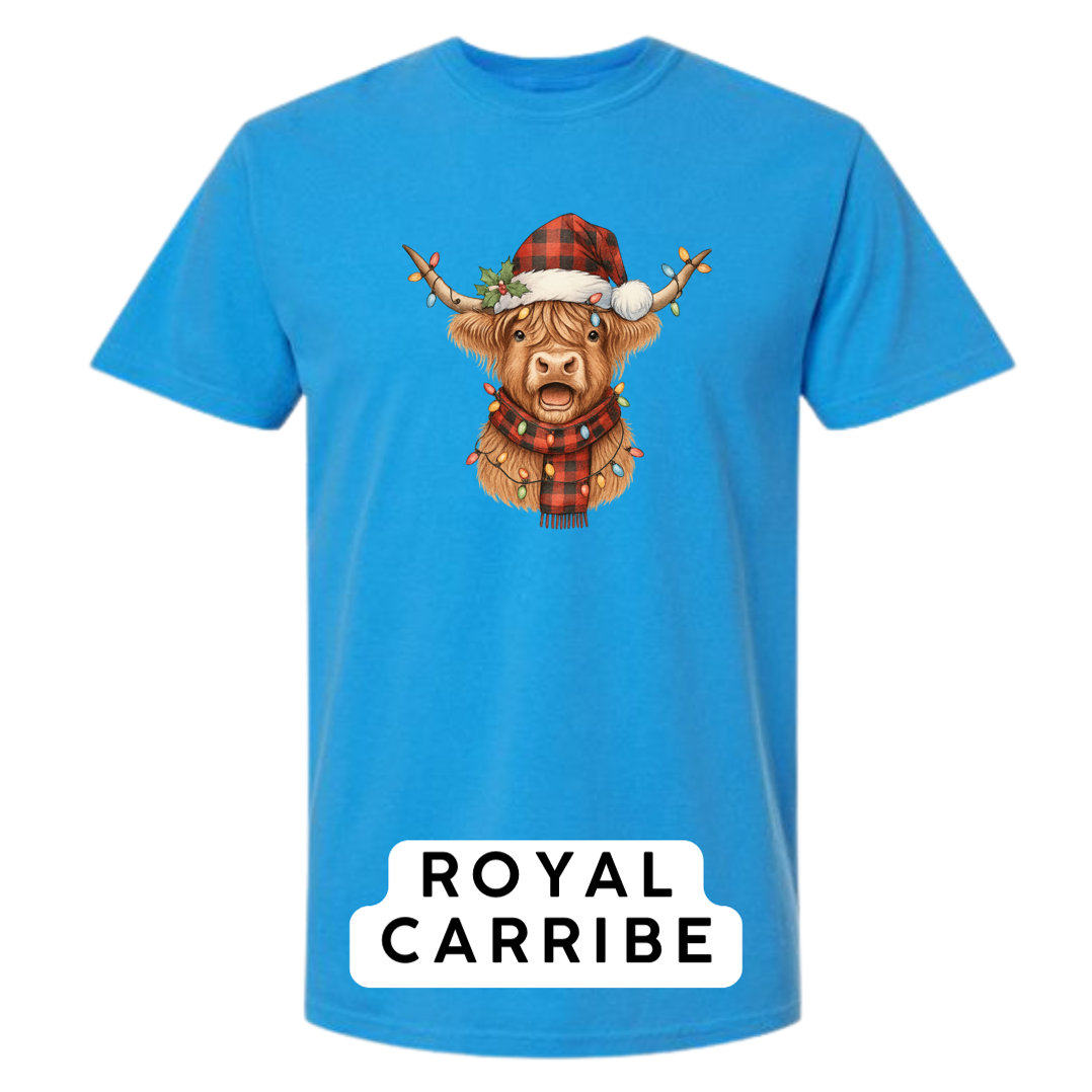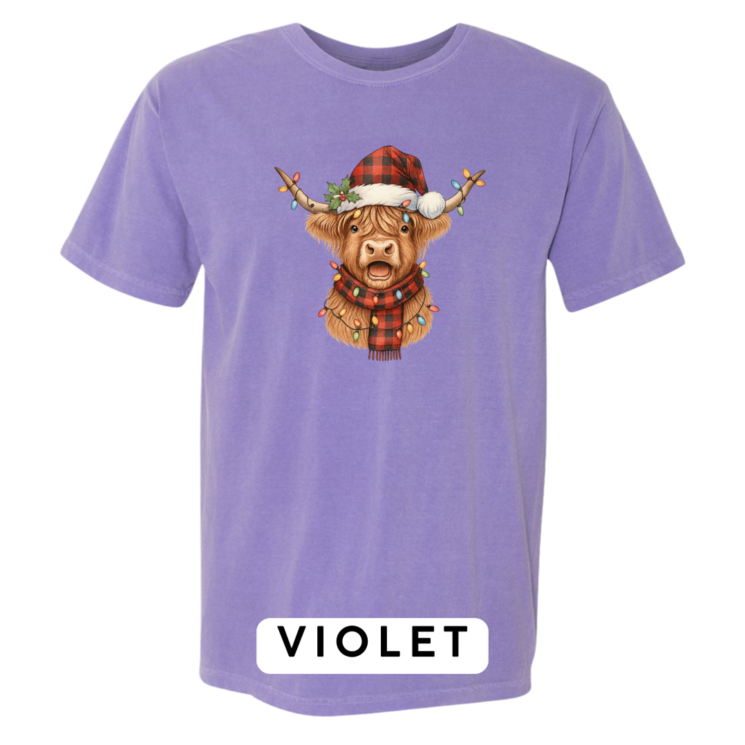 Meet the holiday spirit wrapped in buffalo plaid! Our Festive Highland Cow design features an adorable highland cow dressed in a red-and-black buffalo plaid Santa hat and matching scarf, complete with glowing multi-color Christmas lights draped across its horns and chest. This cheerful, rustic-Christmas artwork is guaranteed to make anyone smile!