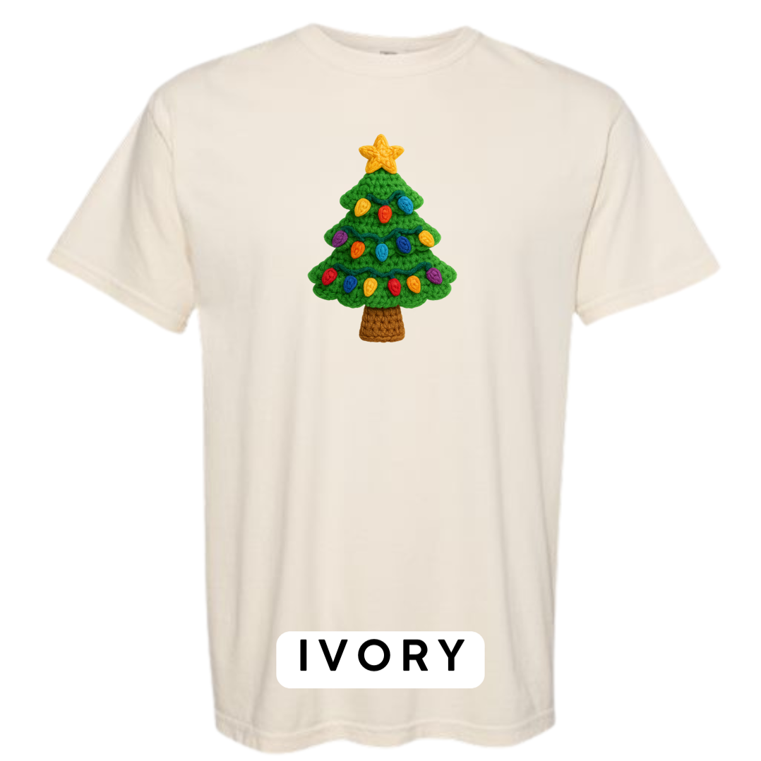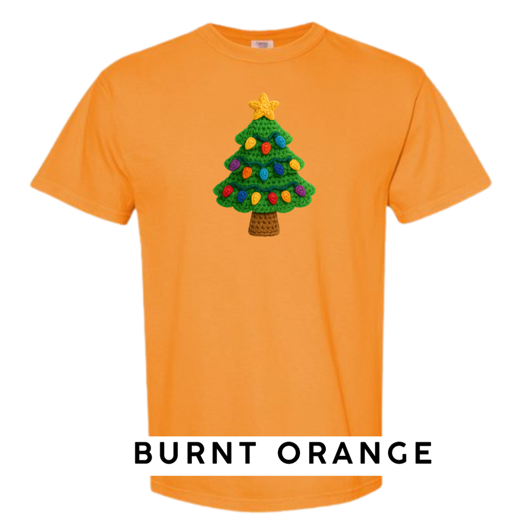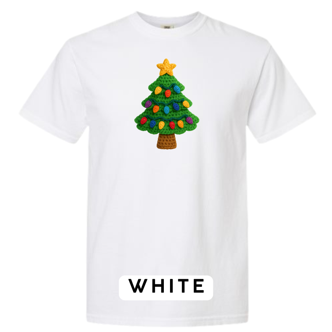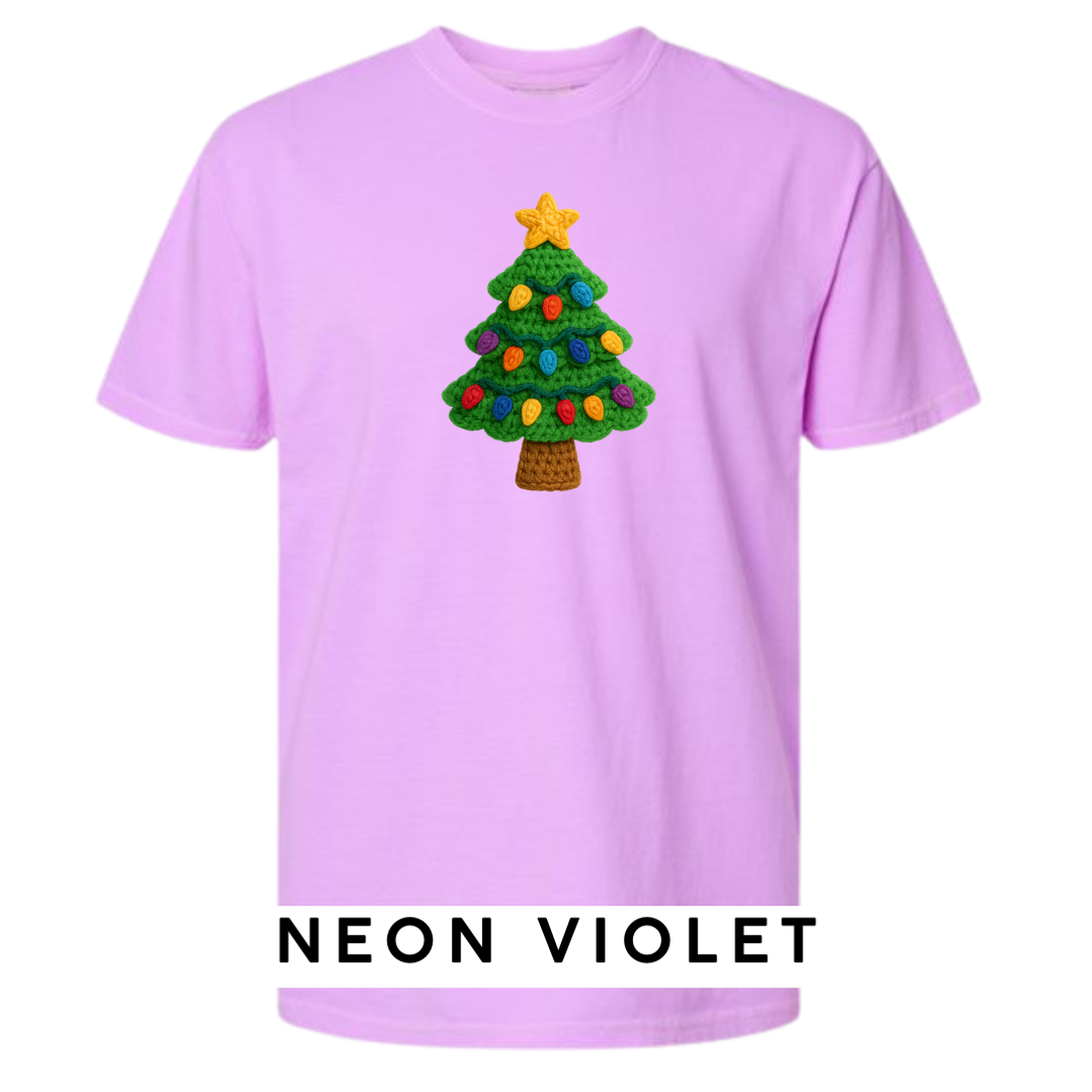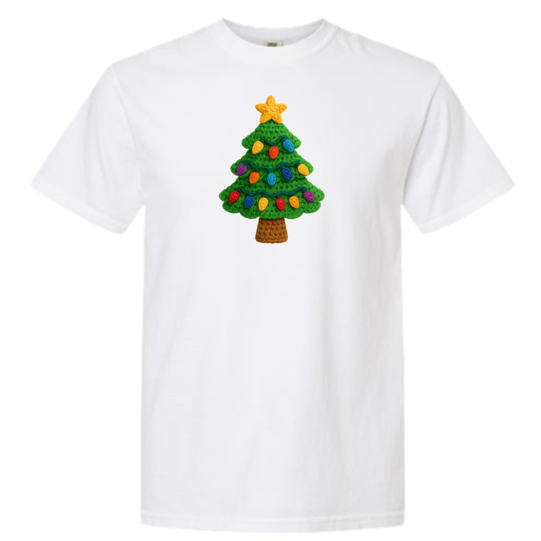 This adorable chunky-knit Christmas tree shines bright with multicolor retro lights and a soft golden star topper. It’s the perfect cozy holiday design for anyone who loves colorful, cheerful Christmas décor.