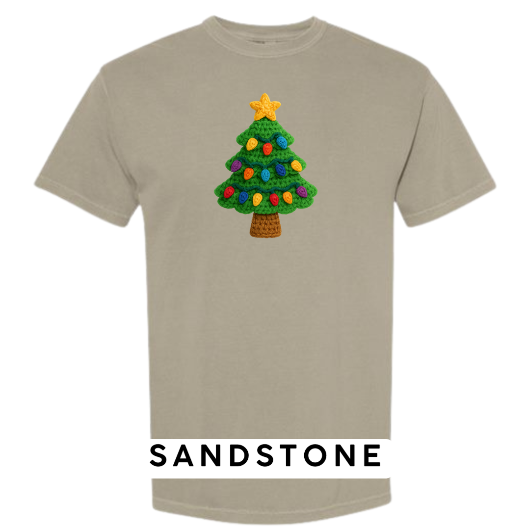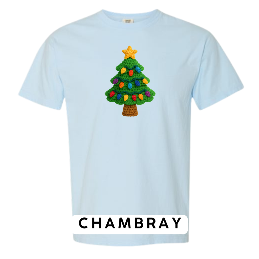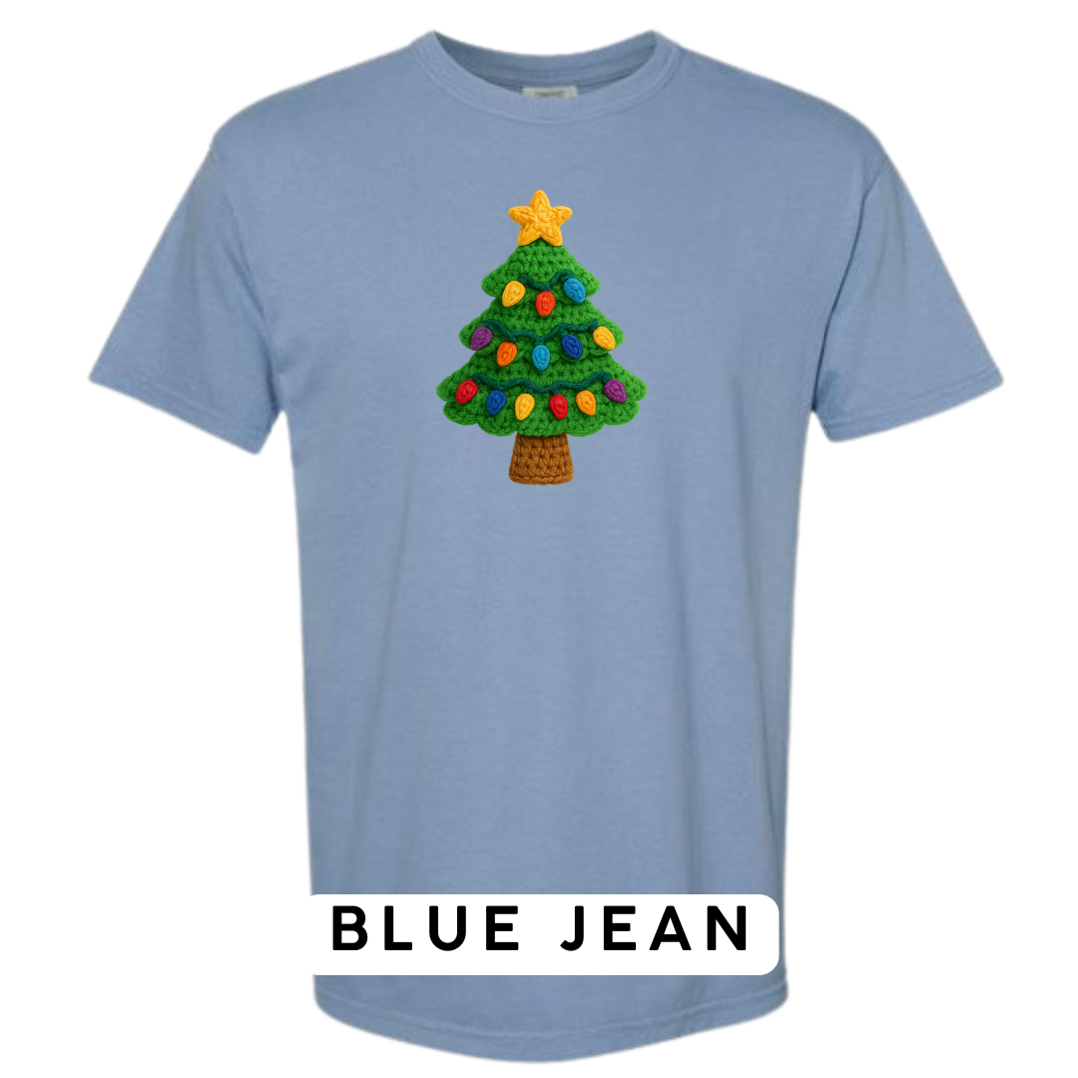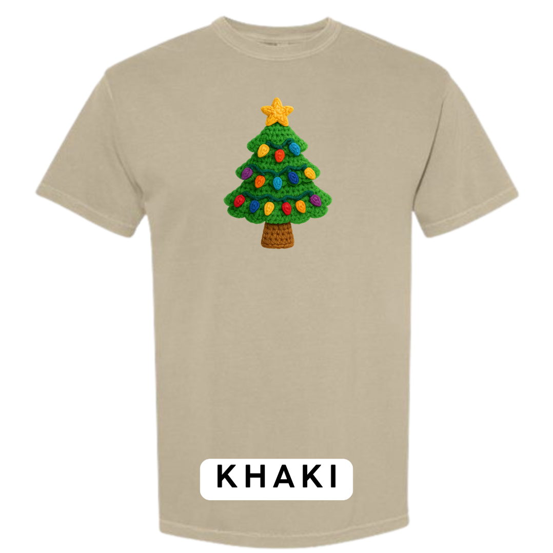 This adorable chunky-knit Christmas tree shines bright with multicolor retro lights and a soft golden star topper. It’s the perfect cozy holiday design for anyone who loves colorful, cheerful Christmas décor.