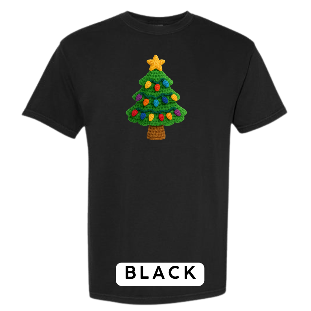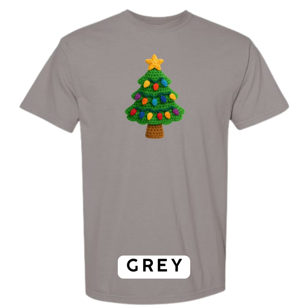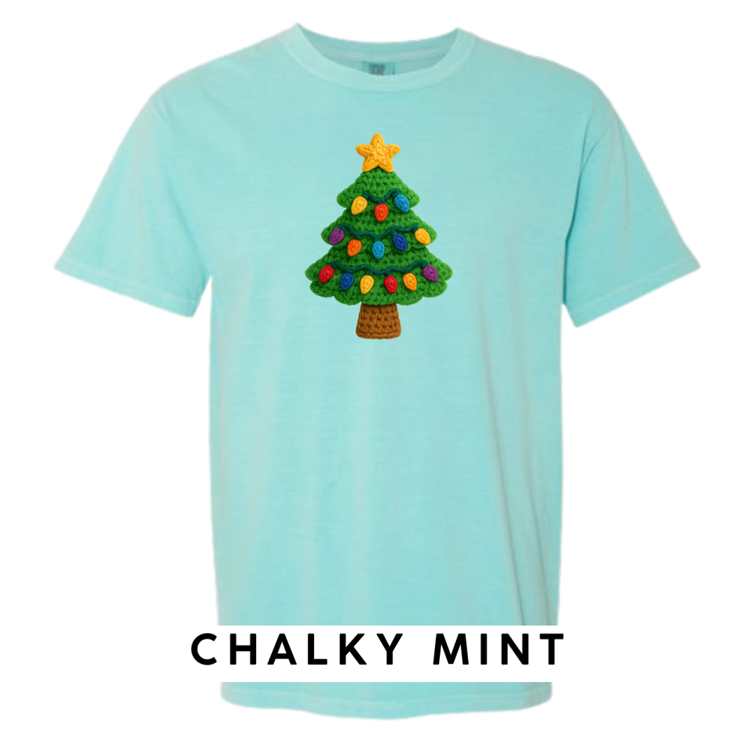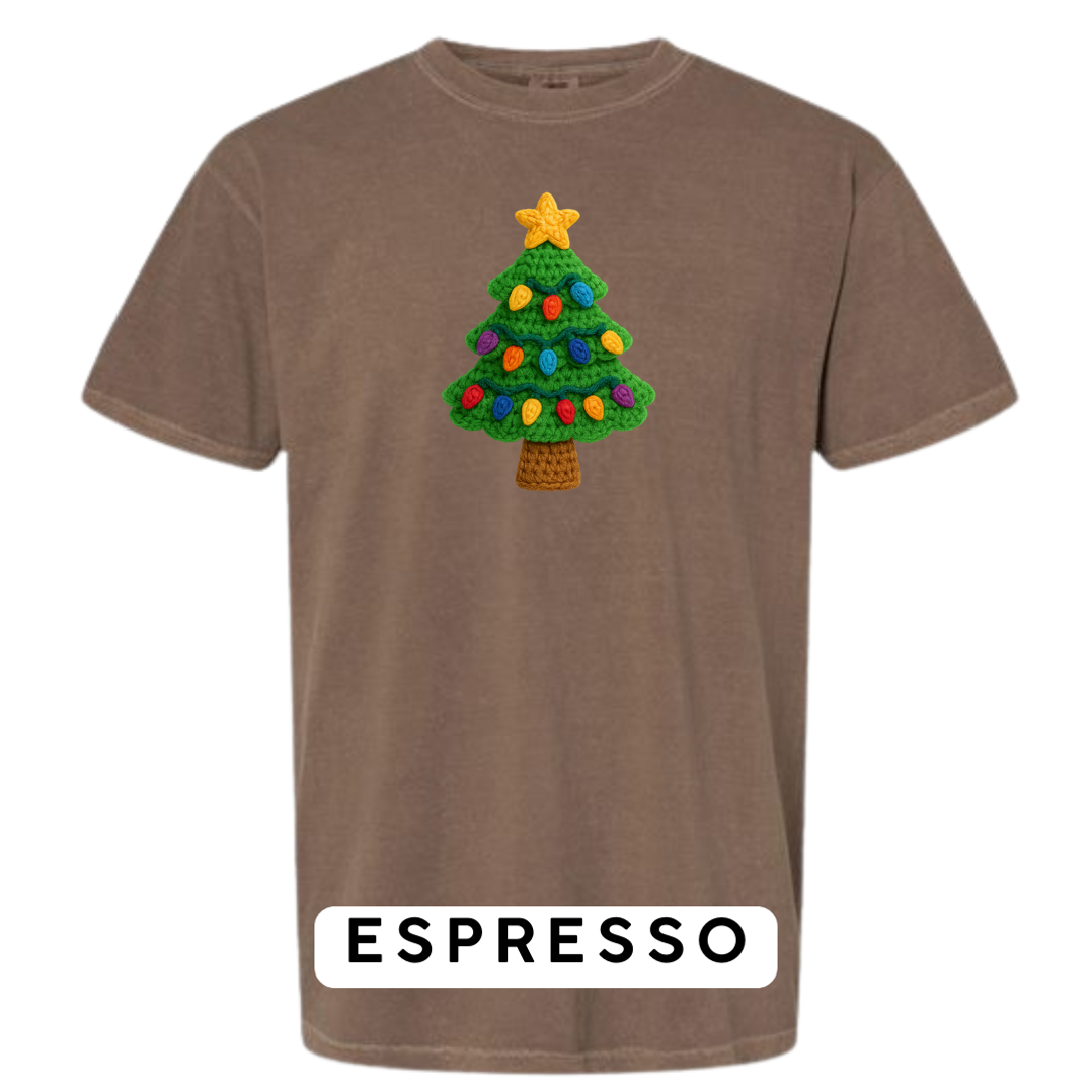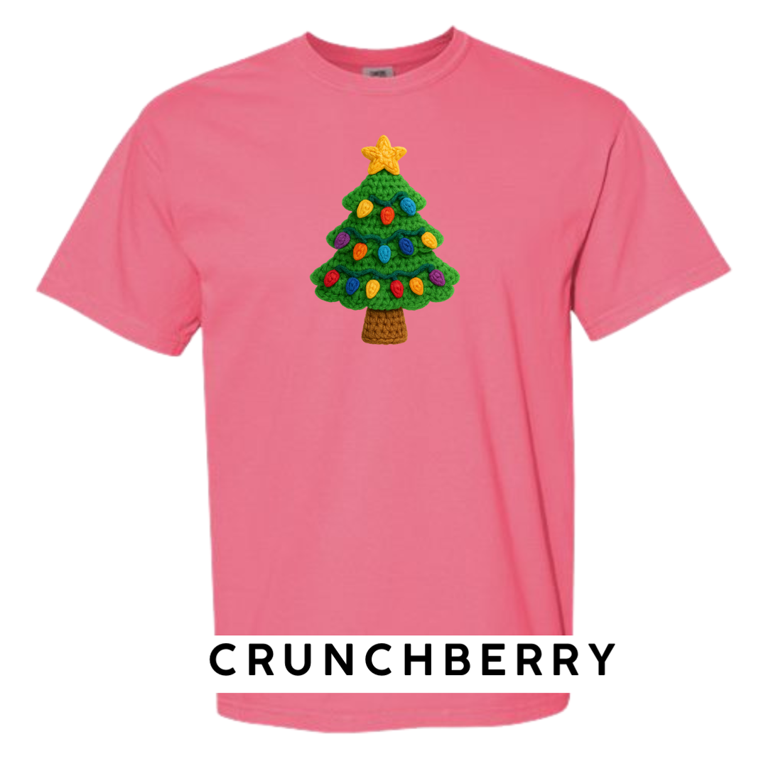 This adorable chunky-knit Christmas tree shines bright with multicolor retro lights and a soft golden star topper. It’s the perfect cozy holiday design for anyone who loves colorful, cheerful Christmas décor.