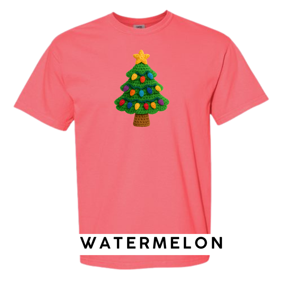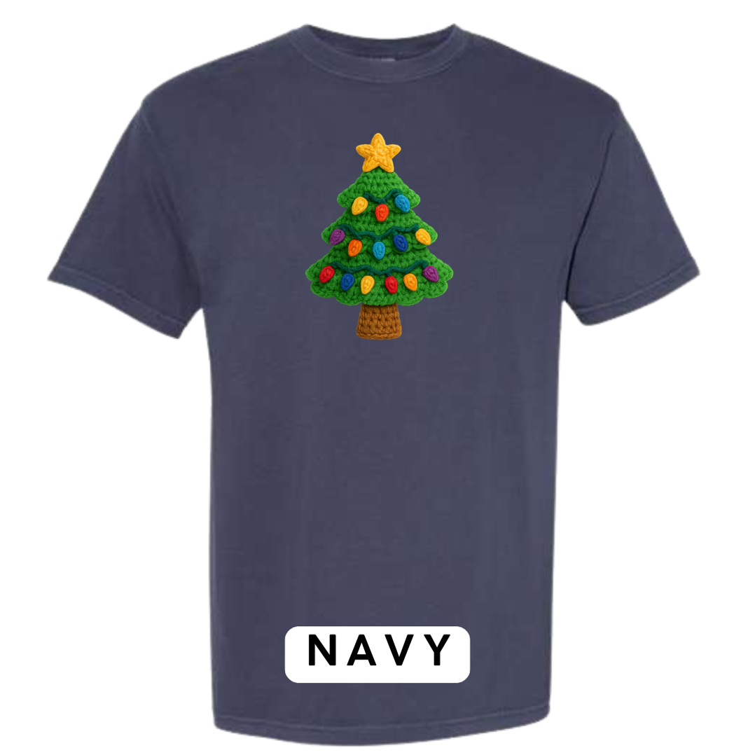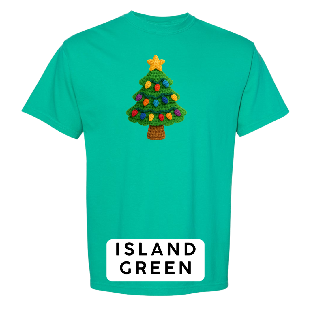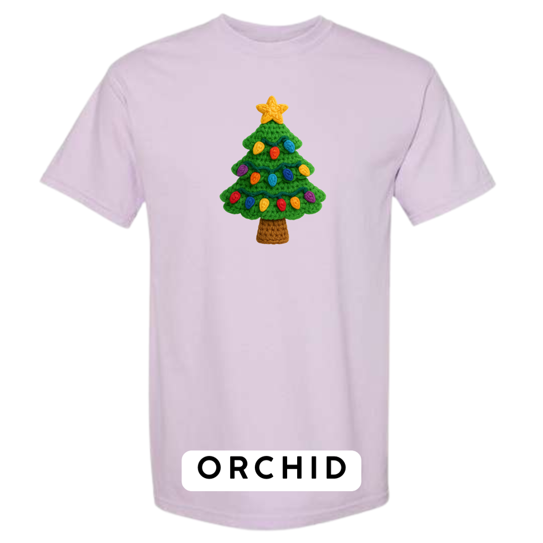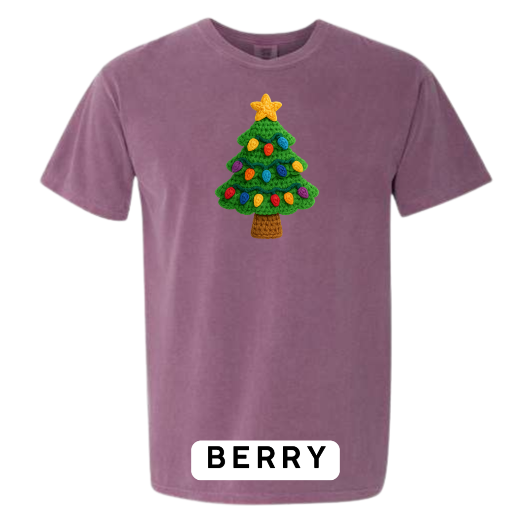 This adorable chunky-knit Christmas tree shines bright with multicolor retro lights and a soft golden star topper. It’s the perfect cozy holiday design for anyone who loves colorful, cheerful Christmas décor.