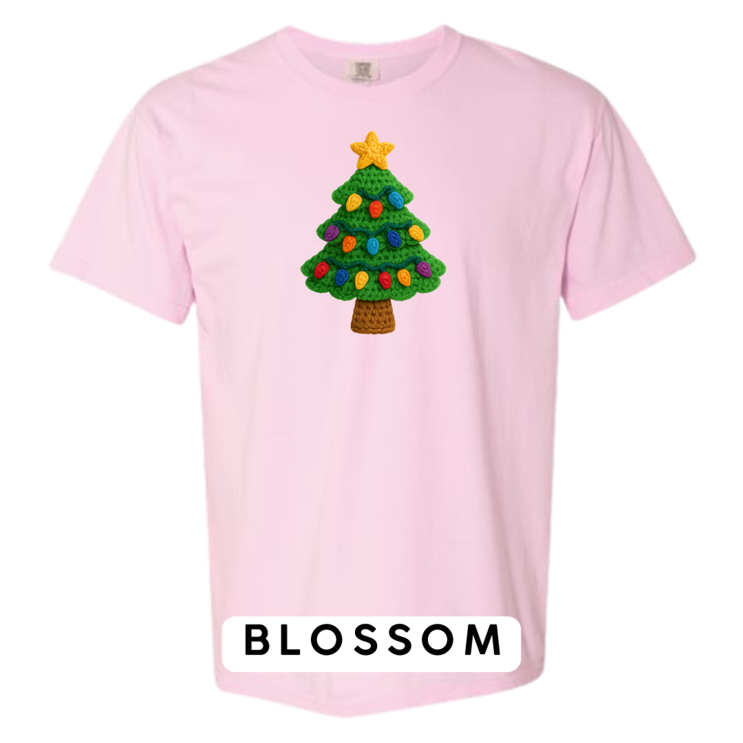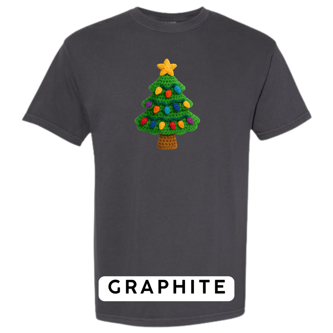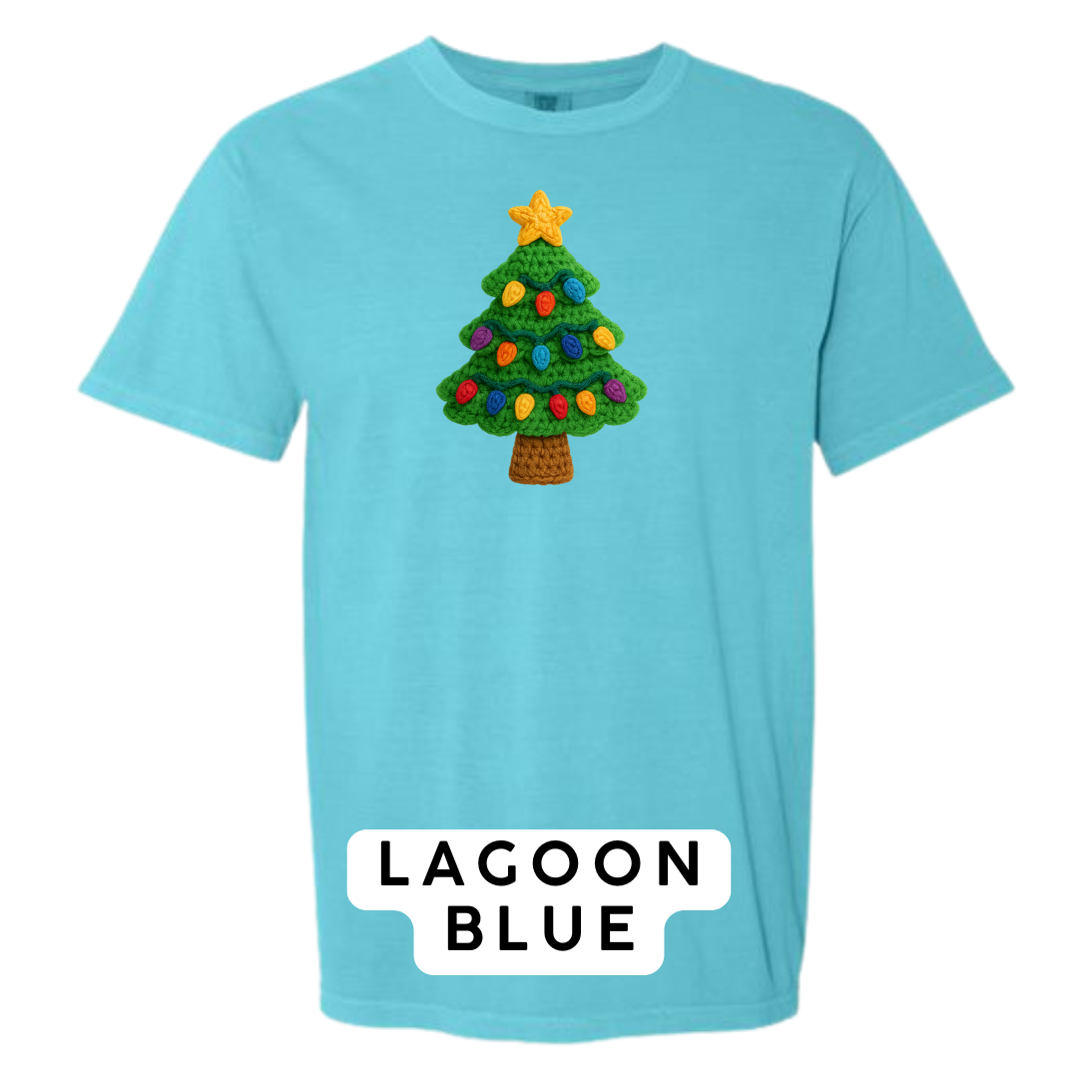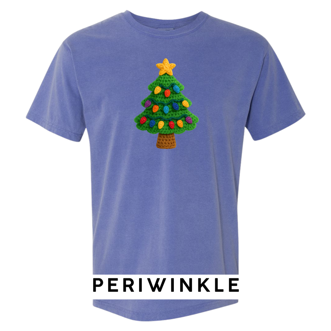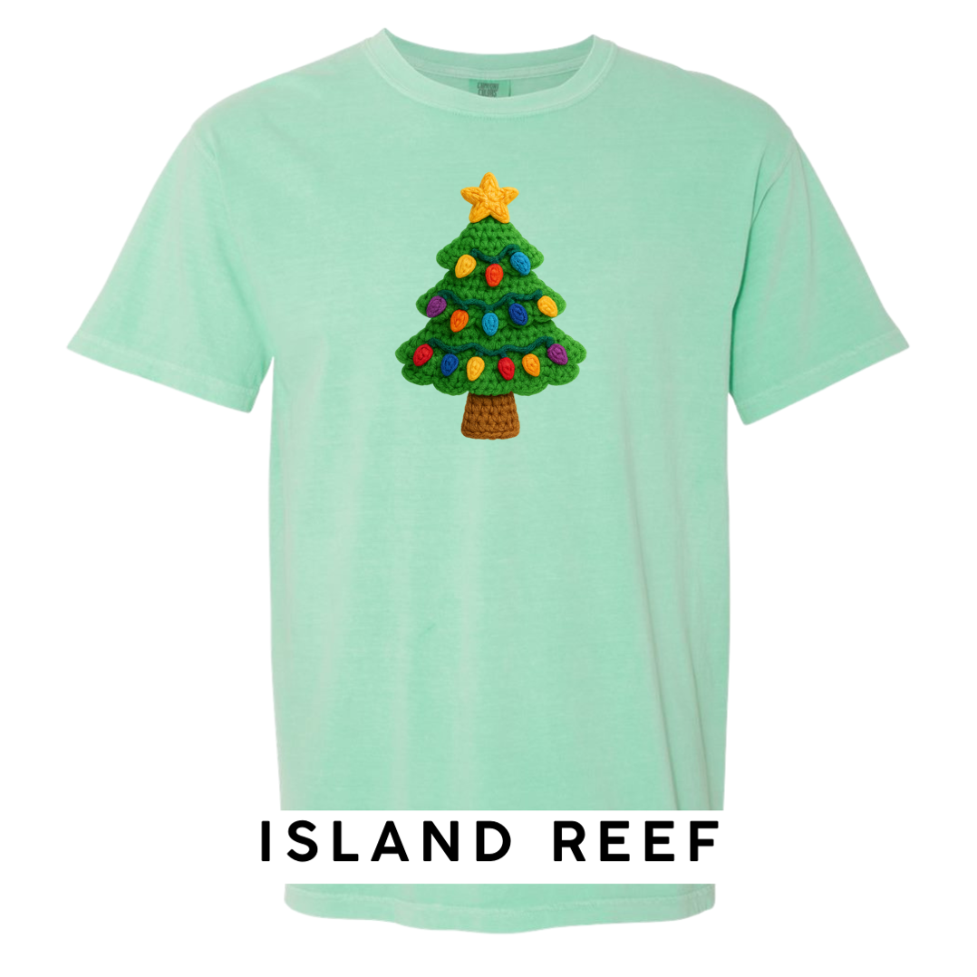 This adorable chunky-knit Christmas tree shines bright with multicolor retro lights and a soft golden star topper. It’s the perfect cozy holiday design for anyone who loves colorful, cheerful Christmas décor.
