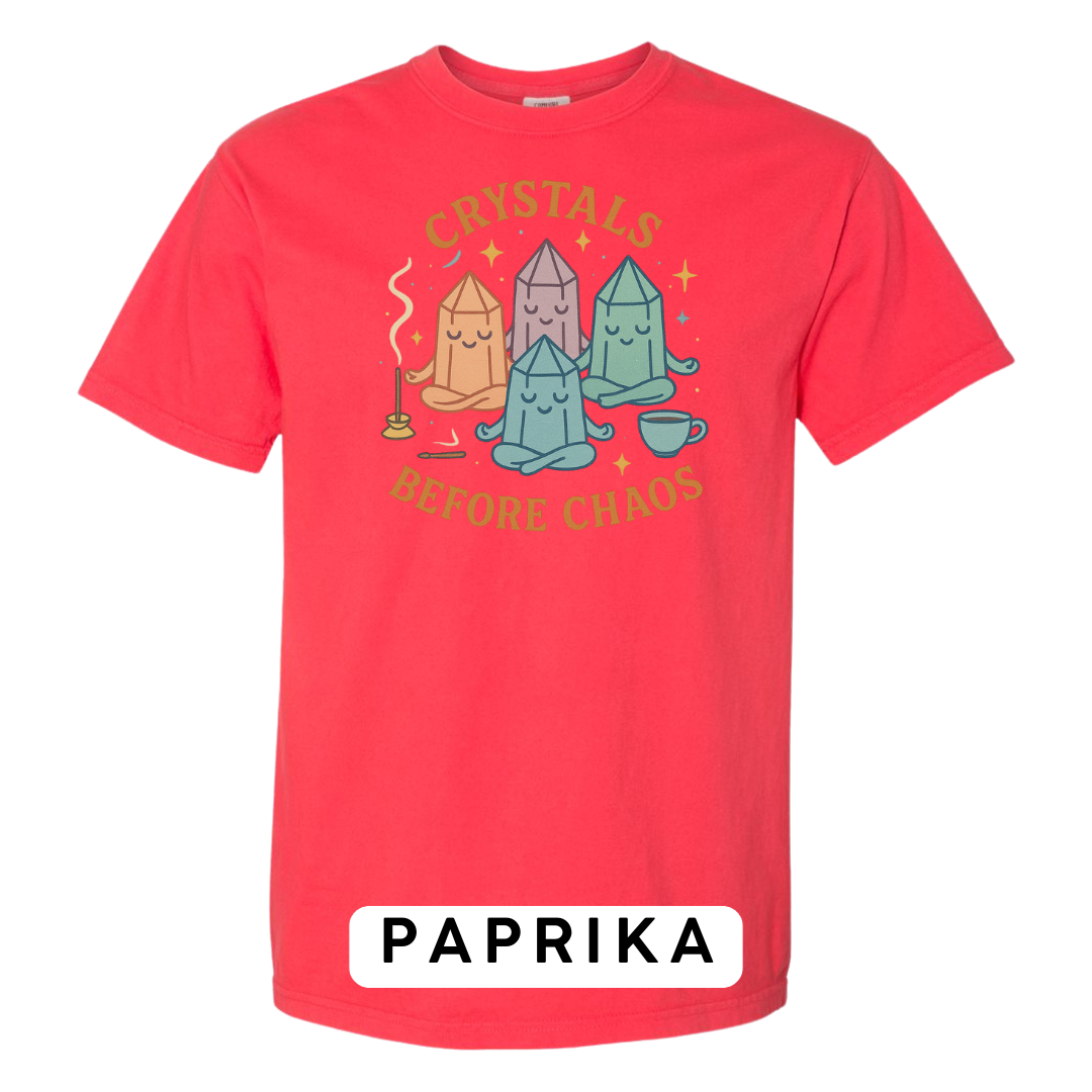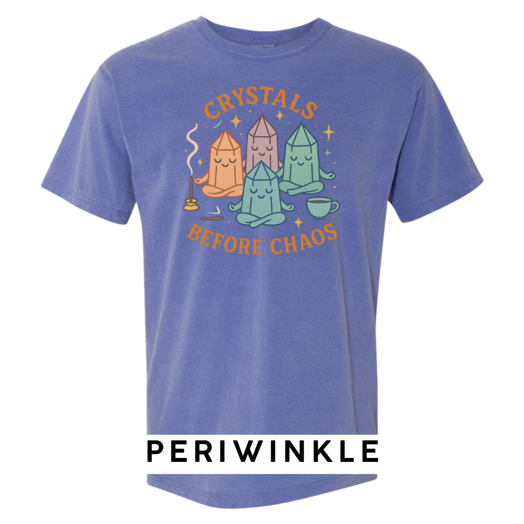 Say hello to your new spiritual staple—our Crystals Before Chaos Graphic Tee, designed for the mindful, the magical, and anyone who needs a little zen before the day begins. Featuring adorable meditating crystal characters surrounded by incense, tea, and calming vibes, this tee is a lighthearted reminder to ground yourself before taking on the world.