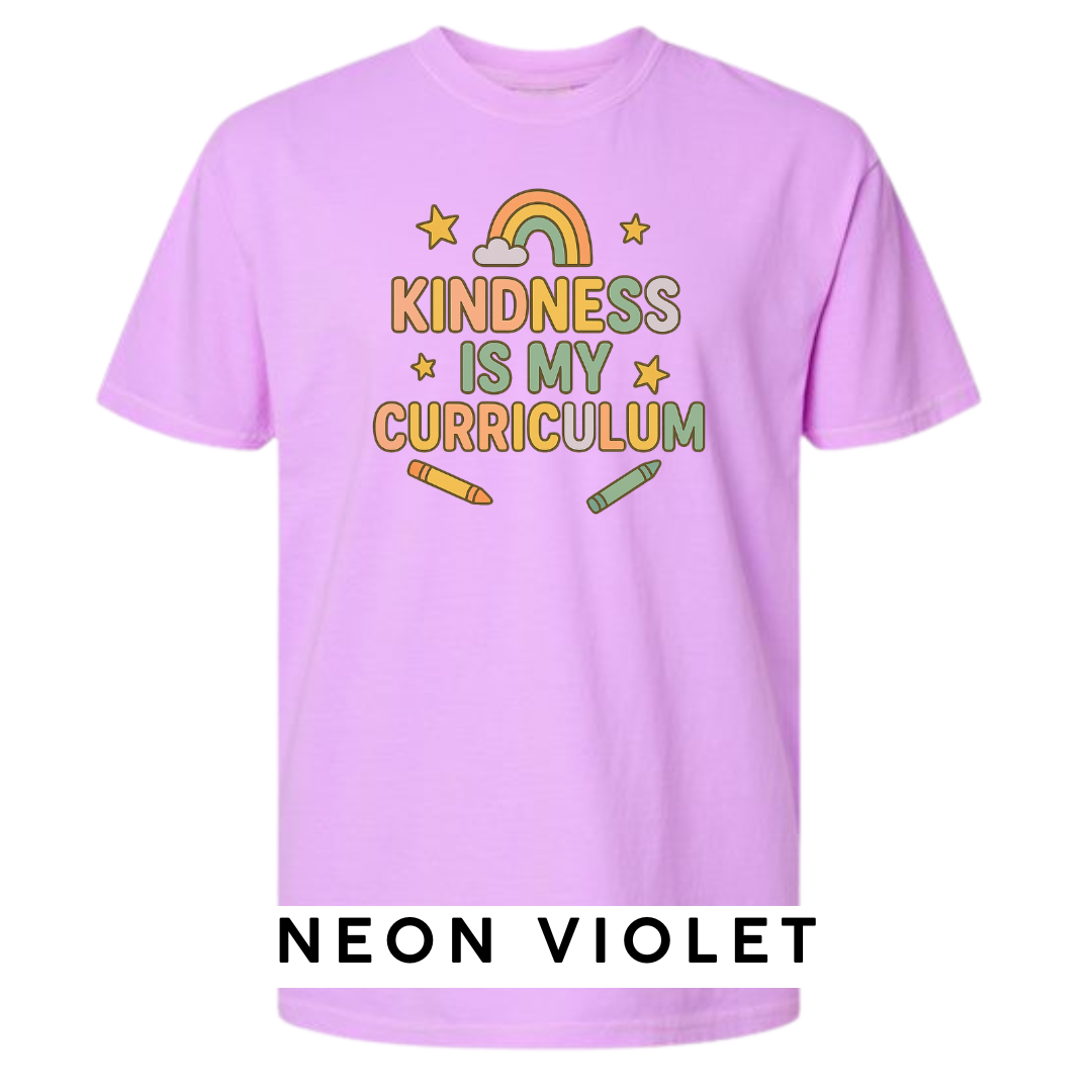 Teach with heart in our Kindness Is My Curriculum tee—a sweet and colorful design for educators who believe compassion belongs in every classroom. Featuring pastel crayon accents, a rainbow, and playful lettering, this tee spreads positivity with every wear.