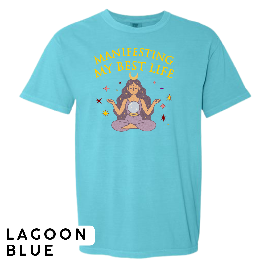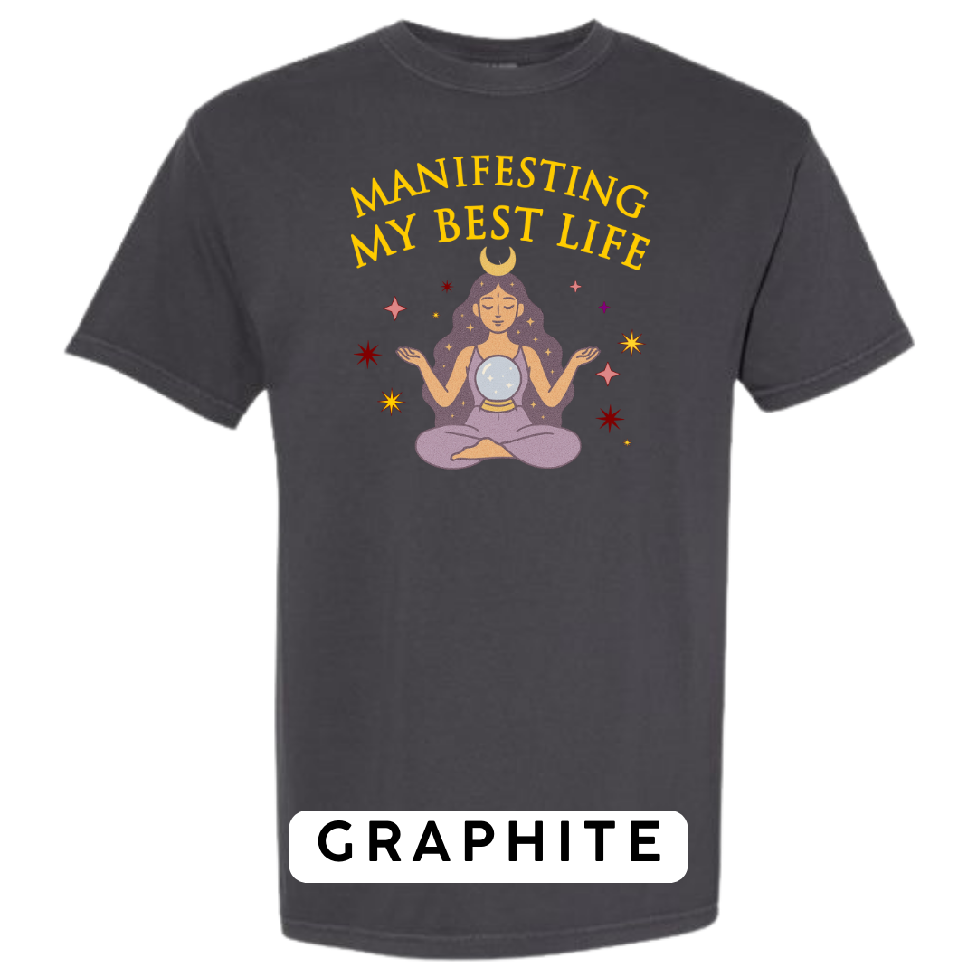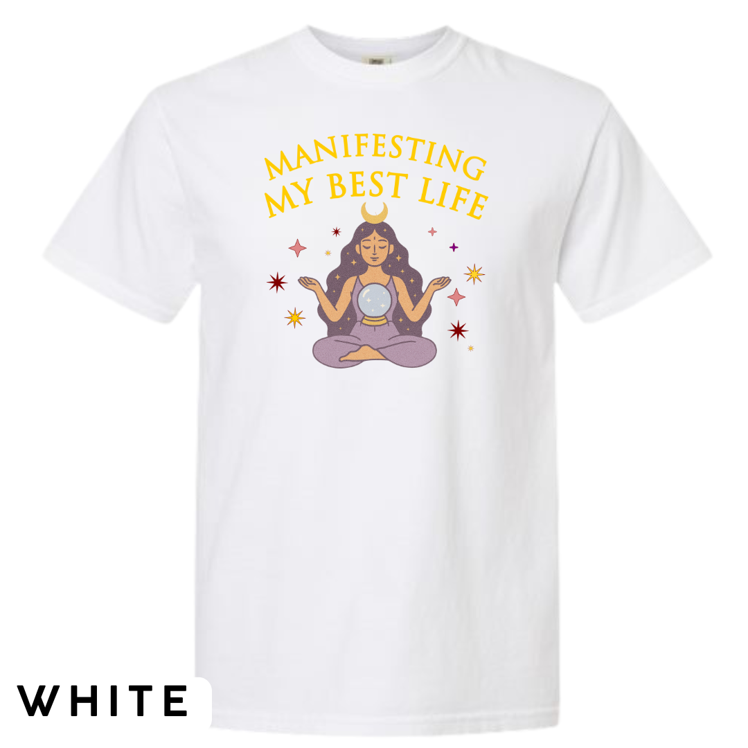 Your vibe is your power, and this tee says it all. The Manifesting My Best Life Graphic Tee is made for spiritual babes, cosmic dreamers, and manifesting queens who are calling in their highest timelines. Featuring a serene goddess-like figure meditating with a crystal ball, surrounded by celestial sparkles and lunar magic, this shirt radiates intention, alignment, and next-level energy.