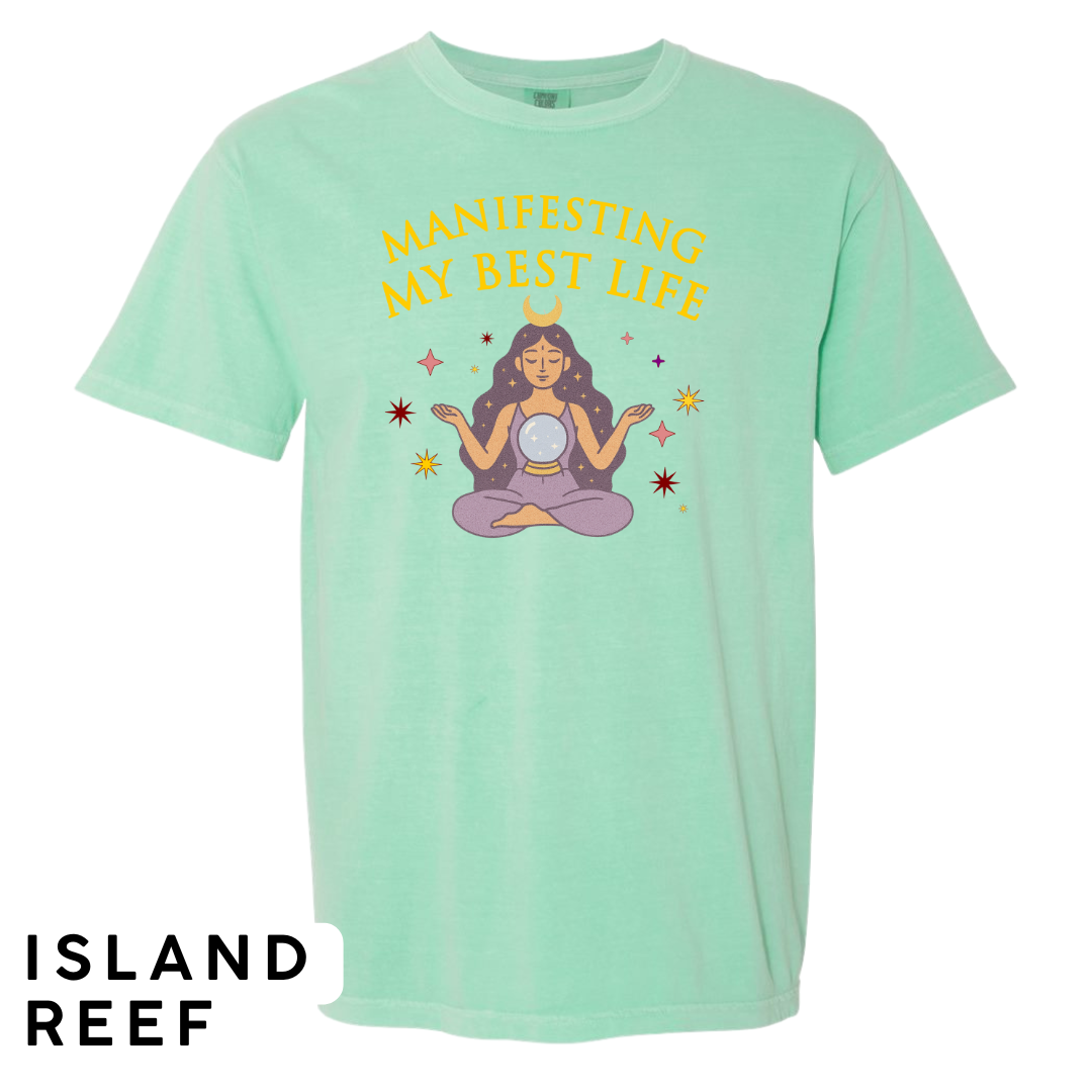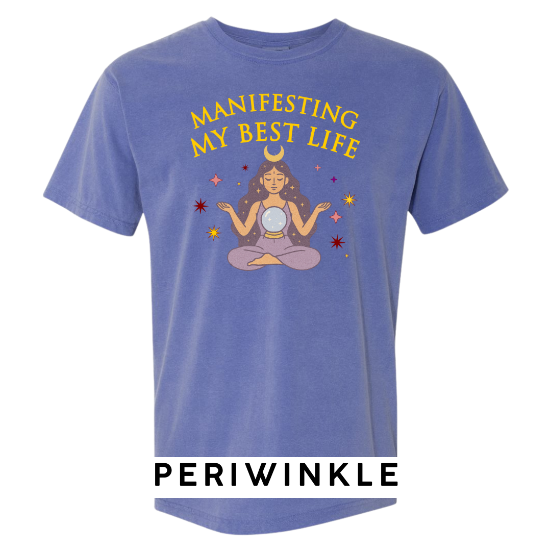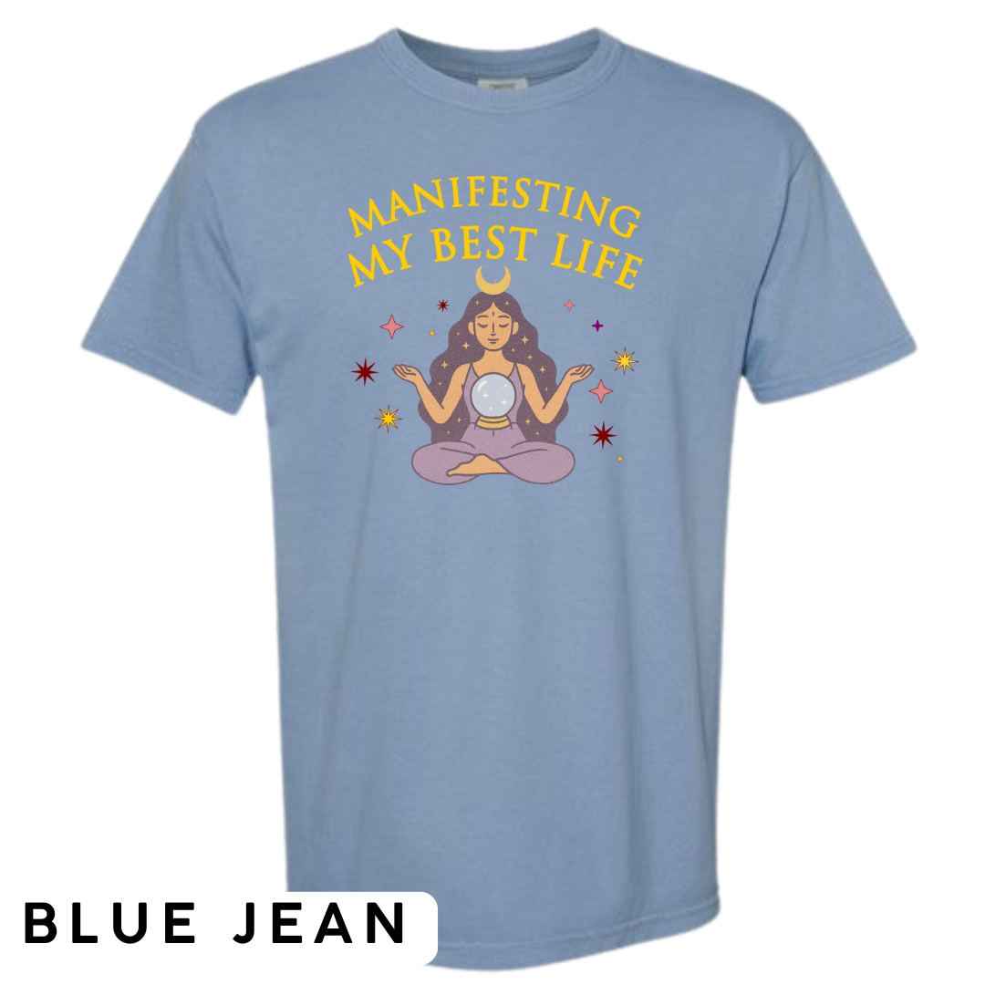 Your vibe is your power, and this tee says it all. The Manifesting My Best Life Graphic Tee is made for spiritual babes, cosmic dreamers, and manifesting queens who are calling in their highest timelines. Featuring a serene goddess-like figure meditating with a crystal ball, surrounded by celestial sparkles and lunar magic, this shirt radiates intention, alignment, and next-level energy.