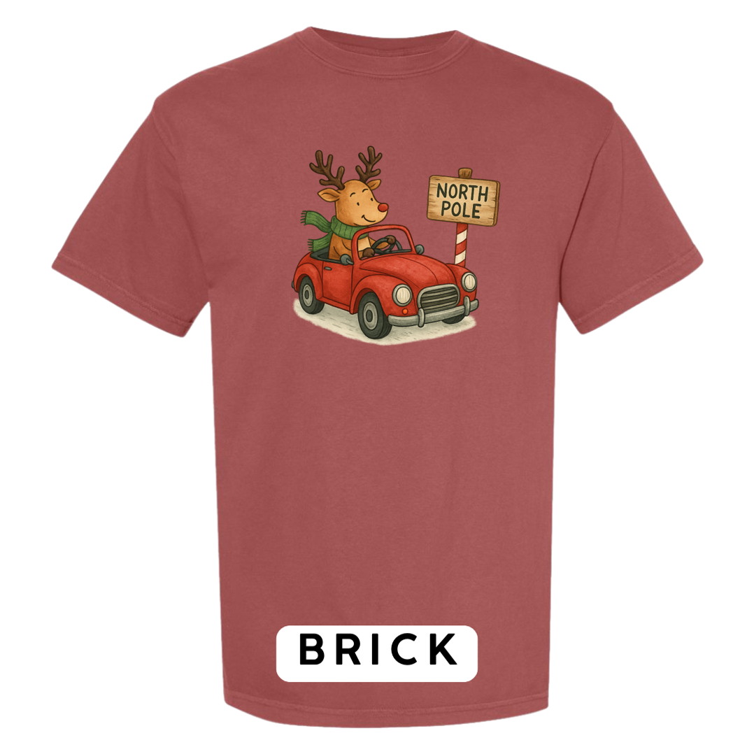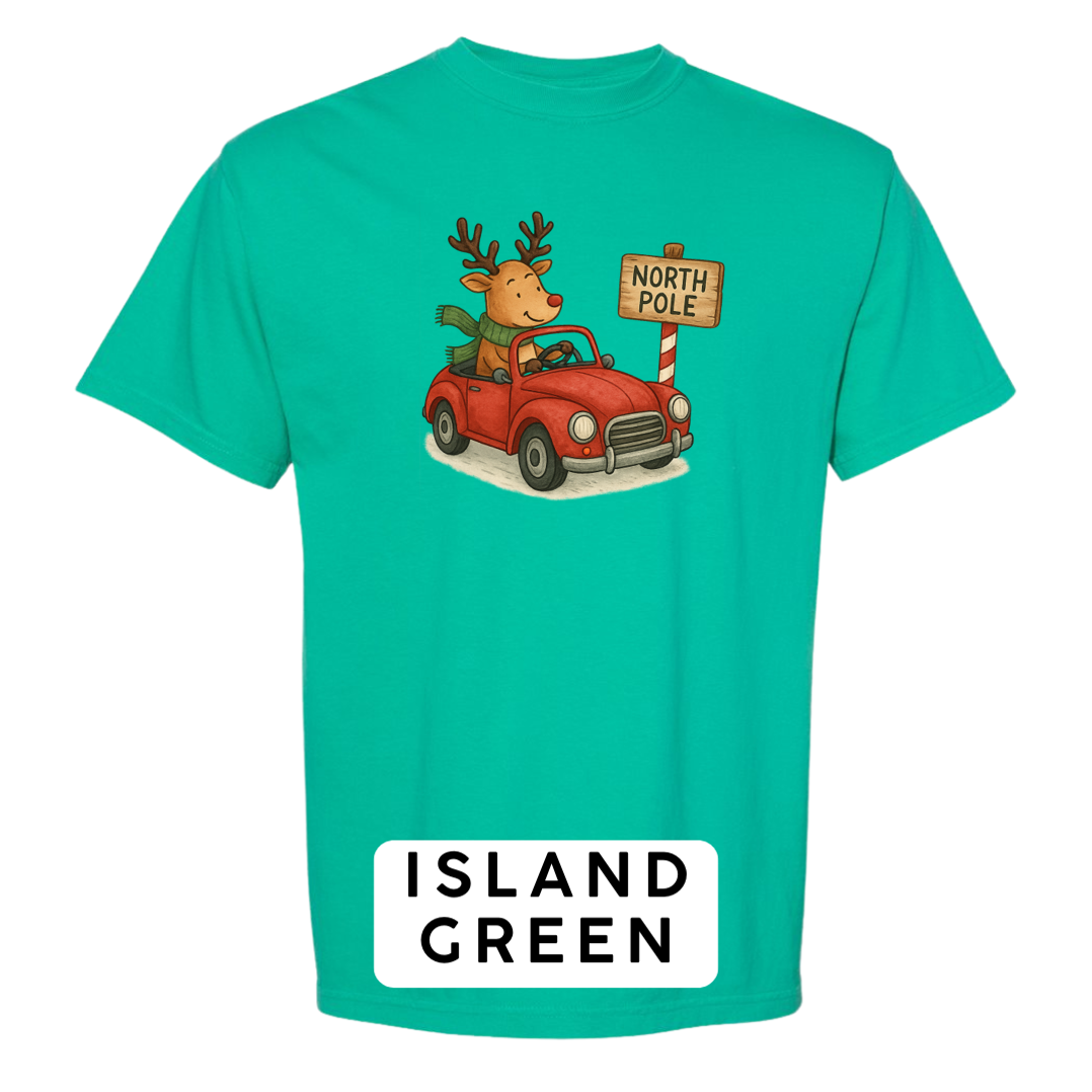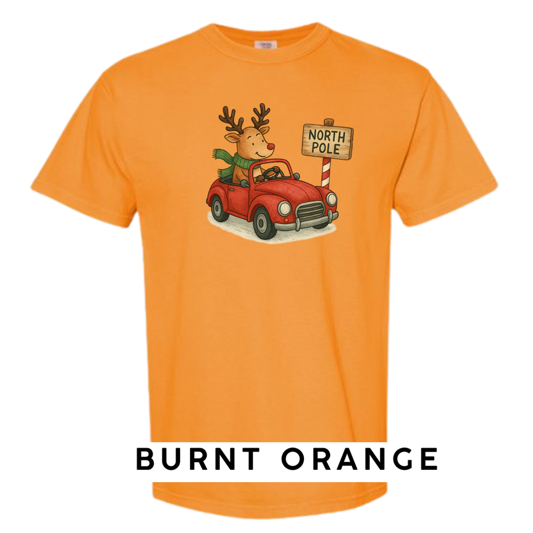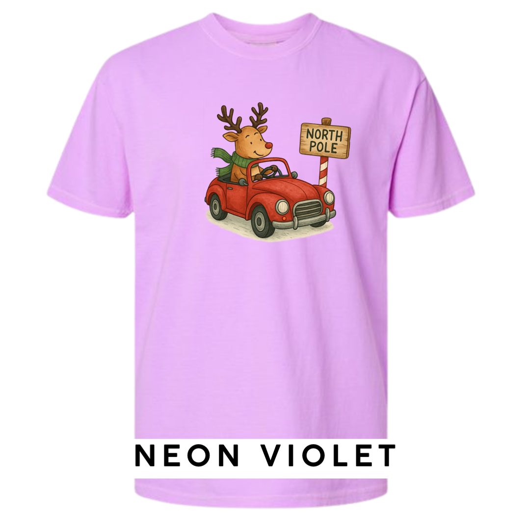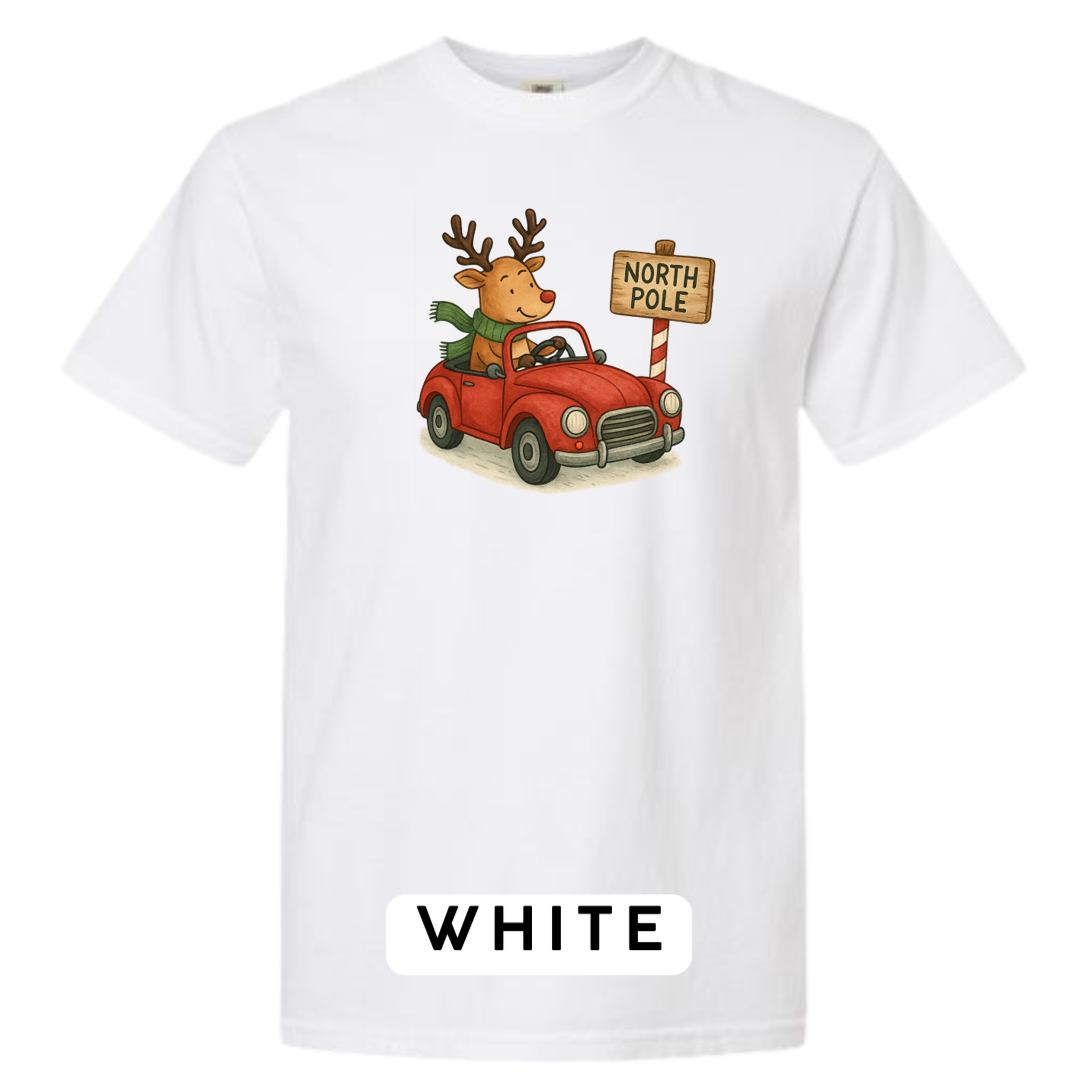 Bring holiday cheer wherever you go with this playful design featuring a jolly reindeer driving a classic red car straight to the North Pole. With his green scarf blowing in the winter breeze and a smile full of festive spirit, this design is the perfect blend of Christmas magic and fun.