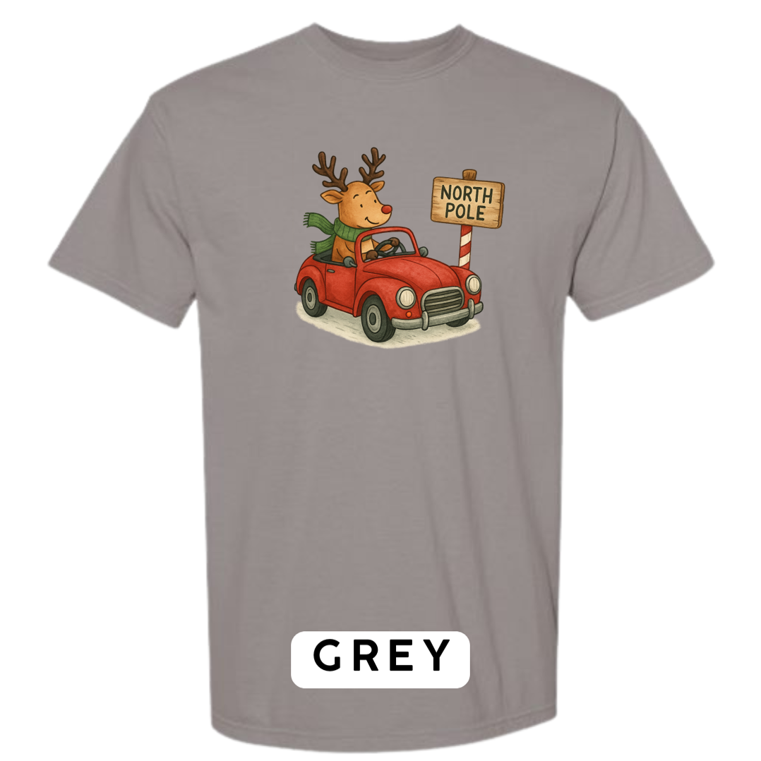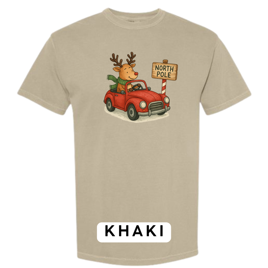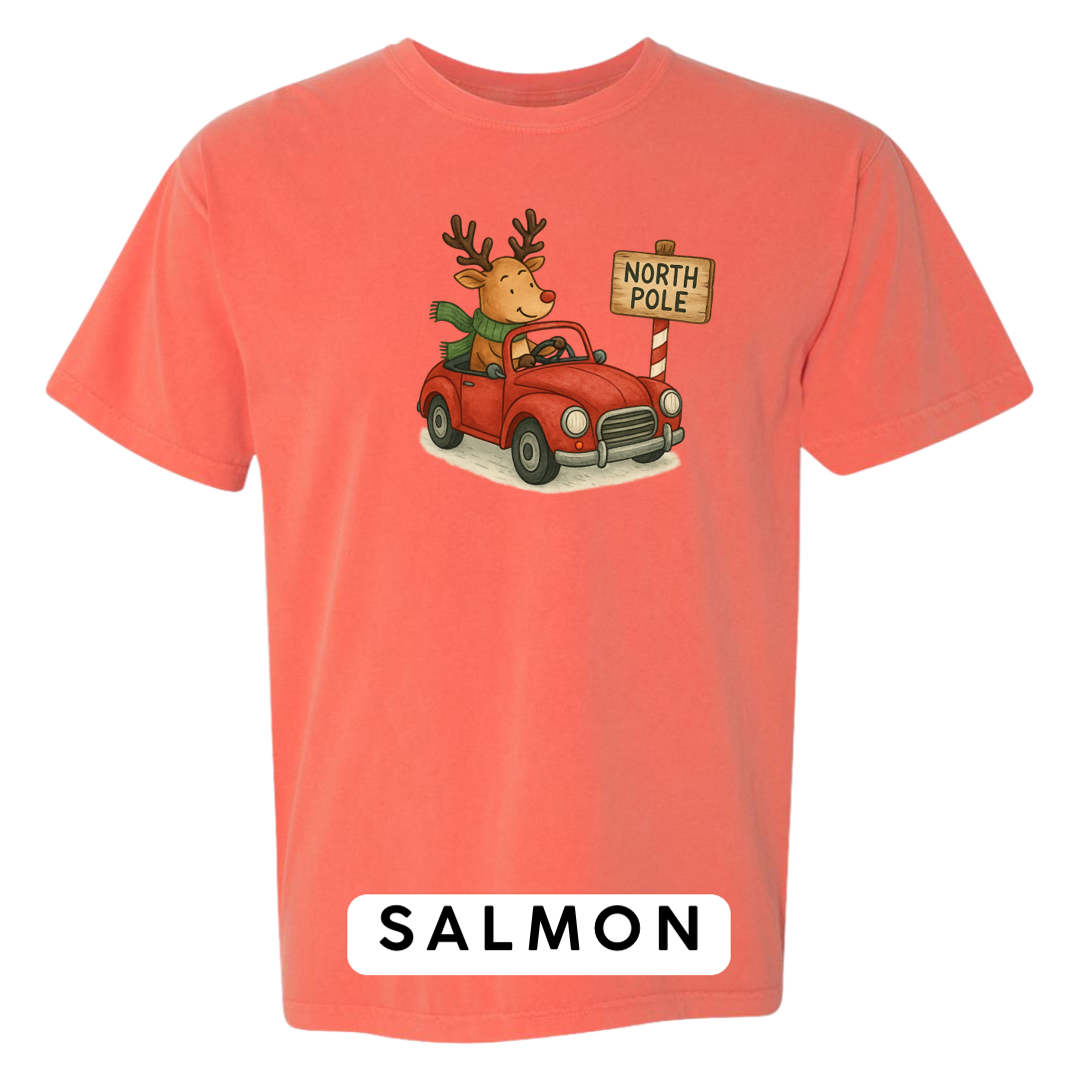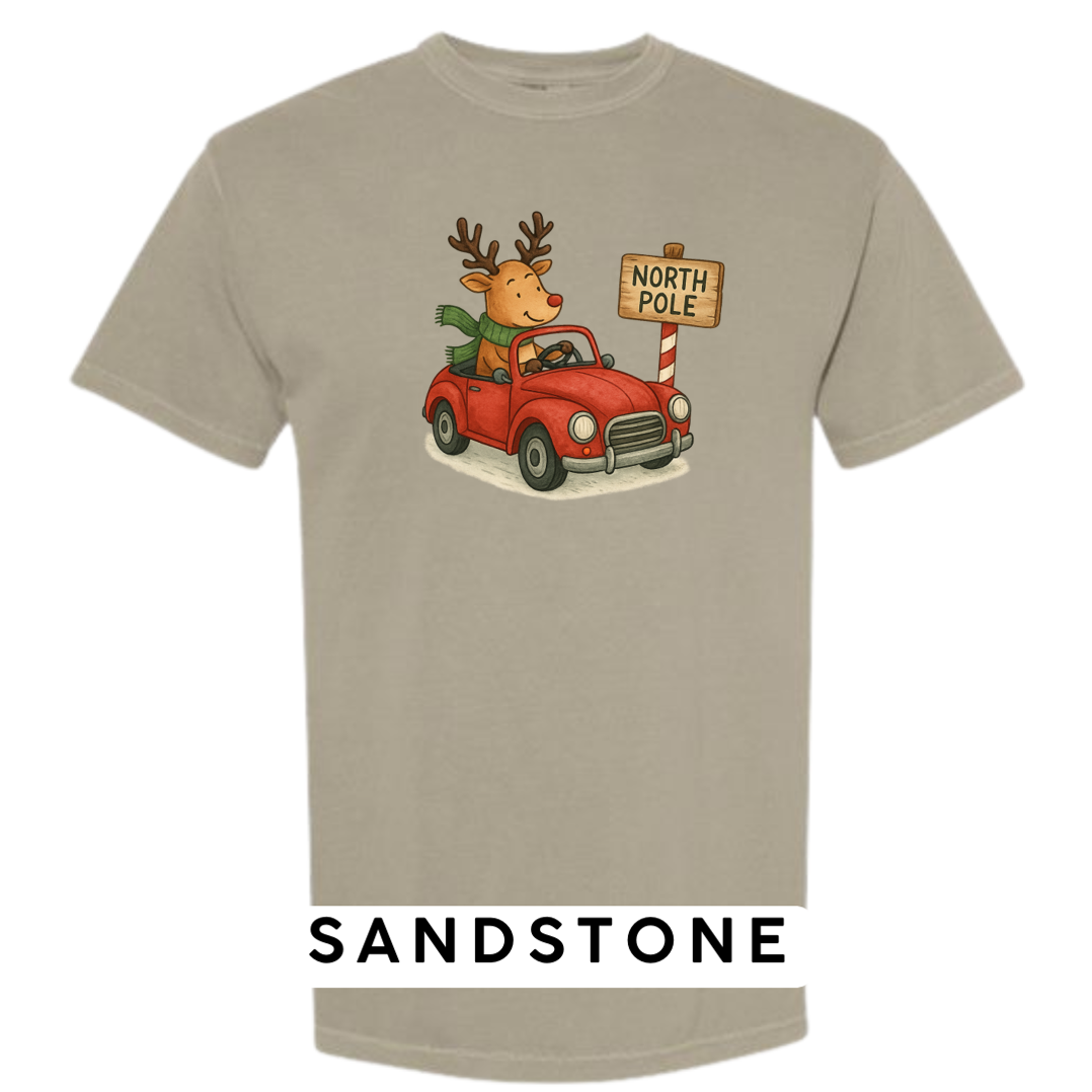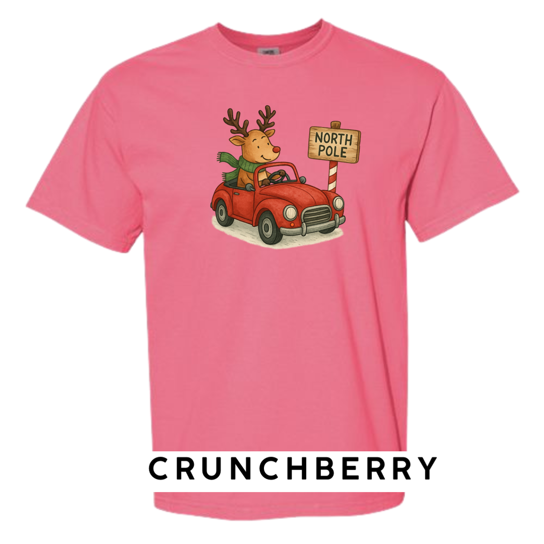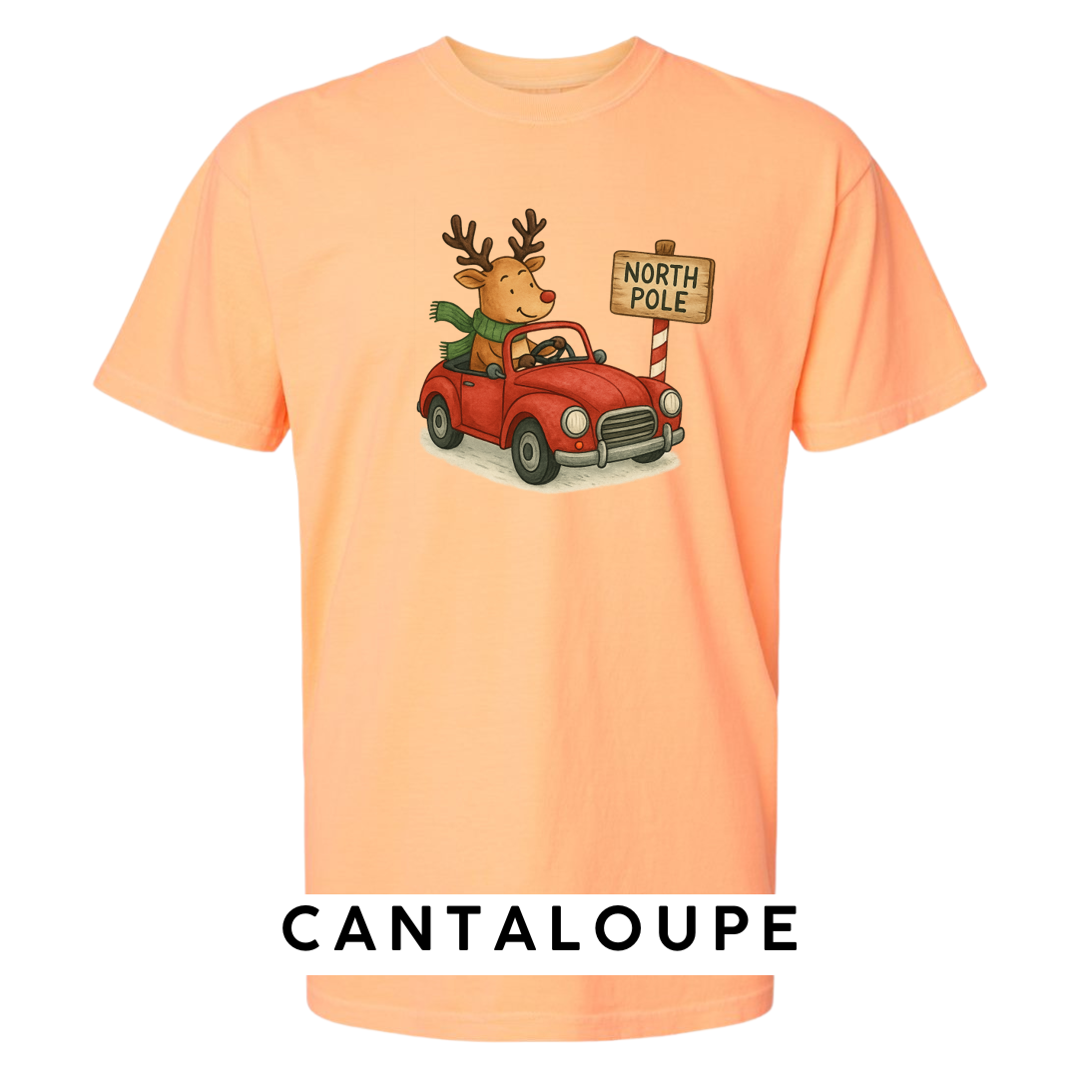 Bring holiday cheer wherever you go with this playful design featuring a jolly reindeer driving a classic red car straight to the North Pole. With his green scarf blowing in the winter breeze and a smile full of festive spirit, this design is the perfect blend of Christmas magic and fun.