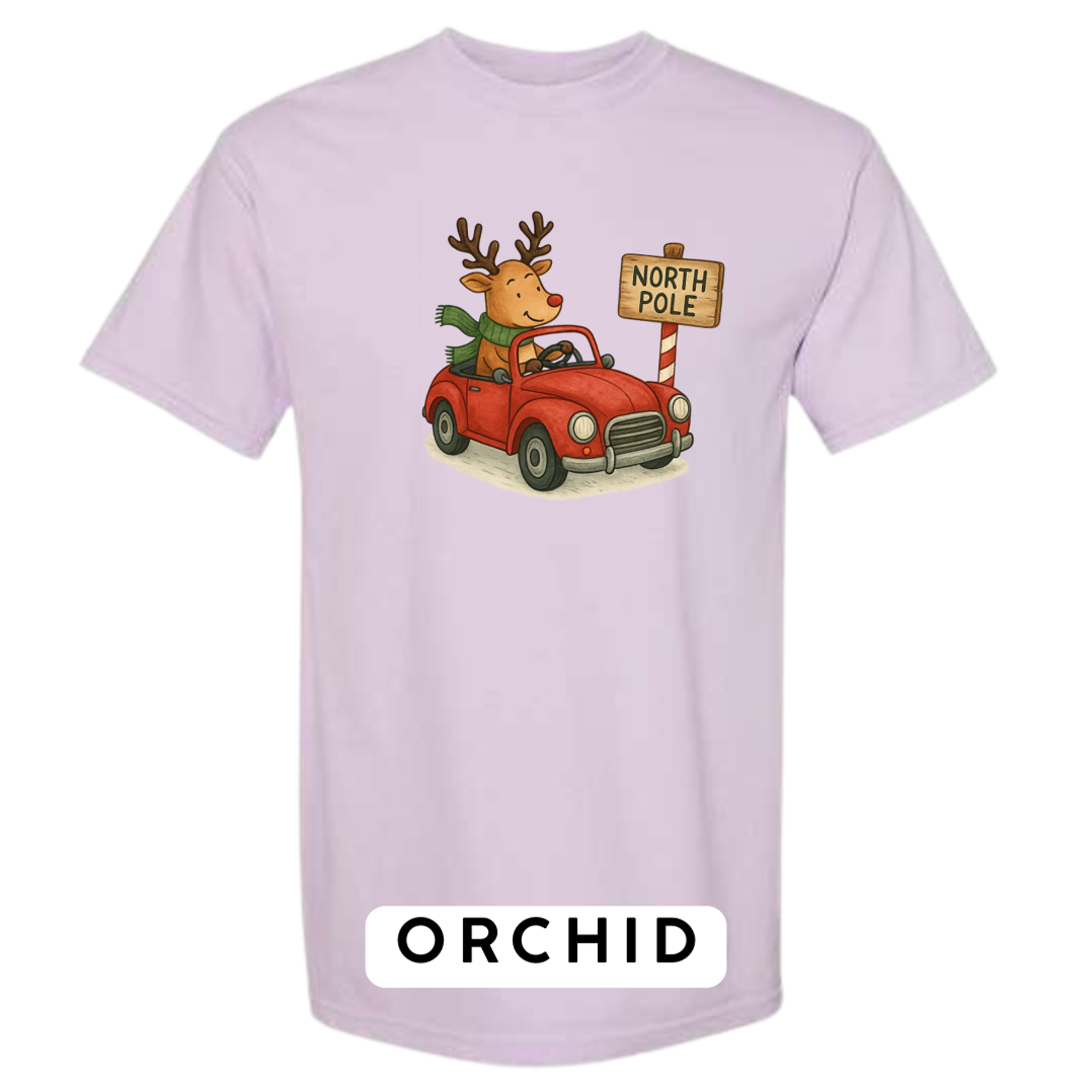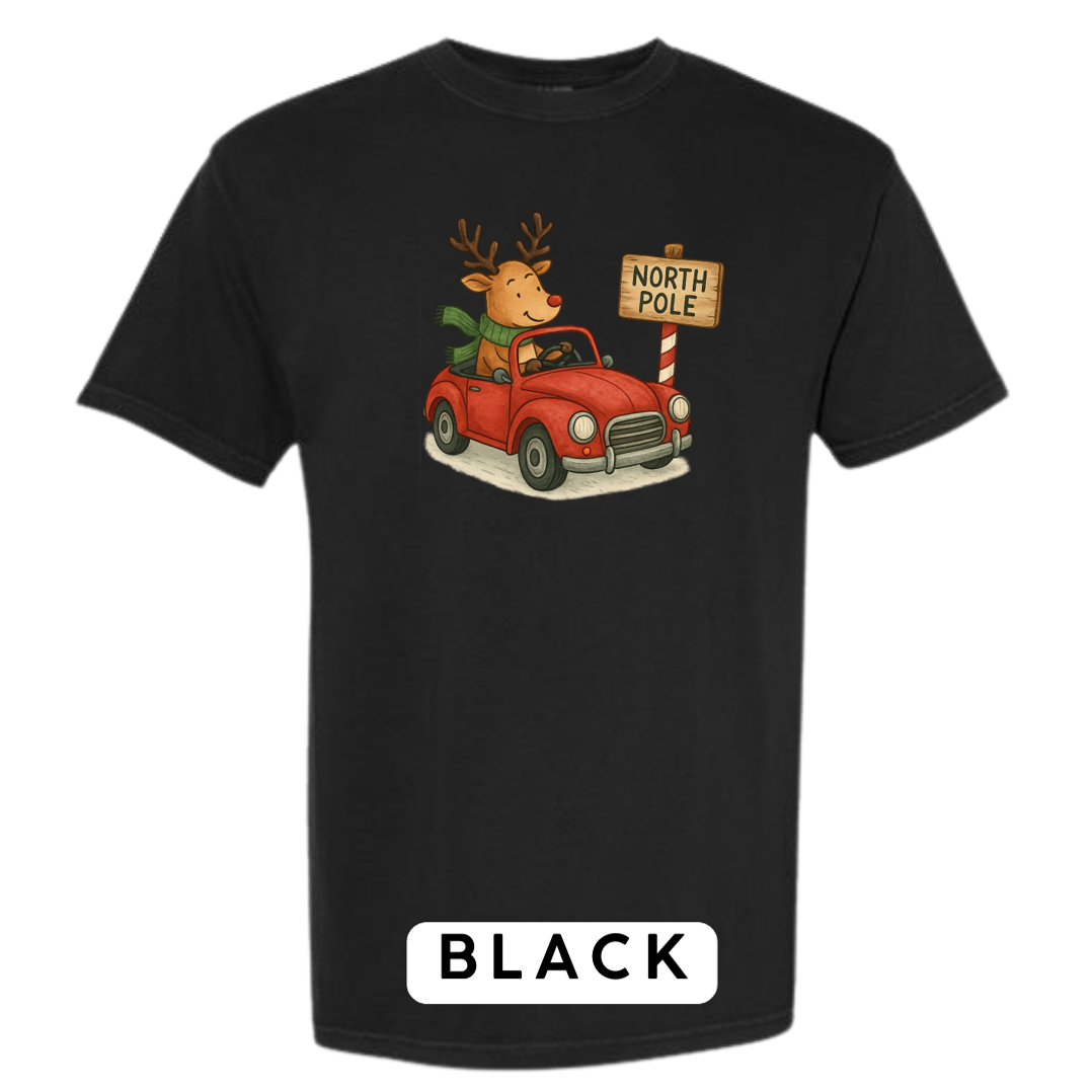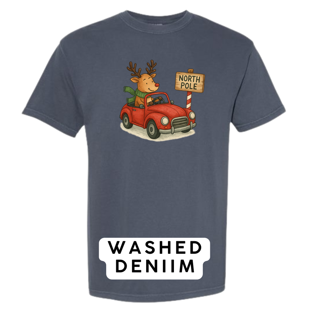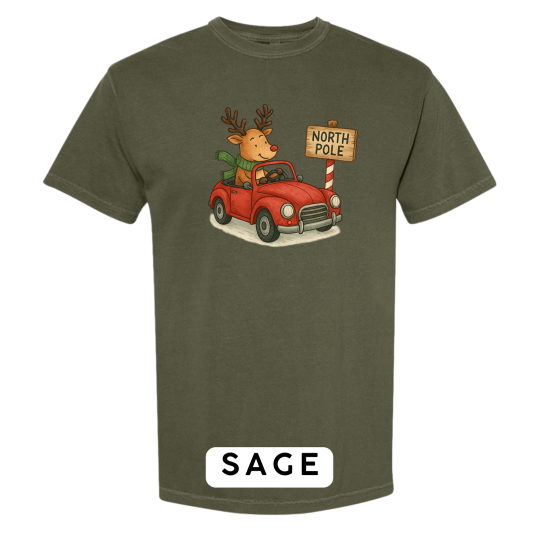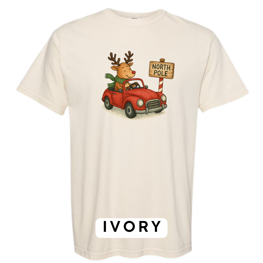 Bring holiday cheer wherever you go with this playful design featuring a jolly reindeer driving a classic red car straight to the North Pole. With his green scarf blowing in the winter breeze and a smile full of festive spirit, this design is the perfect blend of Christmas magic and fun.