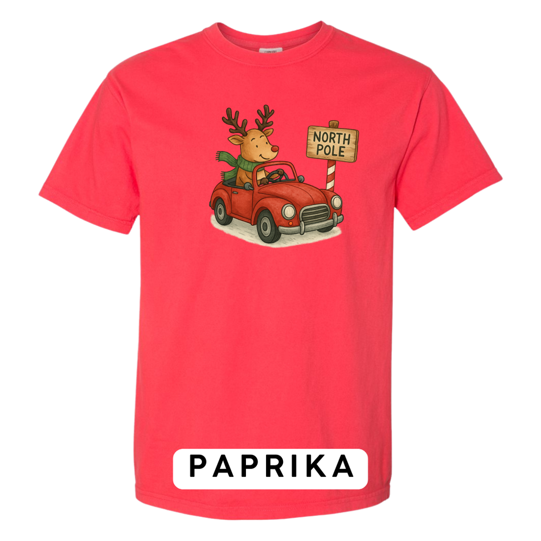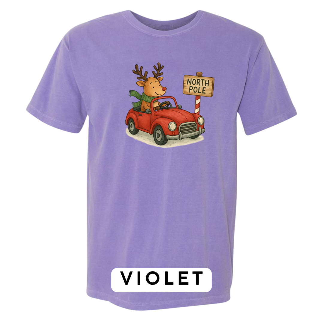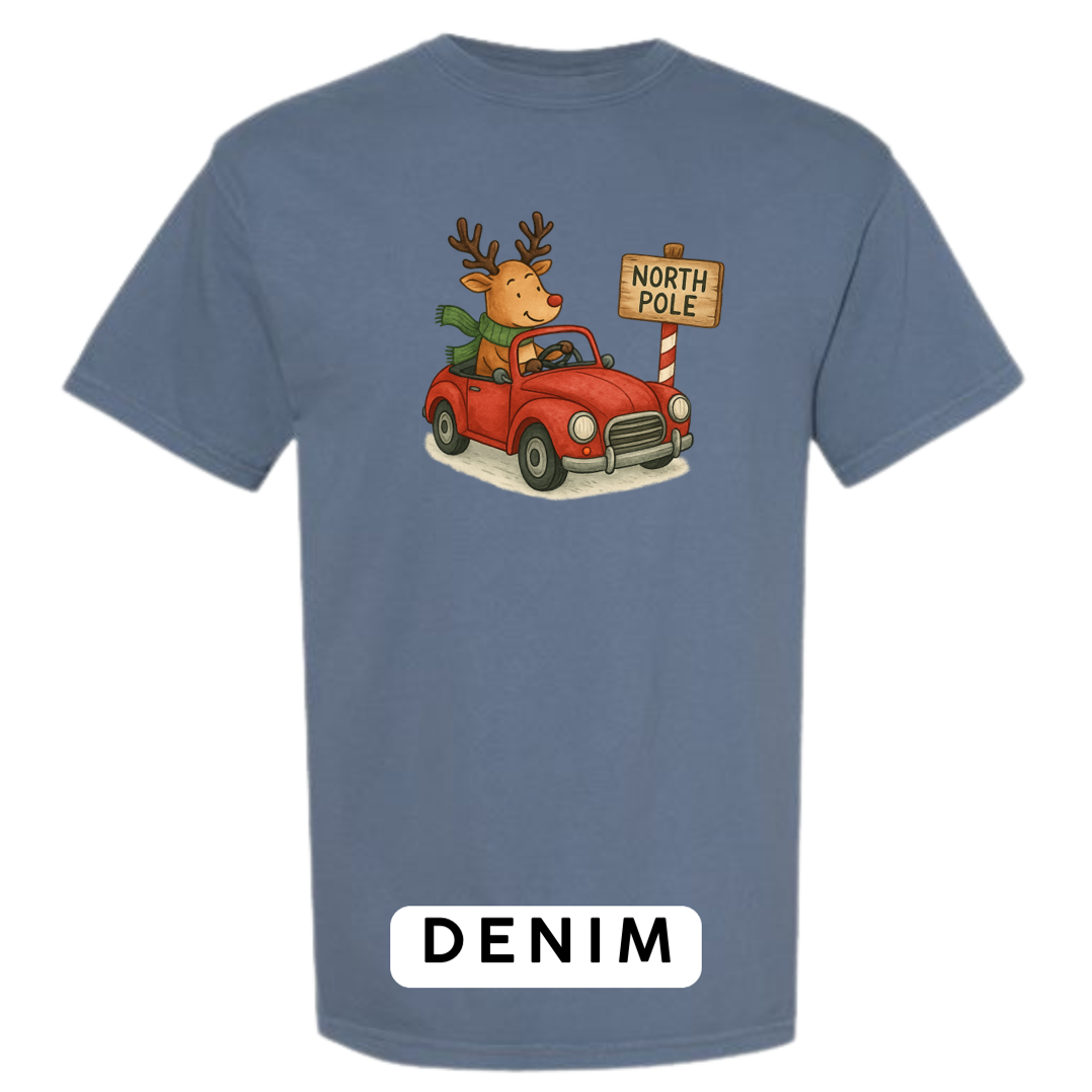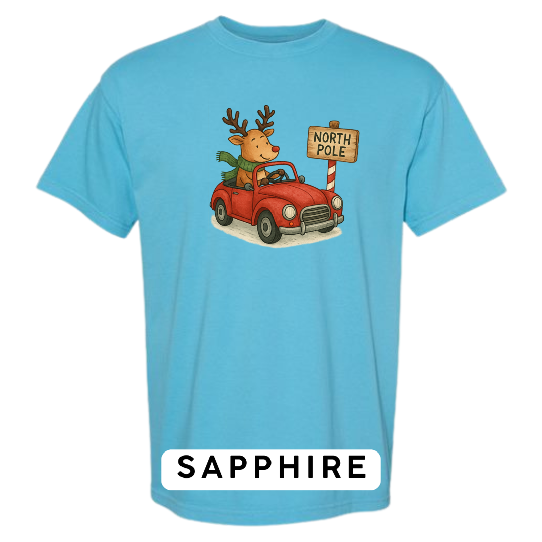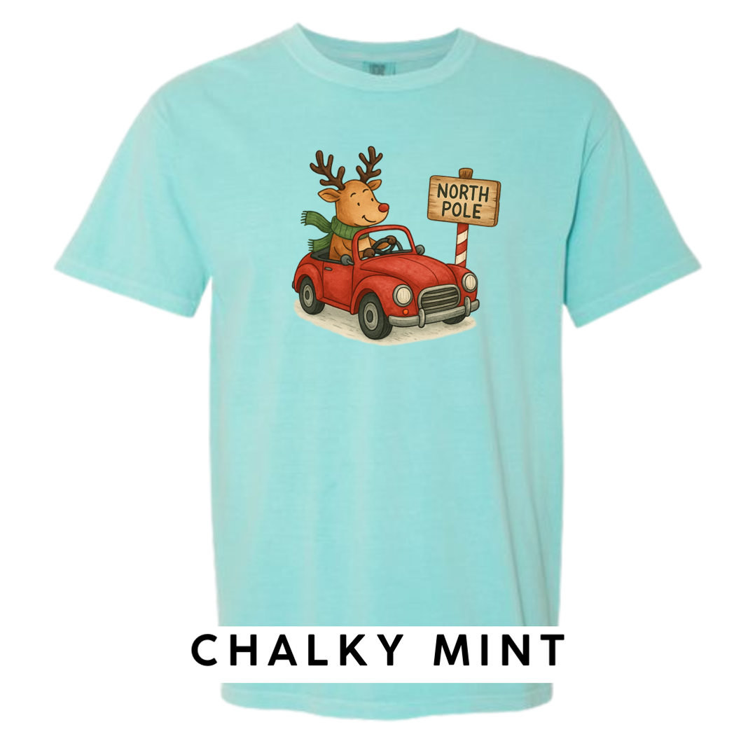Bring holiday cheer wherever you go with this playful design featuring a jolly reindeer driving a classic red car straight to the North Pole. With his green scarf blowing in the winter breeze and a smile full of festive spirit, this design is the perfect blend of Christmas magic and fun.