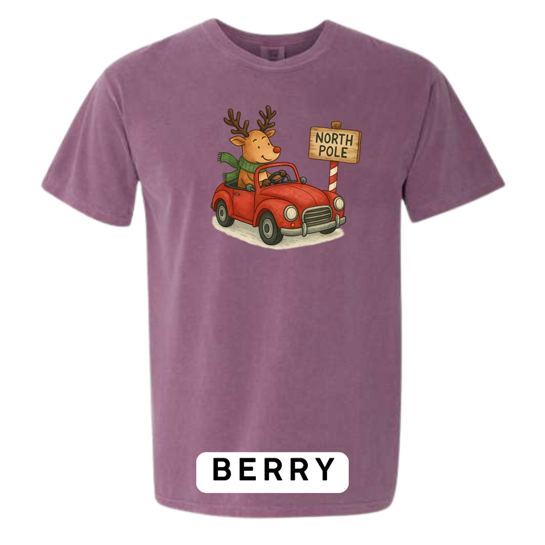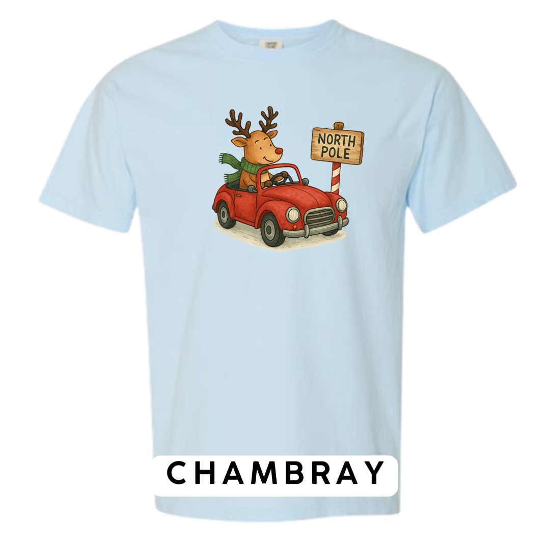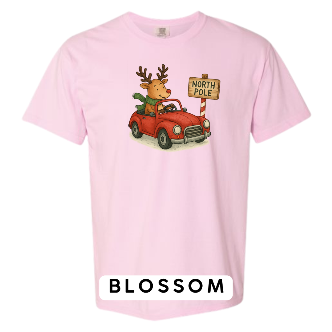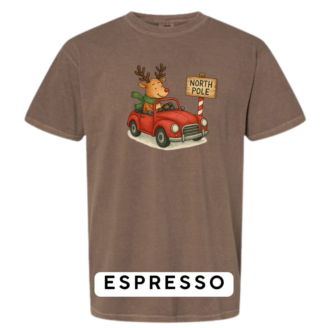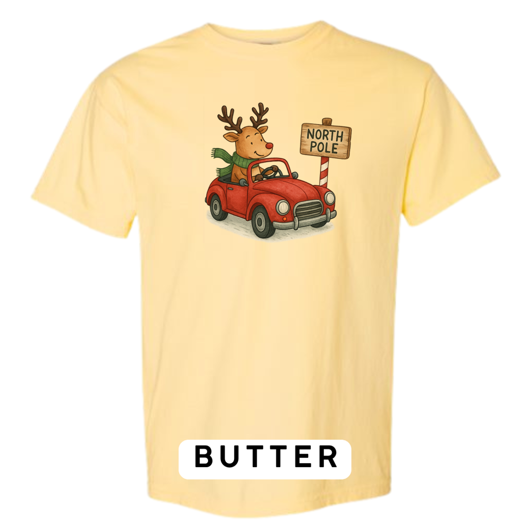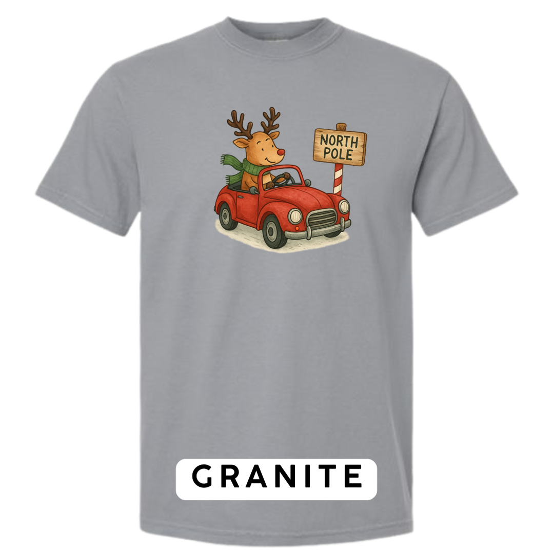Bring holiday cheer wherever you go with this playful design featuring a jolly reindeer driving a classic red car straight to the North Pole. With his green scarf blowing in the winter breeze and a smile full of festive spirit, this design is the perfect blend of Christmas magic and fun.