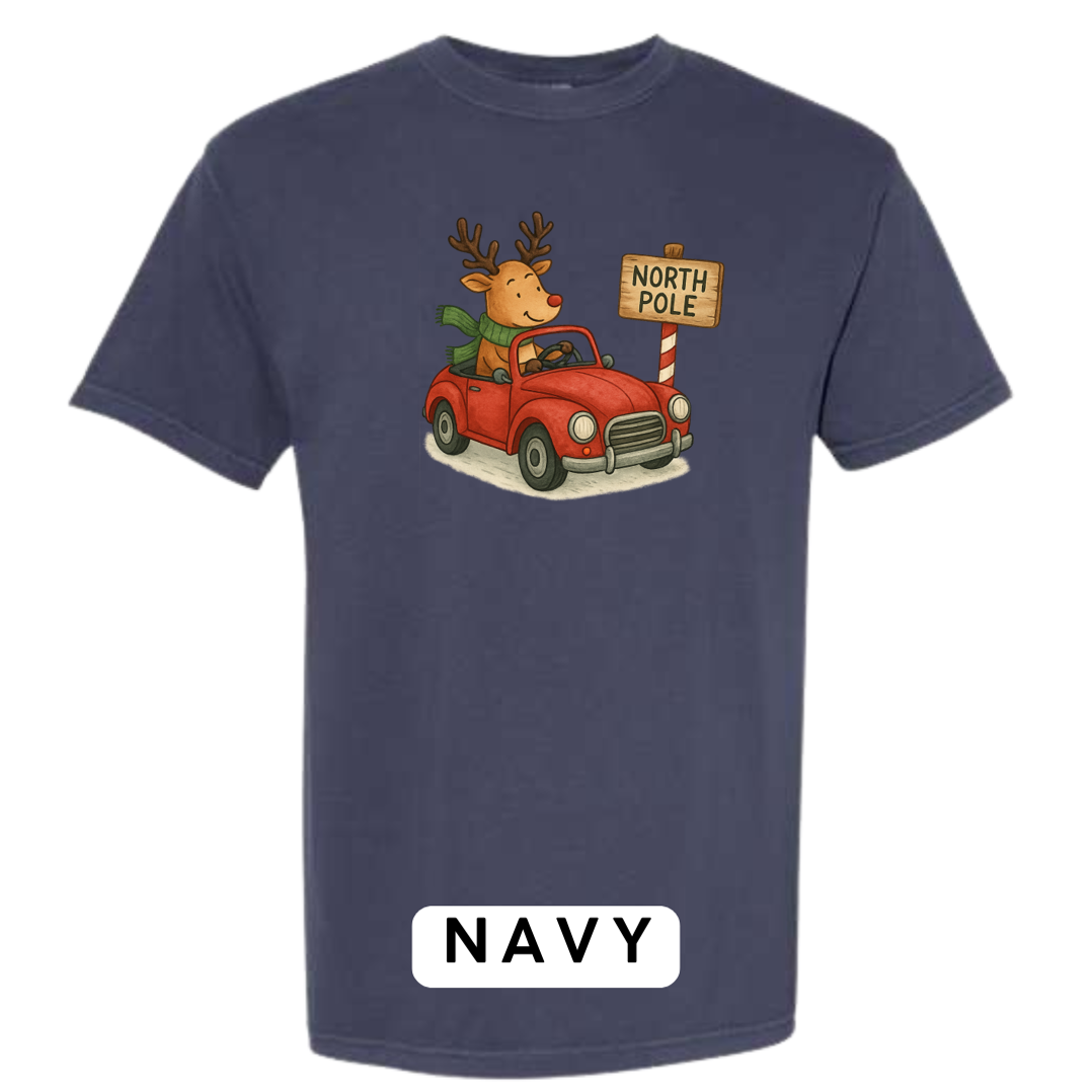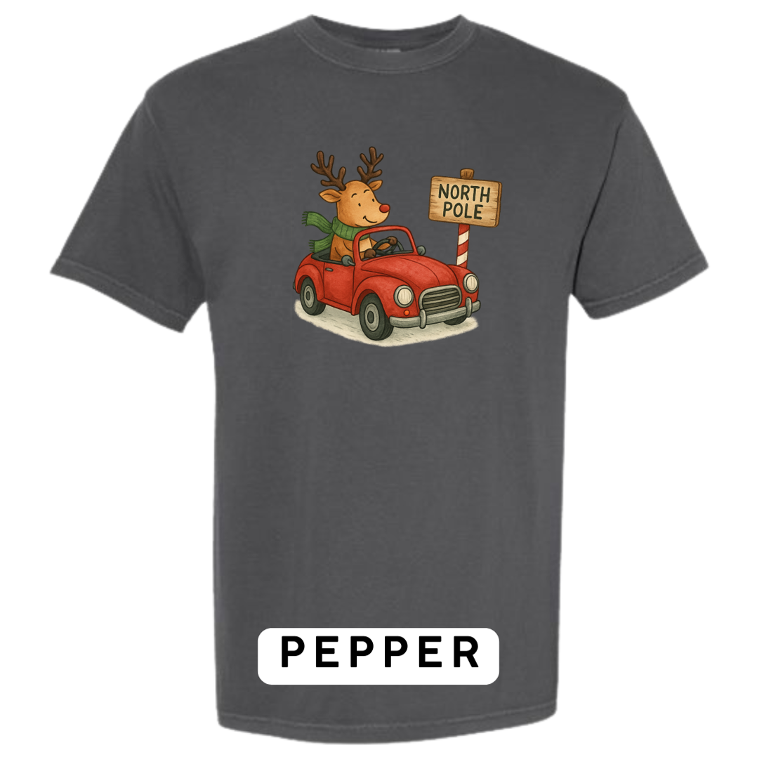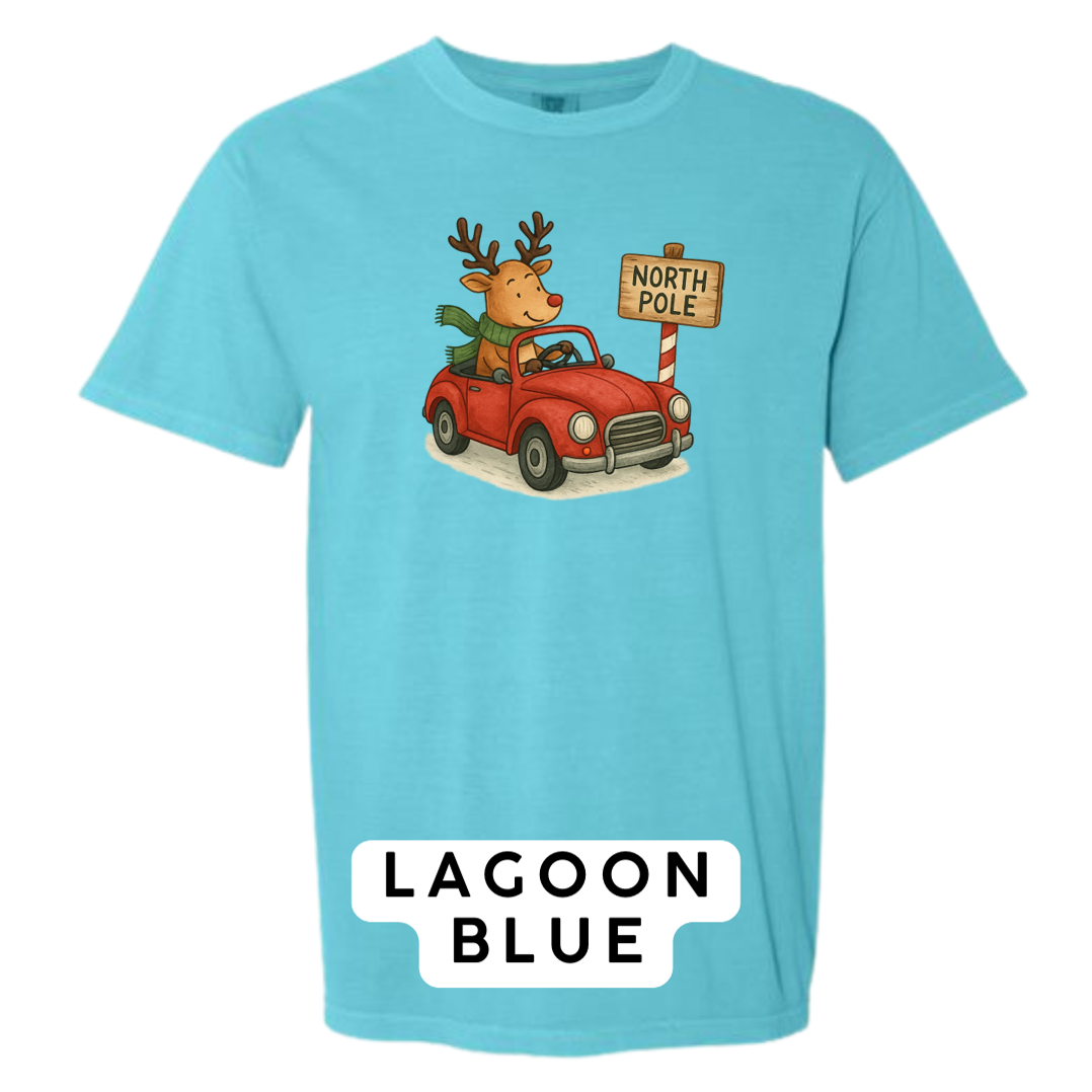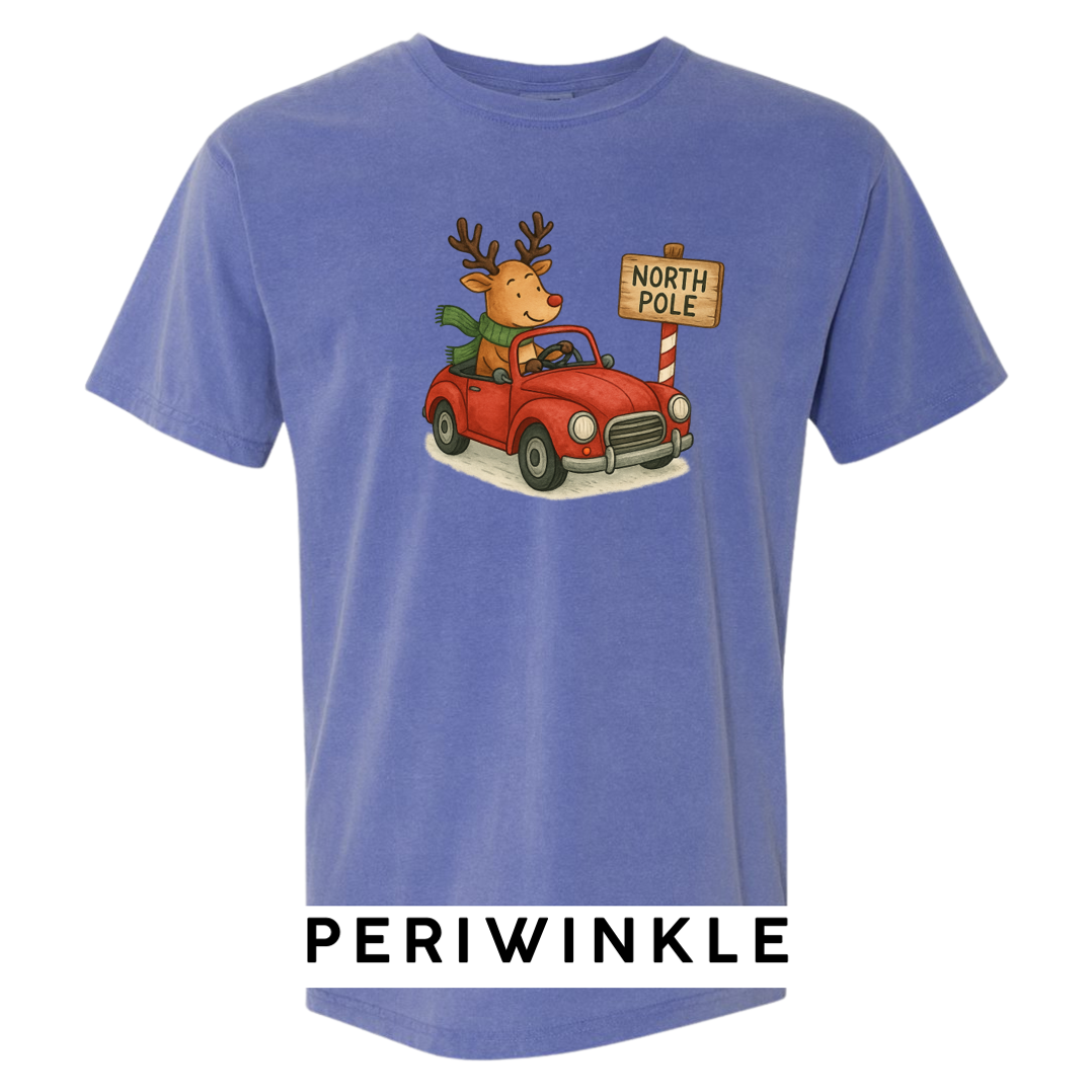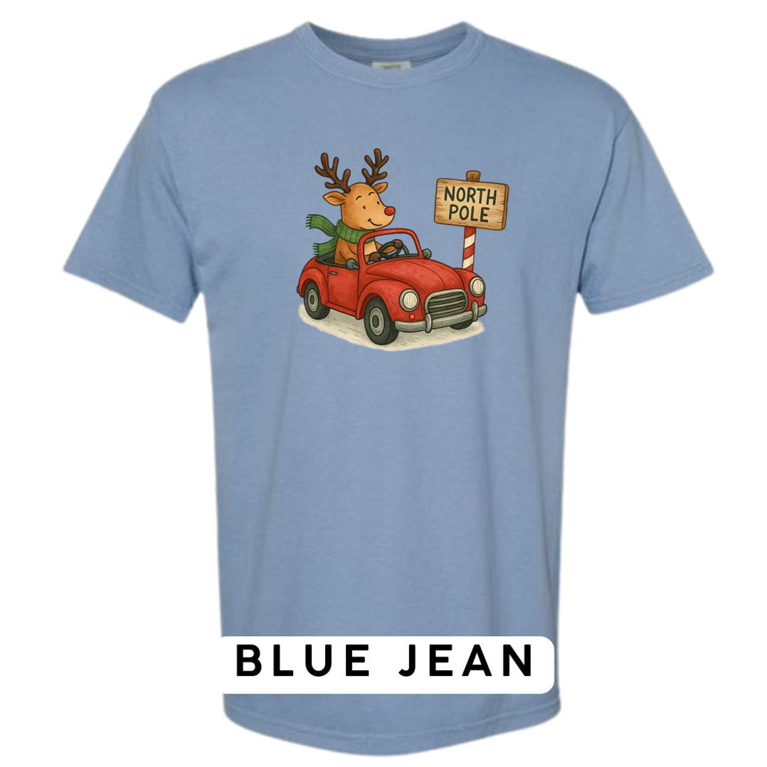 Bring holiday cheer wherever you go with this playful design featuring a jolly reindeer driving a classic red car straight to the North Pole. With his green scarf blowing in the winter breeze and a smile full of festive spirit, this design is the perfect blend of Christmas magic and fun.