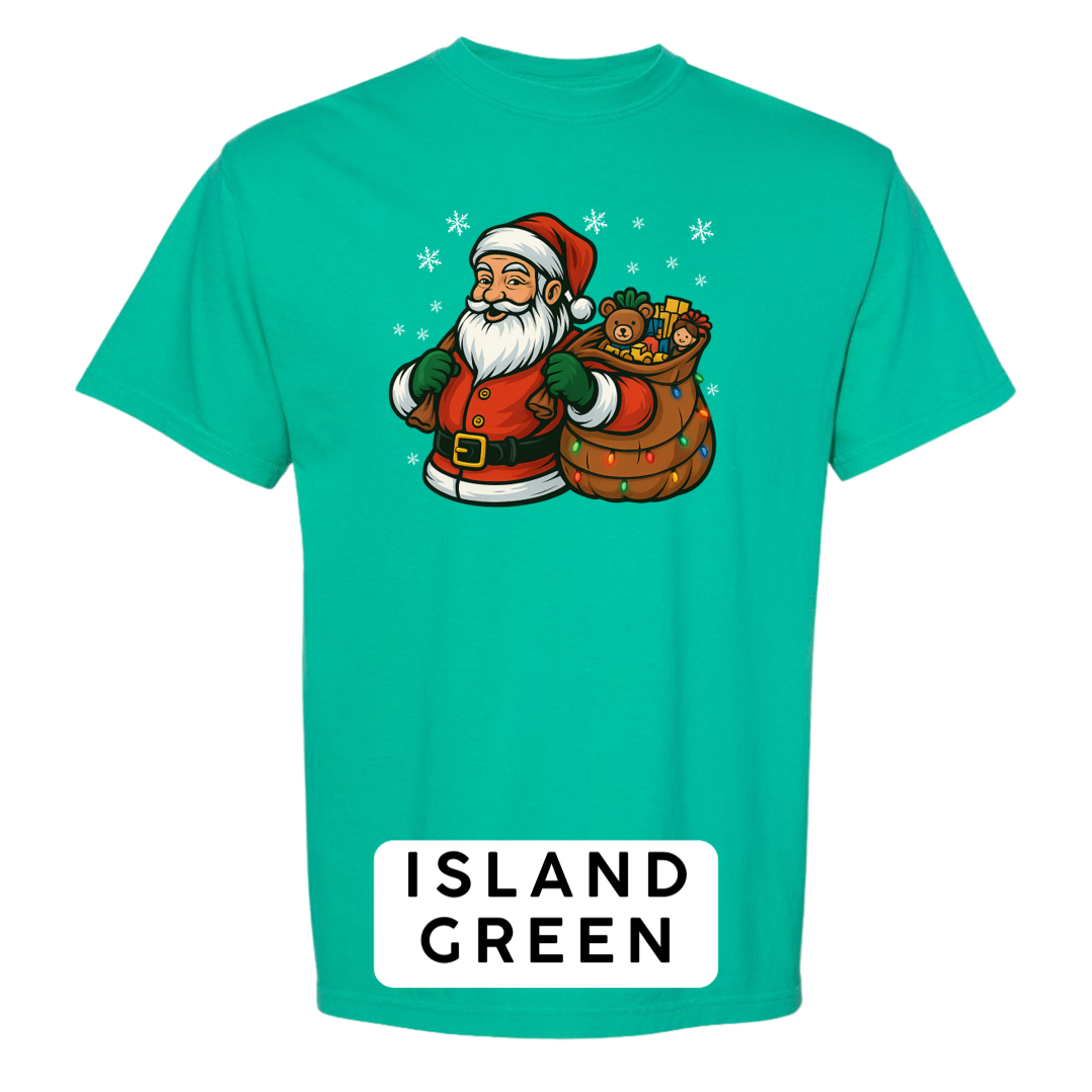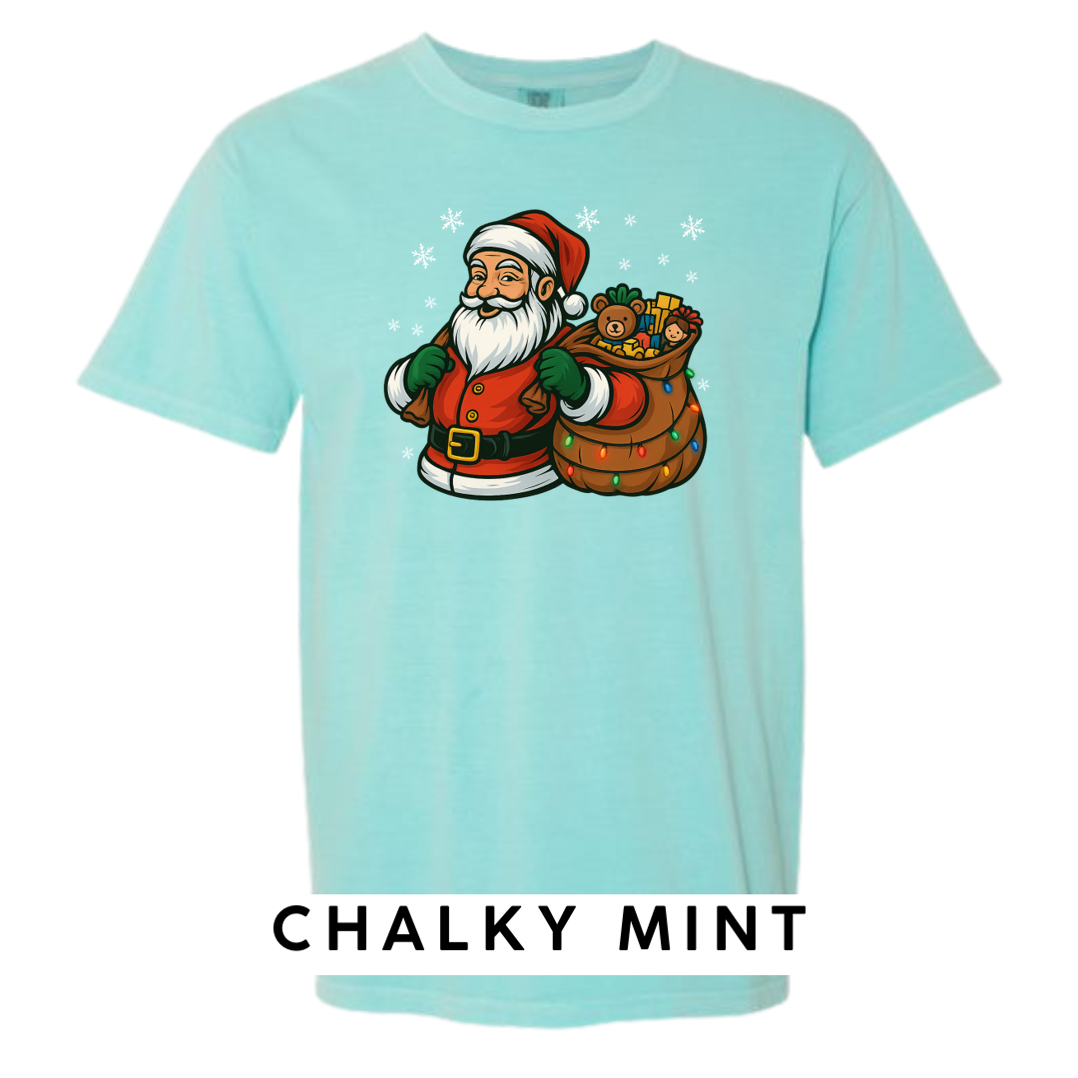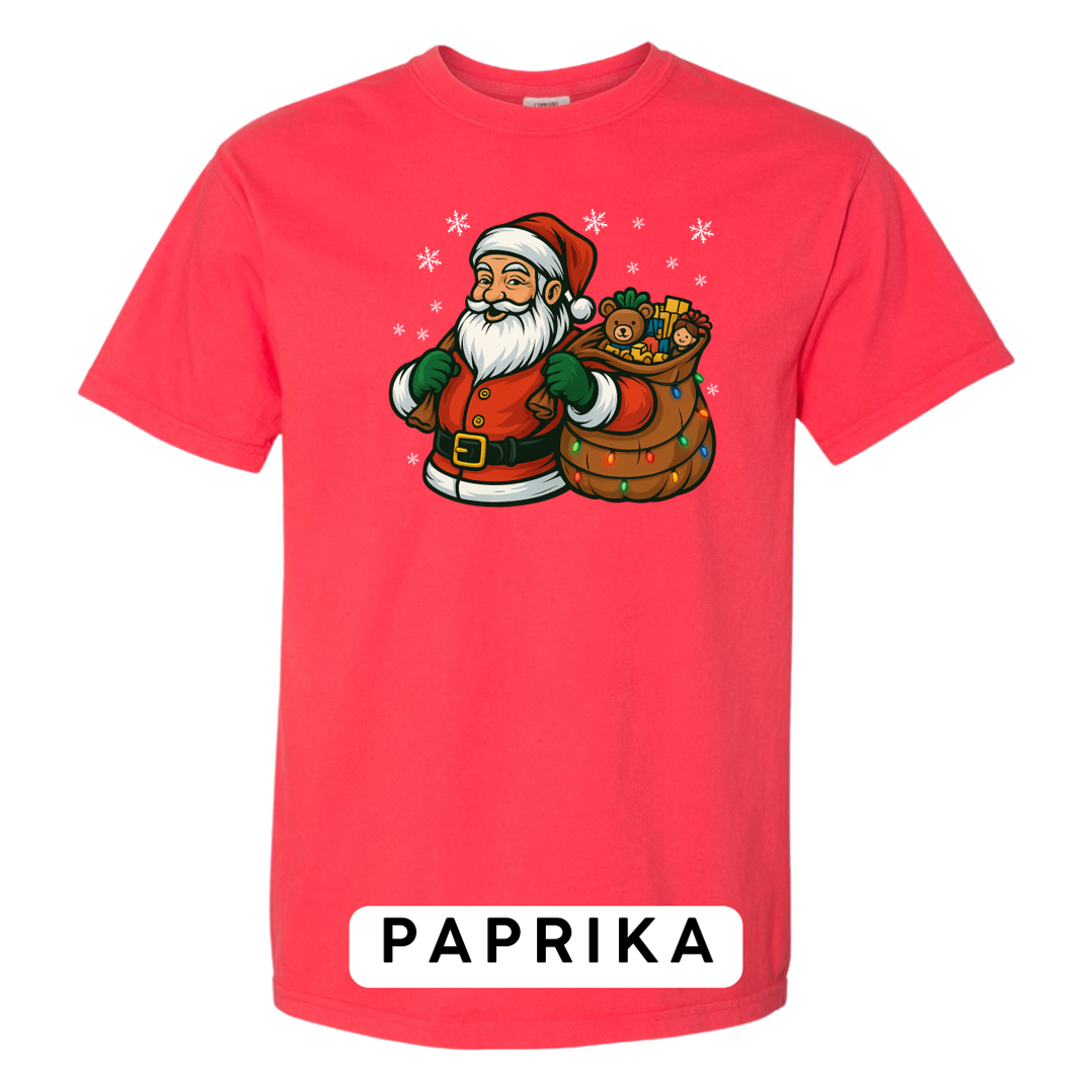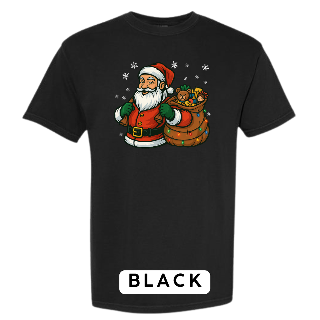 Celebrate the magic of the season with this classic Santa Claus design! Featuring Santa in his vibrant red suit with green gloves, carrying a toy-filled bag wrapped in colorful Christmas lights, this festive artwork is sure to spread joy wherever you go. Snowflakes gently falling around him add the perfect touch of holiday cheer.