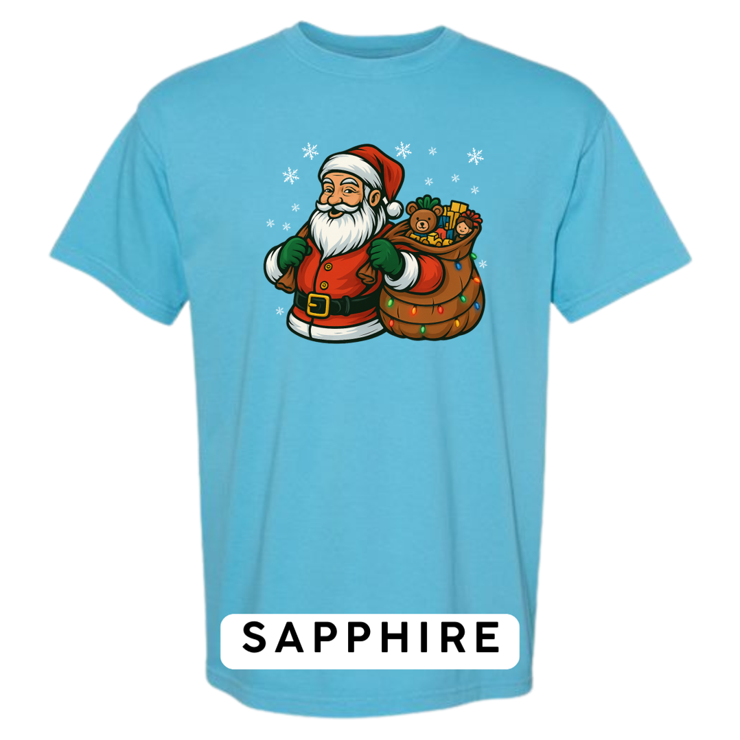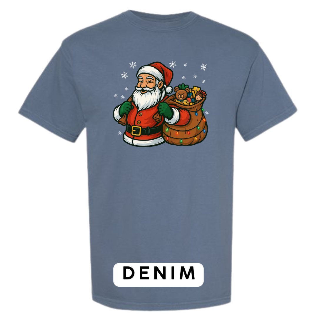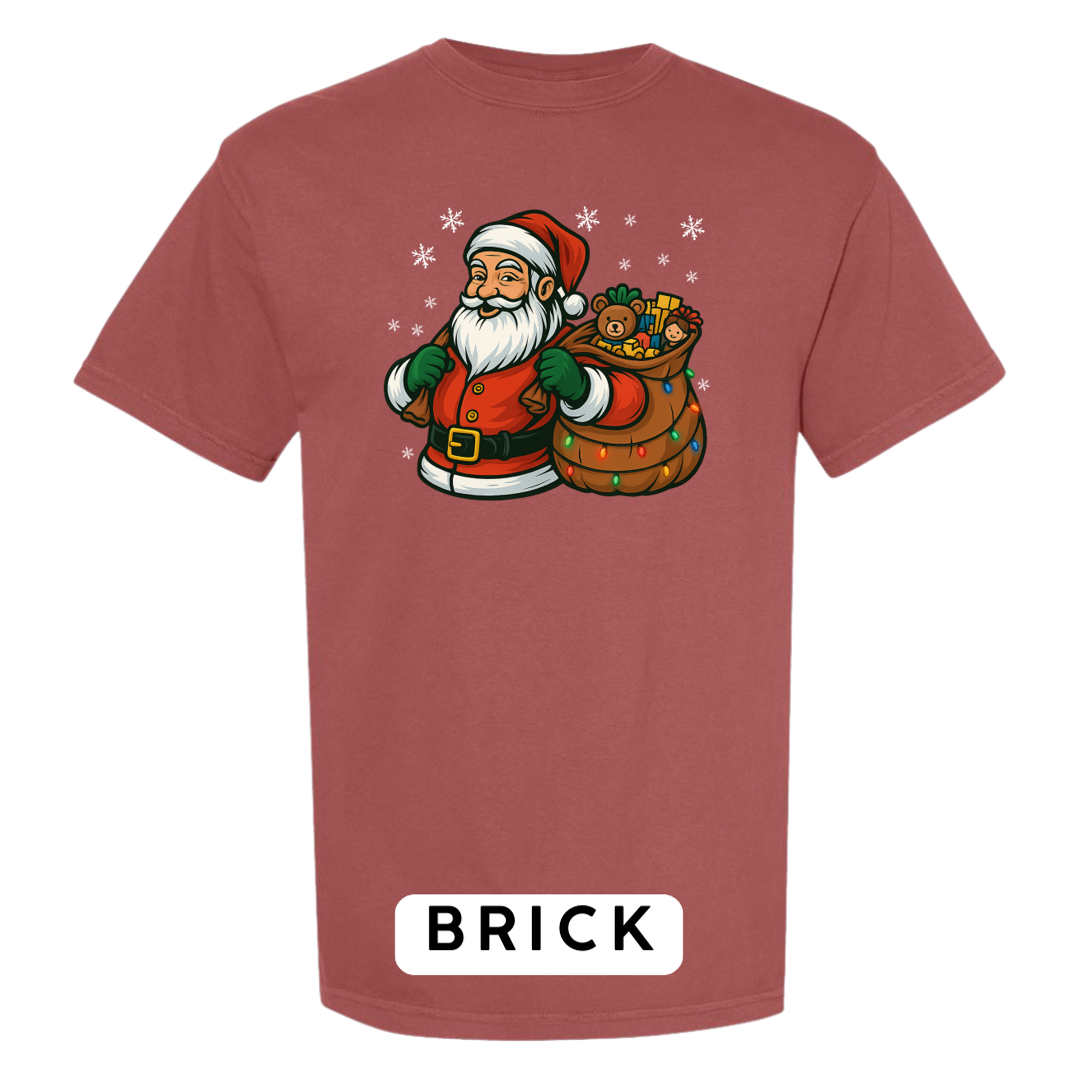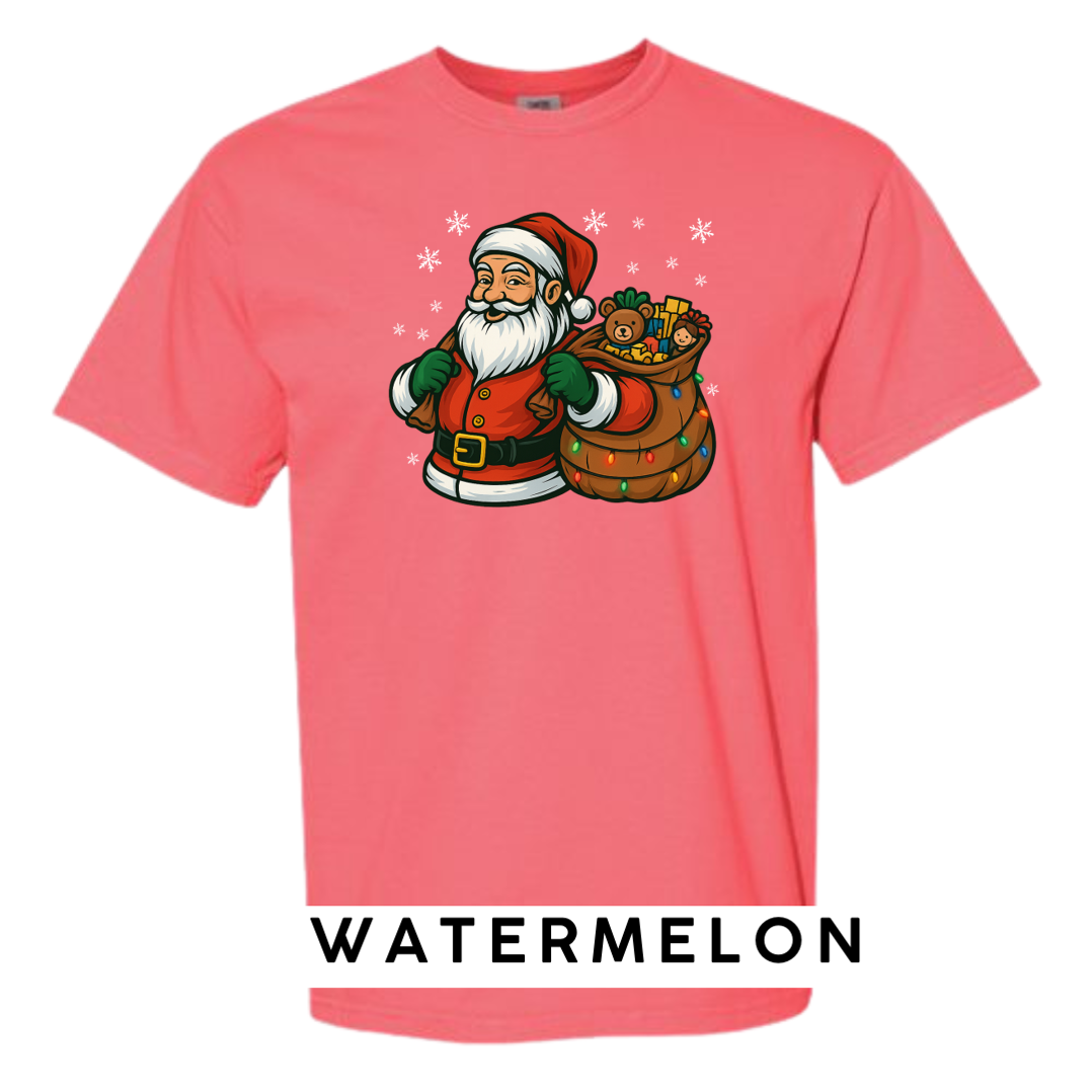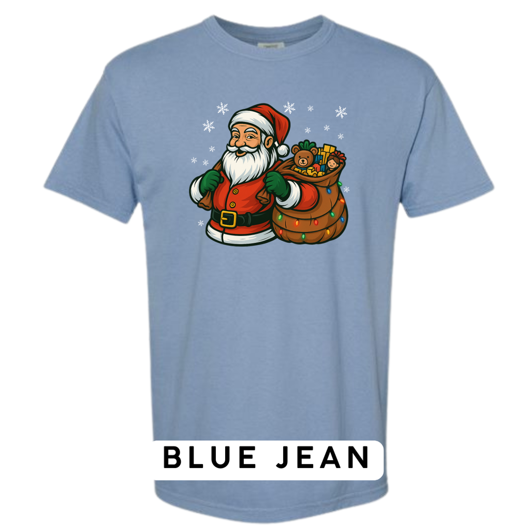 Celebrate the magic of the season with this classic Santa Claus design! Featuring Santa in his vibrant red suit with green gloves, carrying a toy-filled bag wrapped in colorful Christmas lights, this festive artwork is sure to spread joy wherever you go. Snowflakes gently falling around him add the perfect touch of holiday cheer.