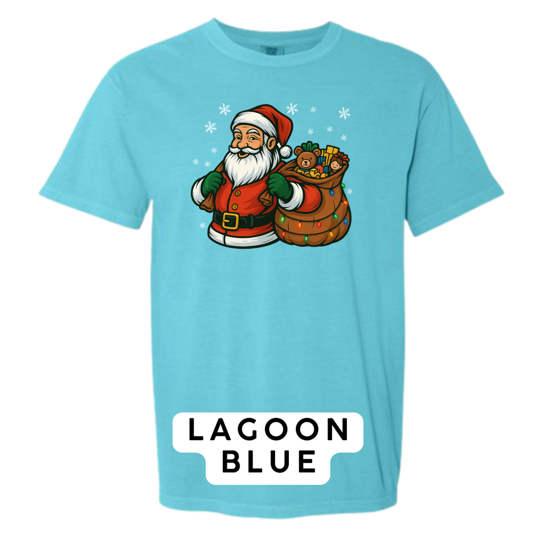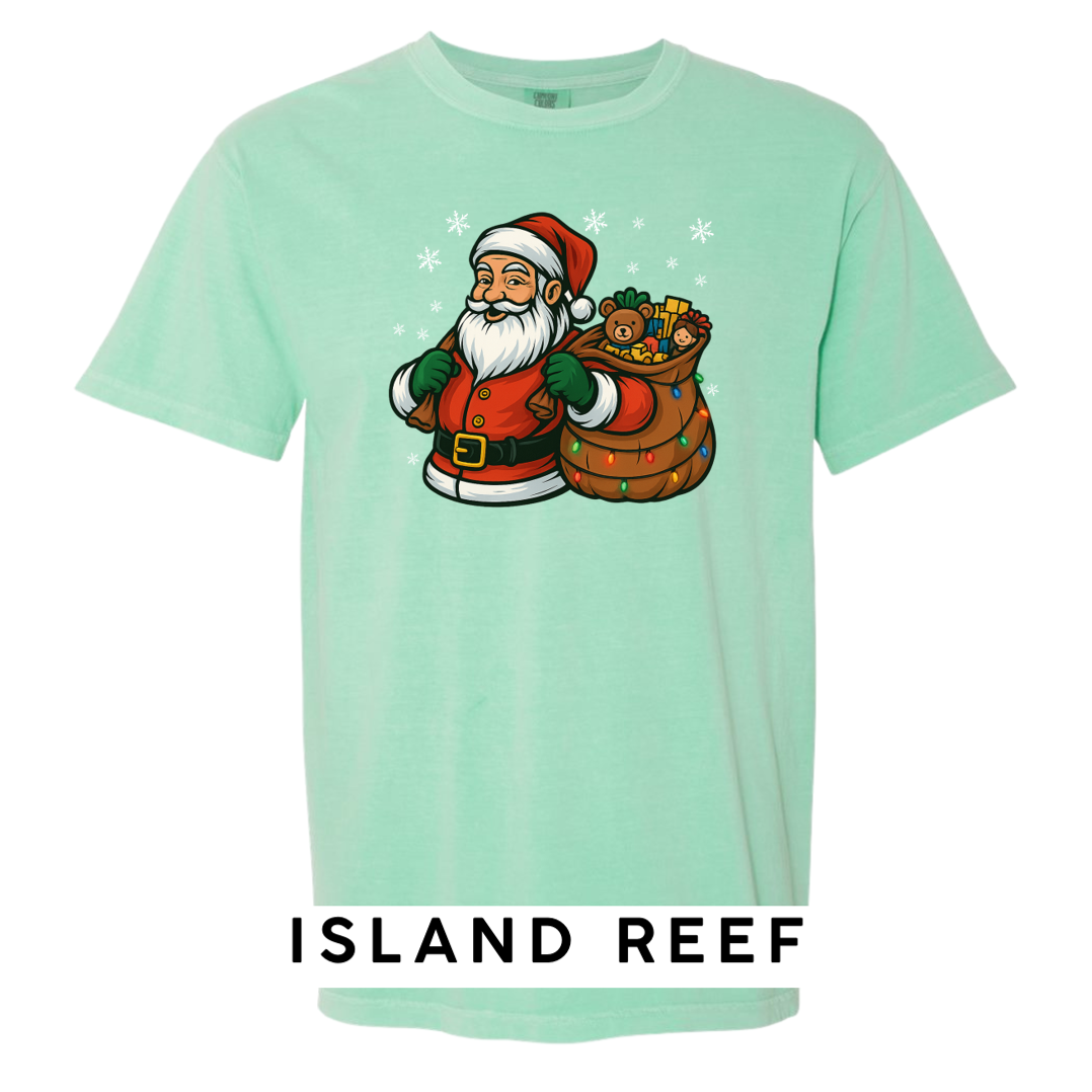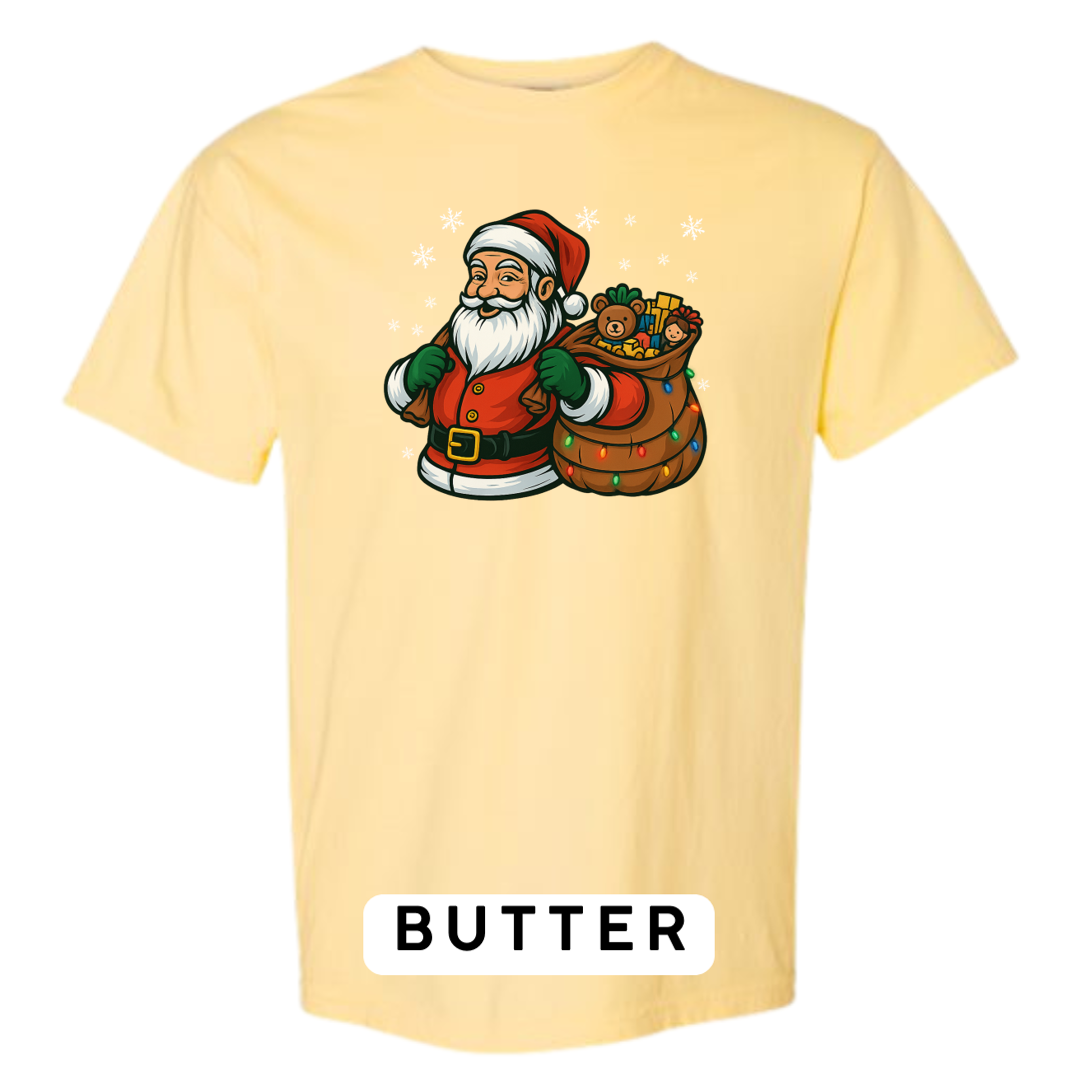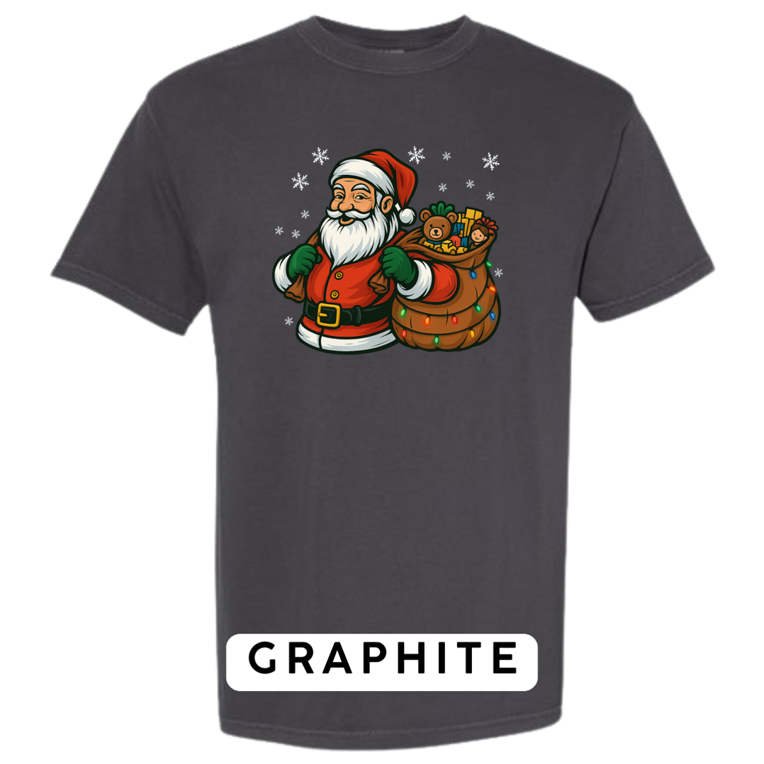 Celebrate the magic of the season with this classic Santa Claus design! Featuring Santa in his vibrant red suit with green gloves, carrying a toy-filled bag wrapped in colorful Christmas lights, this festive artwork is sure to spread joy wherever you go. Snowflakes gently falling around him add the perfect touch of holiday cheer.