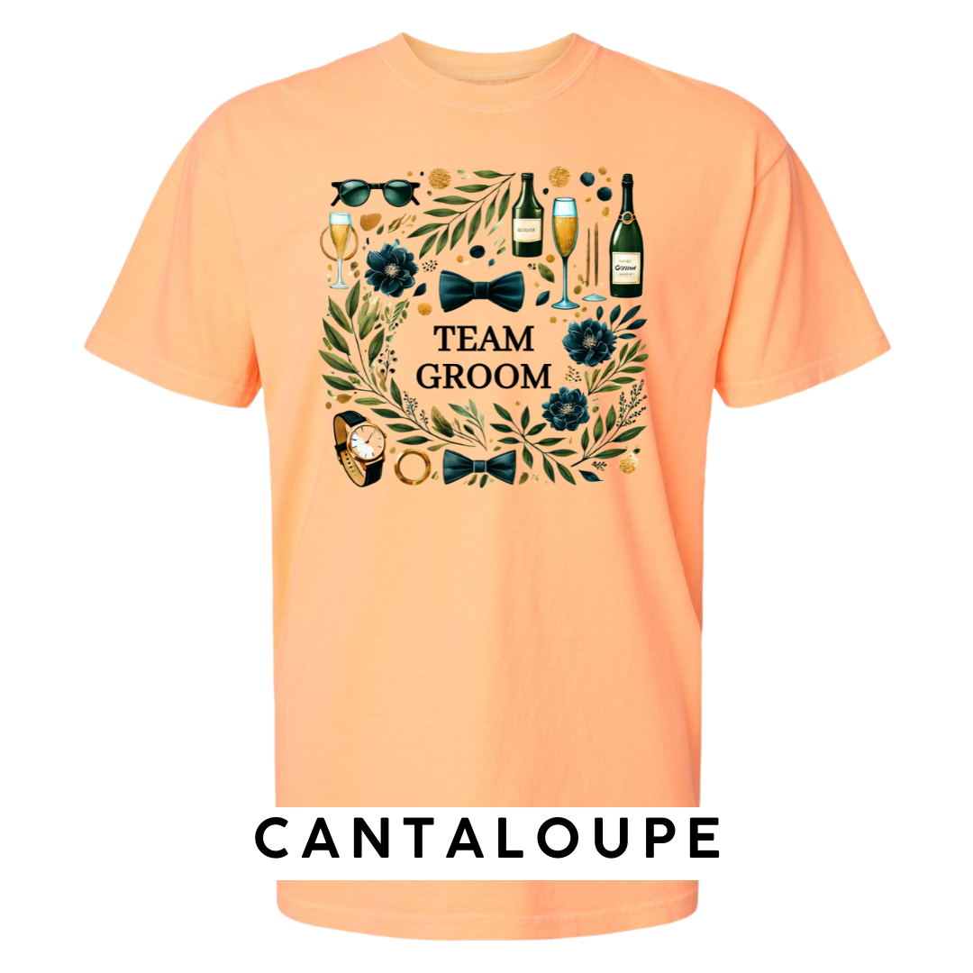 Raise a glass and suit up—because you’re officially on Team Groom. This stylish, floral-accented graphic tee is designed for the gents who show up with class, charm, and a little champagne in hand. With elegant illustrations of sunglasses, watches, champagne bottles, and navy-toned florals, this shirt is the perfect blend of modern sophistication and celebratory flair.