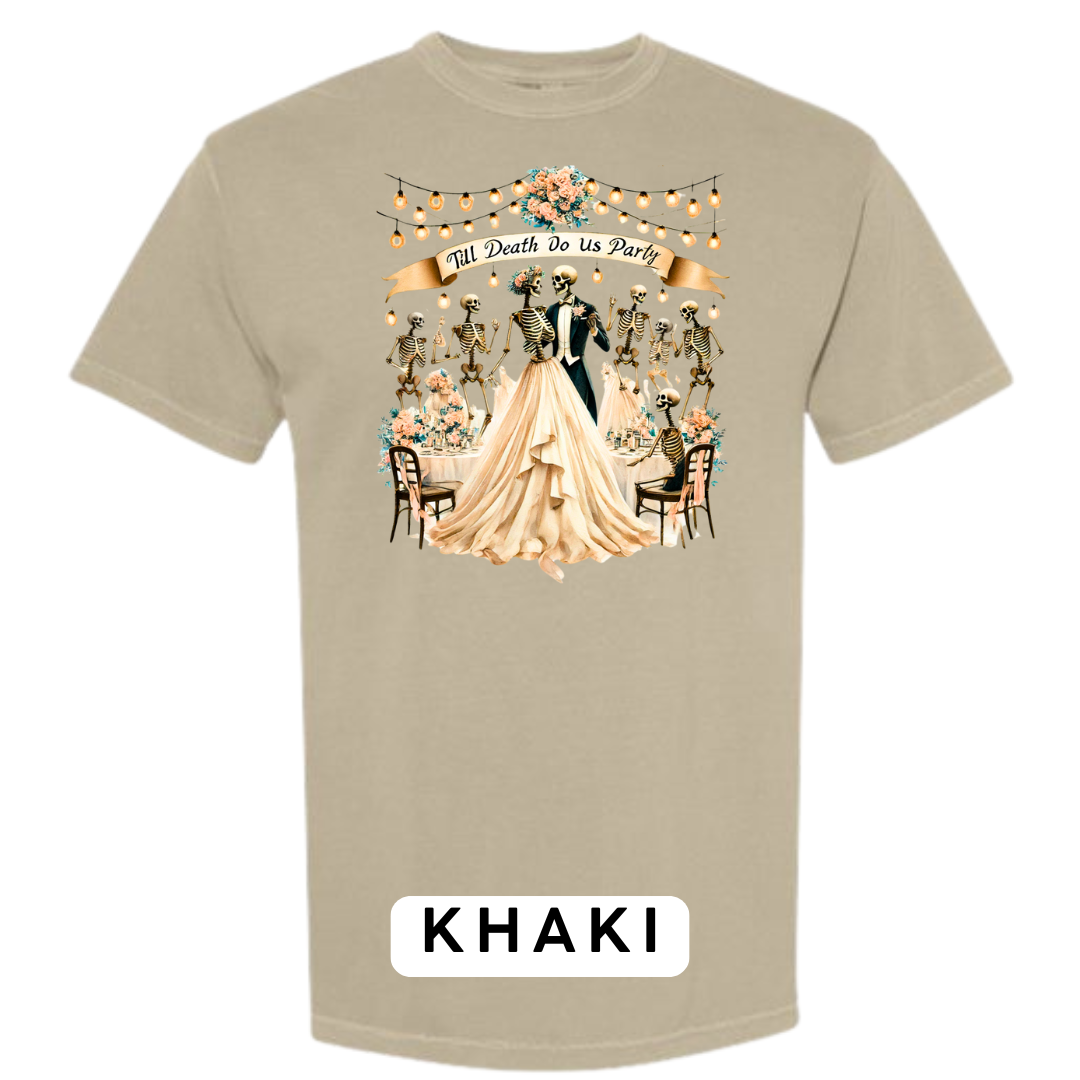 Love never dies—and neither does the vibe. The Till Death Do Us Party Graphic Tee is for the romantic rebels, spooky souls, and eternal lovers who know how to throw down on the other side. Featuring a hauntingly elegant skeleton couple in wedding attire surrounded by their ghoulish guests, this design is a celebration of forever love and unforgettable nights.